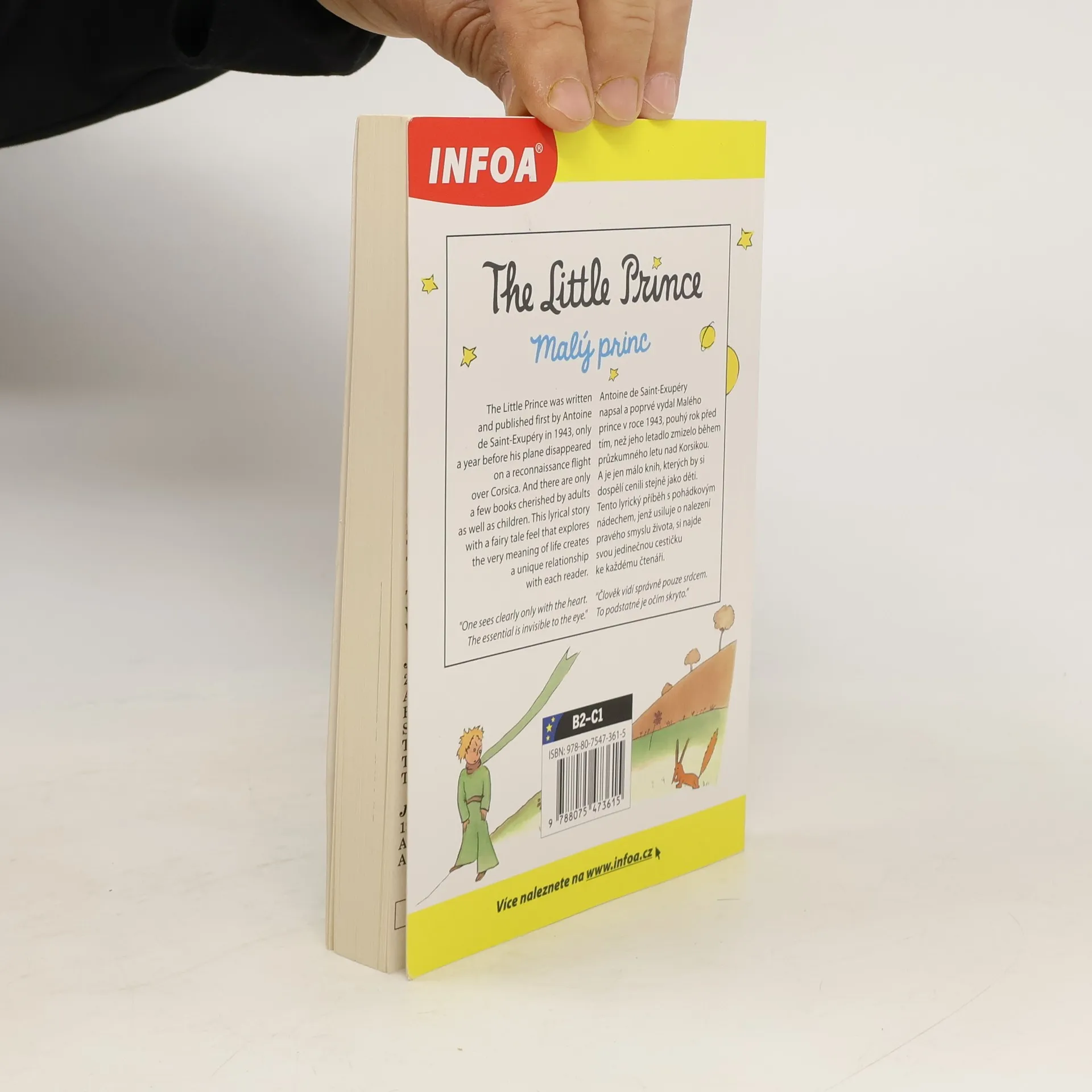 Dvojjazyčná kniha pro pokročilé. Anglicko-český zrcadlový text Jazyková úroveň B2-C1. Antoine de Saint-Exupéry napsal a poprvé vydal Malého prince v roce 1943, pouhý rok před tím, než jeho letadlo zmizelo během průzkumného letu nad Korsikou. A je jen málo knih, kterých by si dospělí cenili stejně jako děti. Tento lyrický příběh s pohádkovým nádechem, jenž usiluje o nalezení pravého smyslu života, si najde svou jedinečnou cestičku ke každému čtenáři.