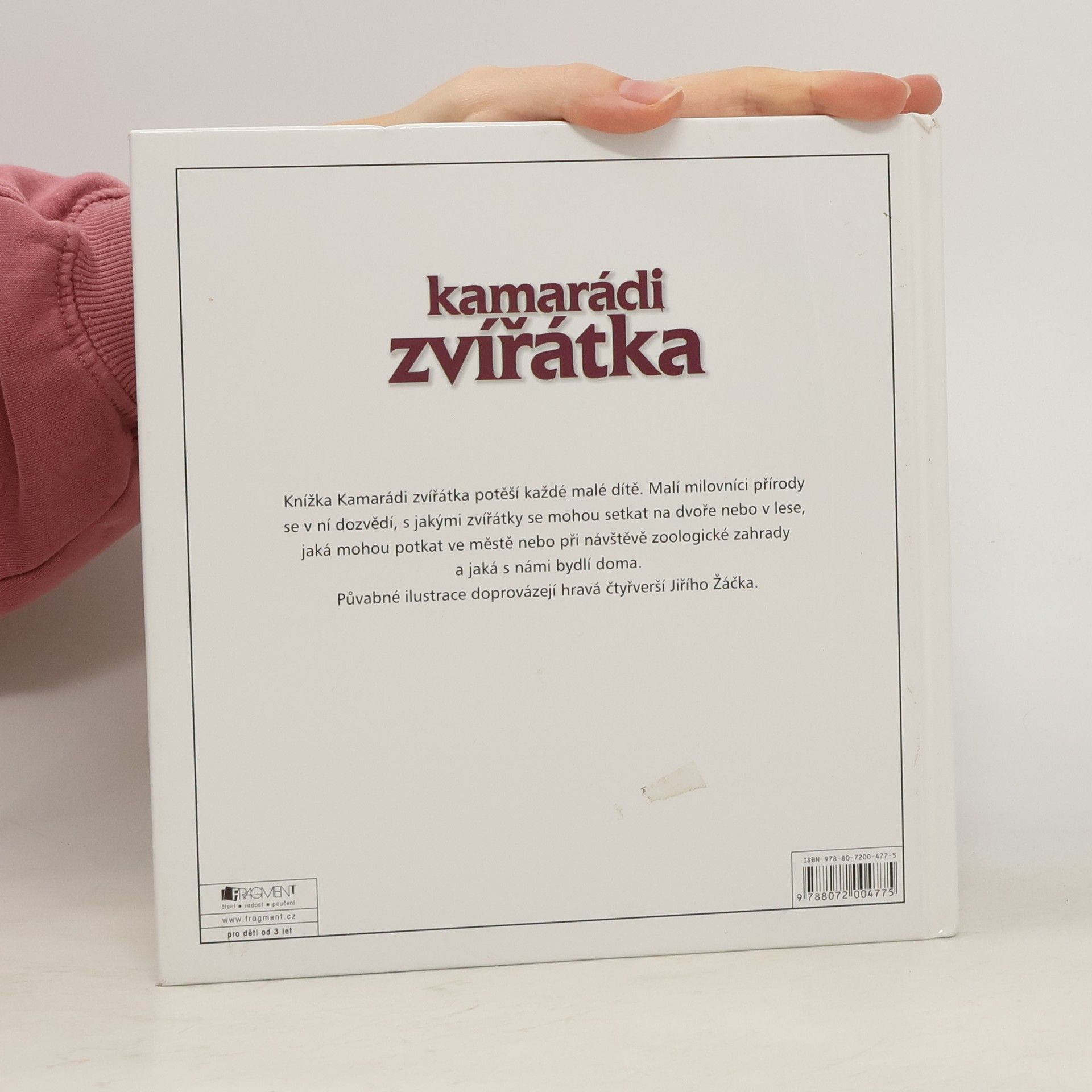 Knížka Kamarádi zvířátka potěší každé malé dítě. Malí milovníci přírody se v ní dozvědí, s jakými zvířátky se mohou setkat na dvoře nebo v lese, jaká mohou potkat ve městě nebo při návštěvě zoologické zahrady a jaká s námi bydlí doma. Půvabné ilustrace doprovázející hravá čtyřverší Jiřího Žáčka.
