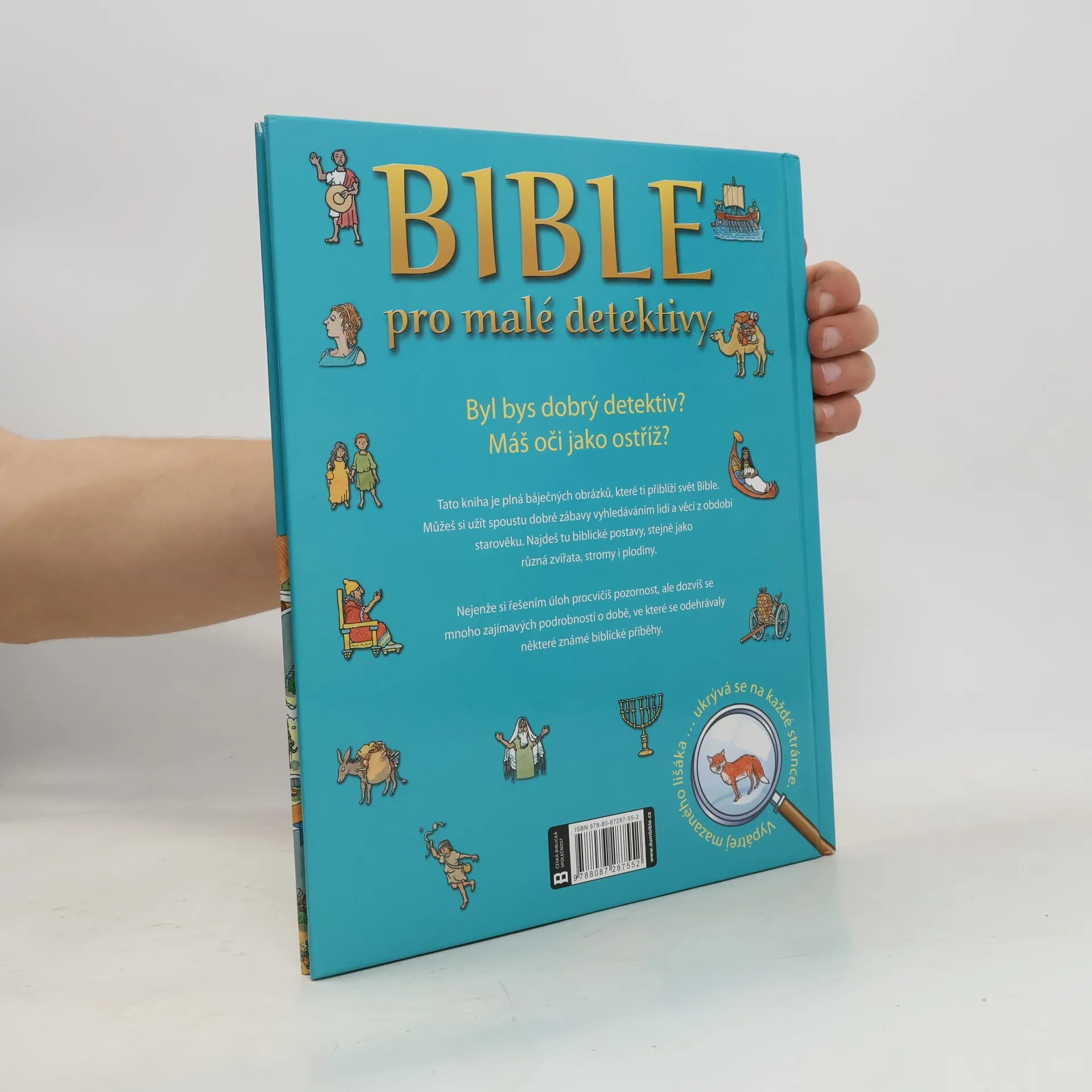 Bohatě ilustrovaná kniha přibližuje malým čtenářům vtipným způsobem svět Bible. Děti si mohou zahrát na detektivy a užijí si spoustu dobré zábavy vyhledáváním lidí, věcí, zvířat, stromů i různých plodin z období starověku na sedmnácti celostránkových obrázcích. Nejenže si řešením úloh procvičí pozornost, ale dozví se mnoho zajímavých podrobností o době, ve které se odehrávaly některé známé biblické příběhy. A navíc… na každé dvoustraně se skrývá mazaný lišák. Kdo jej najde na všech obrázcích, je opravdovým detektivem!