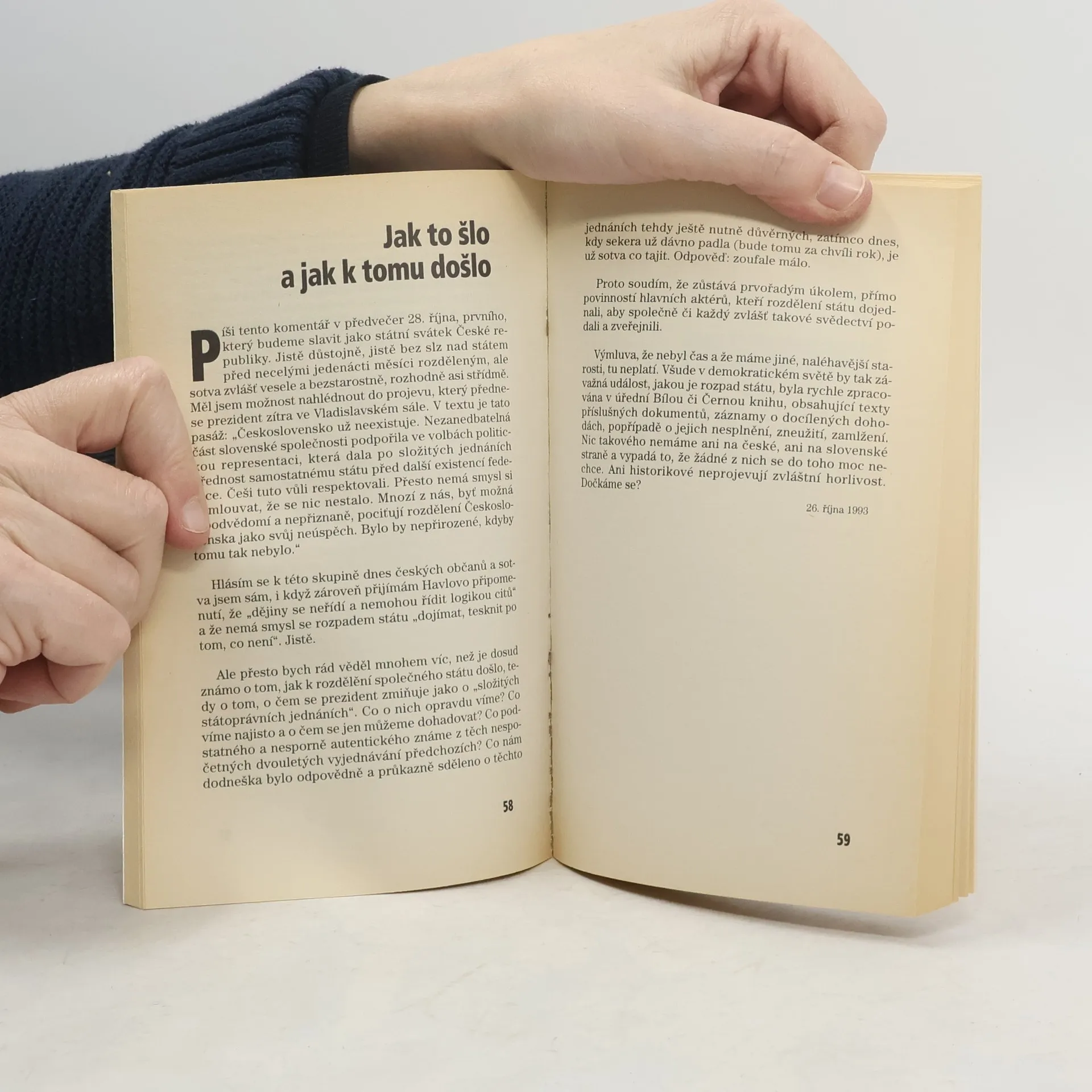 V červenci 1992 odstoupil Václav Havel ze své funkce prezidenta České a Slovenské Federativní Republiky. Měl jsem tu čest být osmnáct měsíců jedním z jeho poradců. Odešli jsme všichni z Hradu spolu s hlavou státu. Od té doby jsem se zase mohl plně věnovat novinaření, napsal jsem na dvě stě komentářů pro rozhlasovou stanici Svobodná Evropa, pro Radiofórum pražského Radiožurnálu a pro Lidové noviny. Zejména posluchači obou rozhlasových stanic mi často psali, že by si rádi přečetli, co jim na rádiových vlnách uniklo. To by ovšem nebyl dostatečný důvod k jejich knižnímu zpracování. Ale prolistování rukopisů ukázalo, že tyto komentáře k dosti dramatickým událostem let 1992-93 (počínajících právě Havlovou abdikací a vrcholících rozdělením státu) podávají celistvější obraz, než se mohlo zdát ve chvíli, kdy byly psány. Zároveň leckdy upomínají na problémy a otázky, které se nám stále vracejí a vyžadují vždy znovu naši pozornost. Je na čtenáři, aby posoudil, zda tomu tak je. Při redakci pro tento svazek jsem v původním textu nic neměnil, a to i tam, kde jsem se (jak se ukázalo) mýlil, leccos nedomyslel nebo přehnal. Vynechal jsem ty části, které se opakovaly. Z důvodů stylistických jsem pamatoval na to, že psané slovo, na rozdíl od mluveného, někdy vyžaduje větší úspornost. I v těchto případech, nepříliš četných, šlo o ryze kosmetický zásah do původního textu.