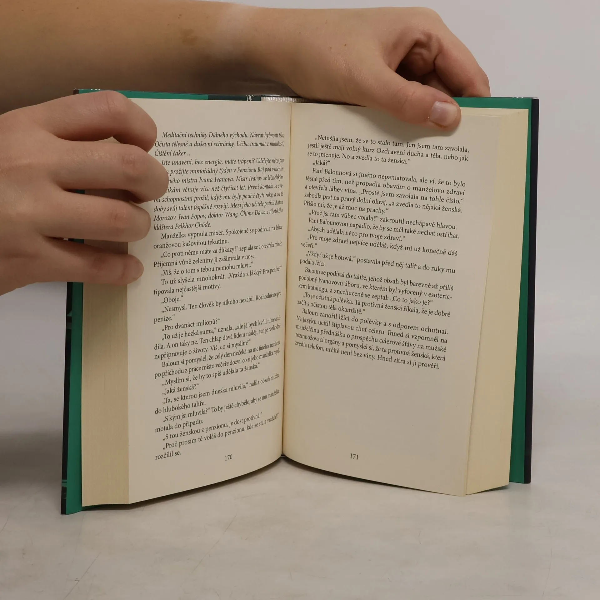 Spisovatelka Monika Hrubešová má pocit, že na ni padá celý svět. Vše jí přerůstá přes hlavu a ona si potřebuje odpočinout od starostí, mužů, publicity a především se musí vyrovnat s minulostí. Proto odjíždí do tichého penzionu kousek za Prahu, kde věhlasný ruský léčitel pořádá vyhlášené ozdravné kurzy. Skupinka kurzistů je sice zvláštní, stejně jako léčitel, ale i tak to vypadá na vydařený týden, tedy až do té doby, než se v sauně najde mrtvé tělo. Na první pohled se zdá, že jde o přirozenou smrt, ale brzy se ukáže, že jen někdo dobře maskoval stopy. Namísto relaxace a příjemných meditací tak na Moniku Hrubešovou čeká policejní vyšetřování a známá dvojice pražských kriminalistů, kapitán Baloun a nadporučík Jedlička.