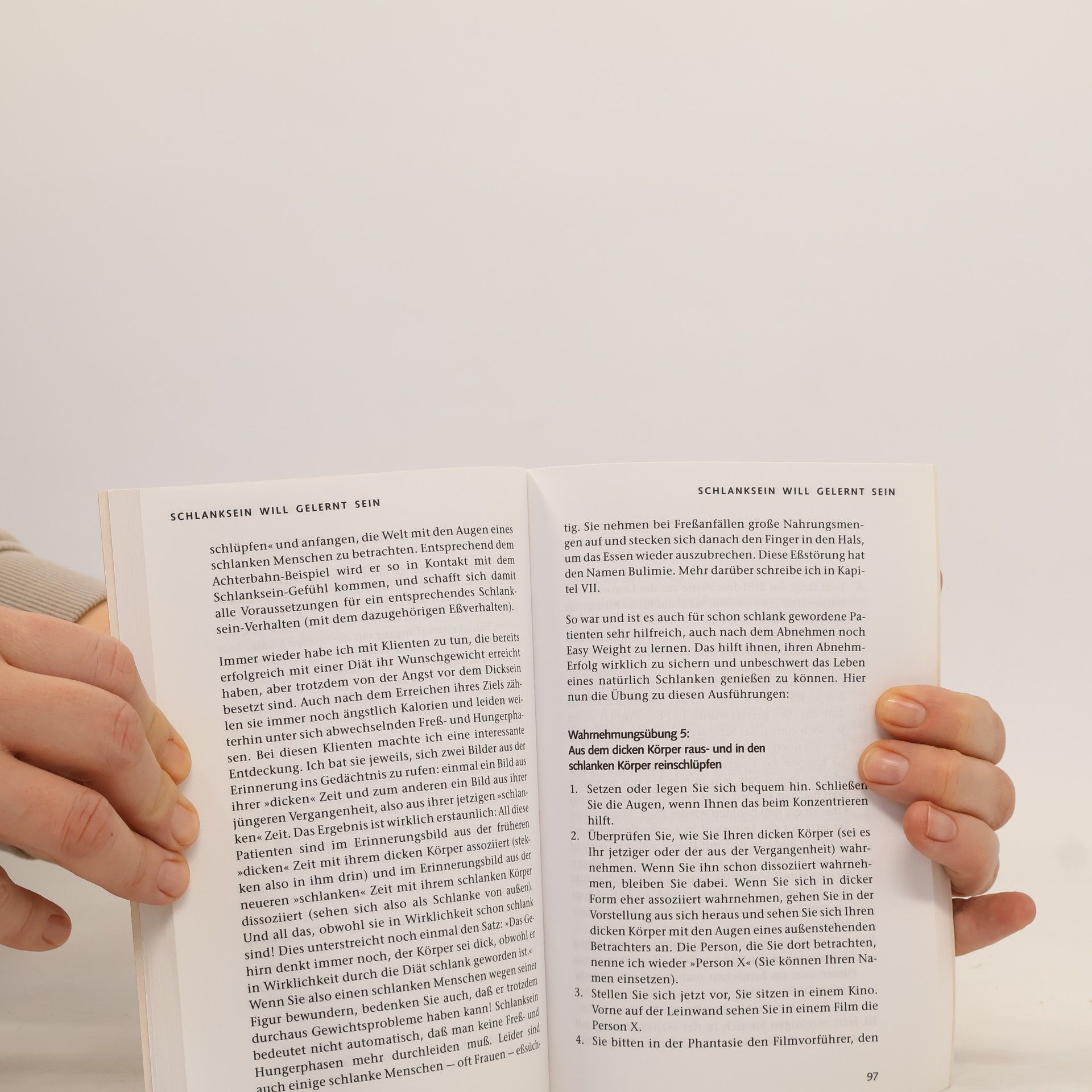 Wenn mit einer Diät in die fein abgestimmte Einheit von Körper und Seele des Menschen mit dem bewussten Verstand eingegriffen und der innere vegetative Plan missachtet wird, wehrt sich diese, z. B. mit Fressanfällen. Es ist deshalb problematisch, wenn Abnehmwillige ständig bewusst versuchen, ihre Nahrung zu reduzieren und Kalorien zu zählen. Vielmehr sollten sie bestrebt sein, ihre innere Wahrnehmung so zu verändern, dass das neue Gewicht ohne krampfhafte Kontrolle erhalten bleibt. Die Erstauflage dieses Buches erschien 1988. Damals war das Thema „Abnehmen beginnt im Kopf“ ein völlig neuer Ansatz. Inzwischen hat er eine breite Bestätigung erfahren - durch die Erfahrung vieler Betroffener und auch durch die Forschung.