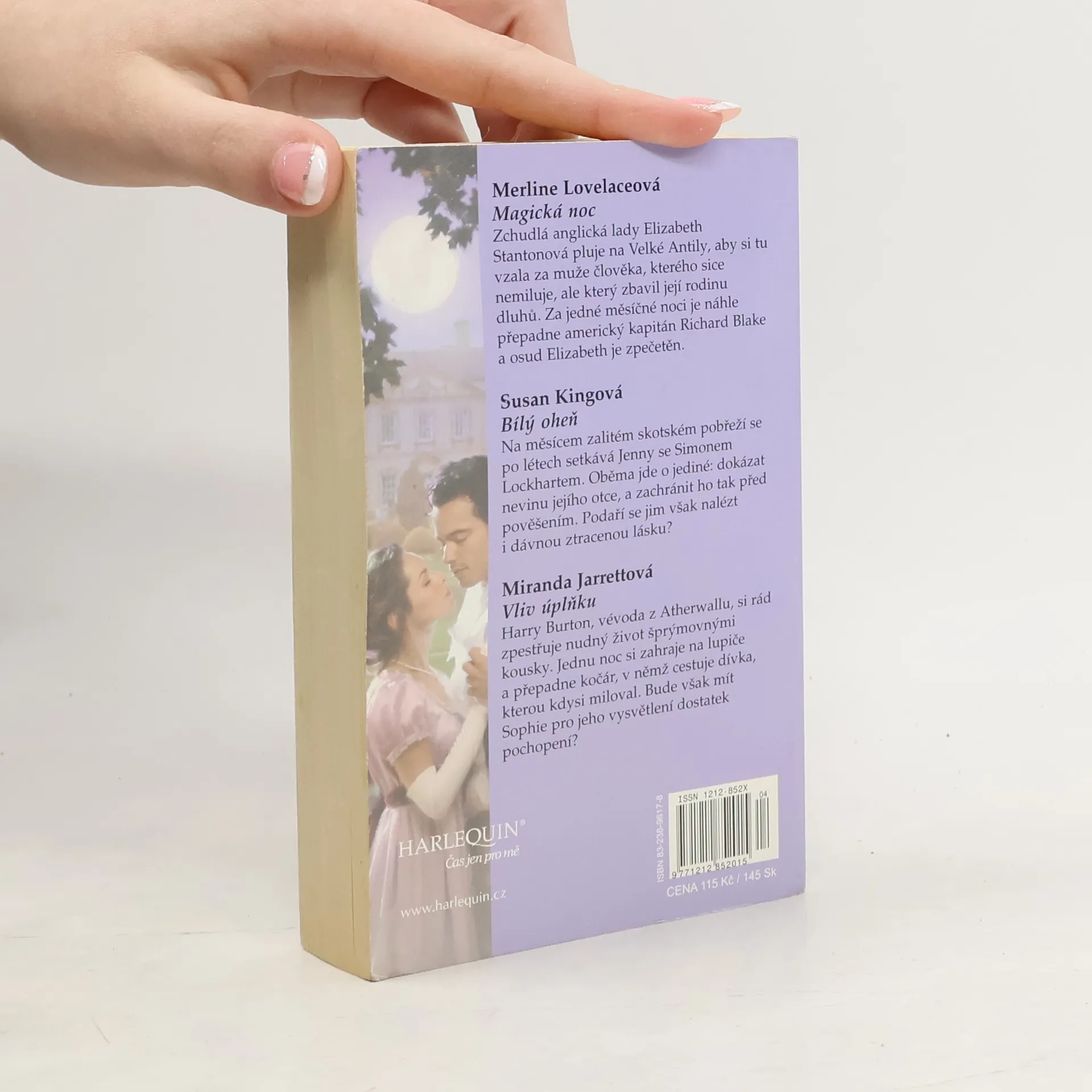 Kniha obsahuje tři romantické příběhy od oblíbených autorek. Merline Lovelaceová - Magická noc chudlá anglická lady Elizabeth Stantonová pluje na Velké Antily, aby si tu vzala za muže člověka, kterého sice nemiluje, ale který zbavil její rodinu dluhů. Za jedné měsíčné noci je náhle přepadne americký kapitán Richard Blake a osud Elizabeth je zpečetěn. Susan Kingová - Bílý oheň Na měsícem zalitém skotském pobřeží se po létech setkává Jenny se Simonem Lockhartem. Oběma jde o jediné: dokázat nevinu jejího otce, a zachránit ho tak před pověšením. Podaří se jim však nalézt i dávnou ztracenou lásku? Miranda jarrettová - Vliv úplňku Harry Burton, vévoda z Atherwallu, si rád zpestřuje nudný život šprýmovnými kousky. Jednu noc si zahraje na lupiče a přepadne kočár, v němž cestuje dívka, kterou kdysi miloval. Bude však mít Sophie pro jeho vysvětlení dostatek pochopení?