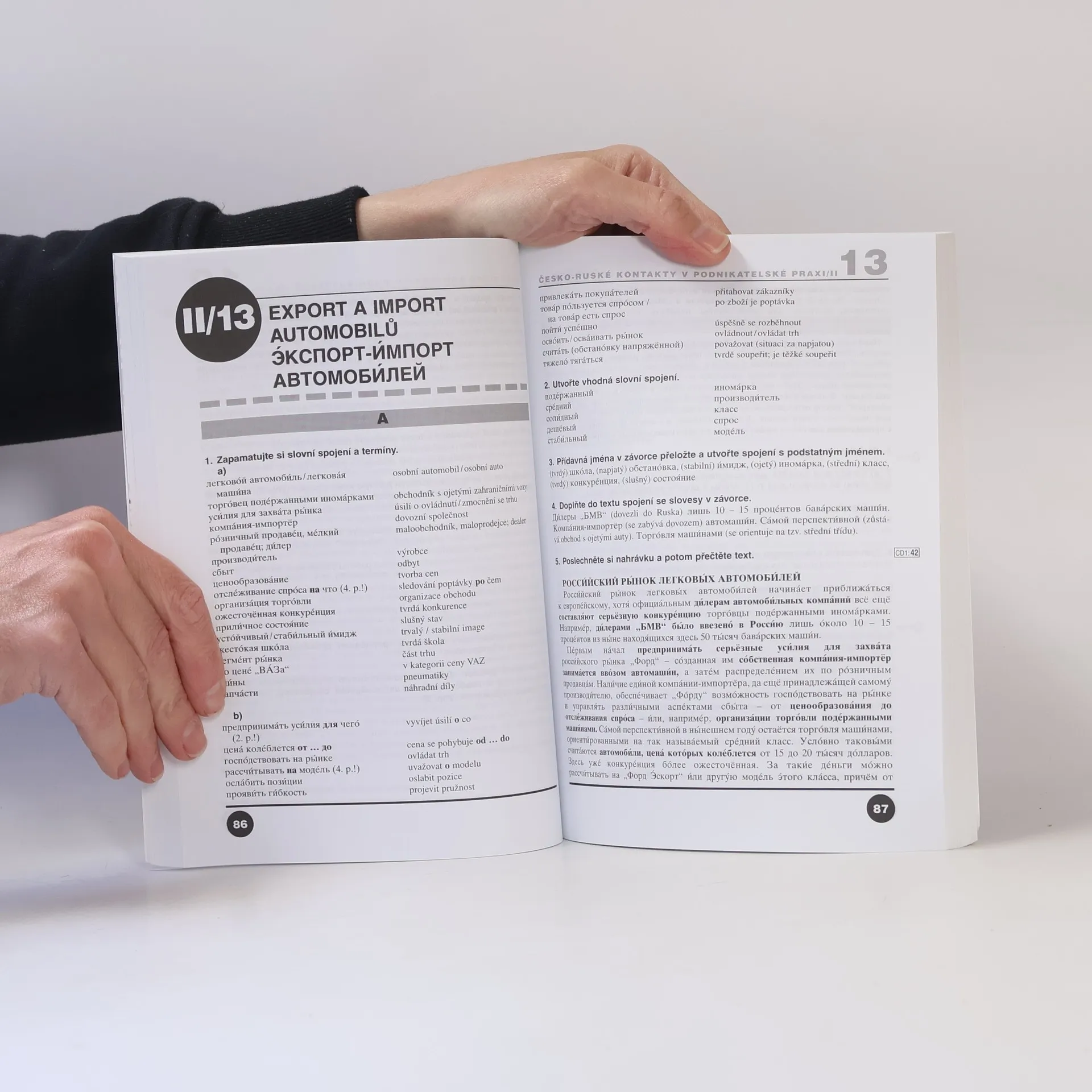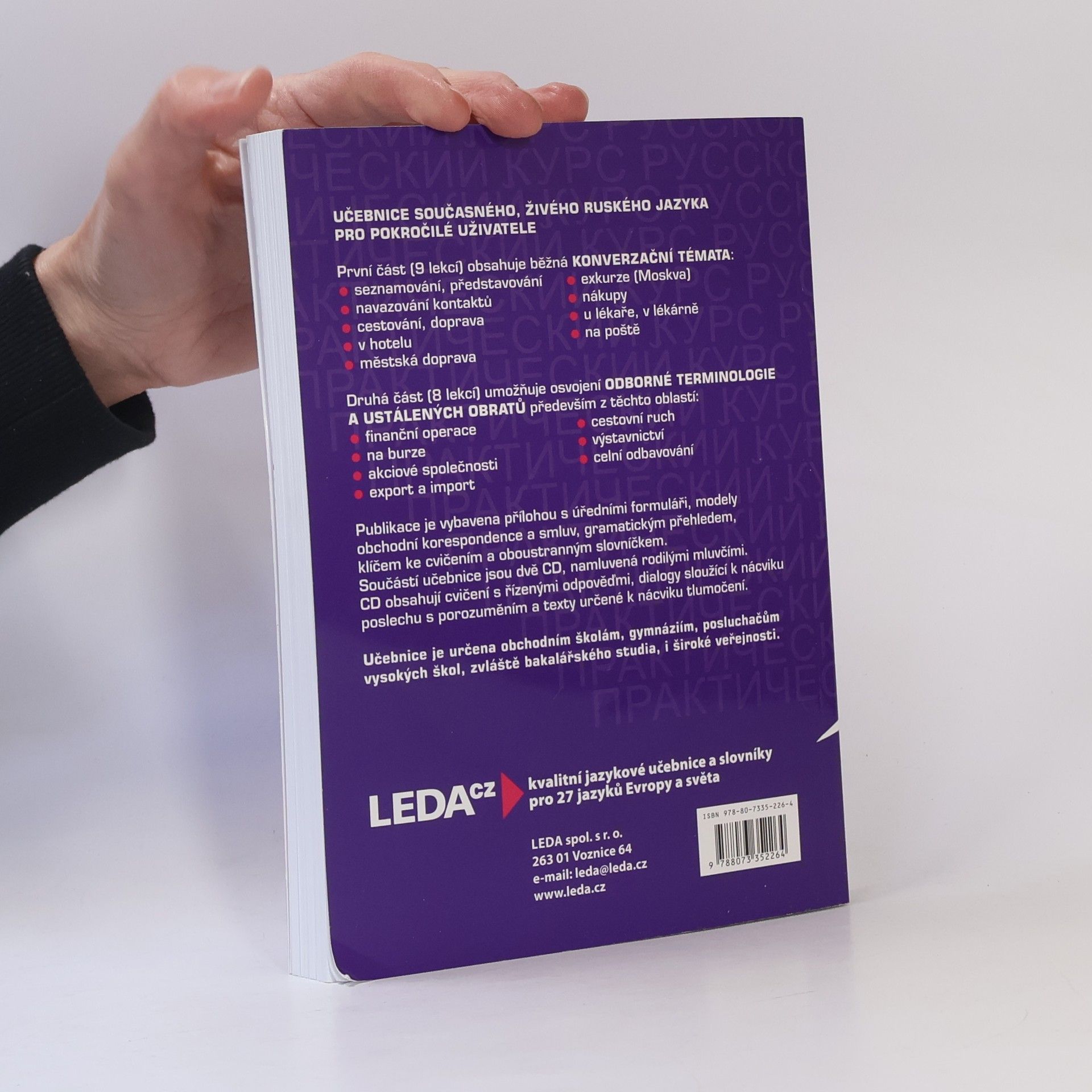 Ruština v praxi je učebnice současného, živého jazyka pro pokročilé uživatele. V prvních devíti lekcích se opakují běžné konverzační obraty potřebné při společenském styku, při seznamování, navazování kontaktů, při cestování, nákupech, návštěvě u lékaře apod. Dalších osm lekcí je zaměřeno na odbornou ruštinu v těchto tematických okruzích: peněžnictví, burza a obchod komoditami, akciové společnosti a jejich organizace, export a import, podnikání v cestovním ruchu, výstavnictví, celní kontrola. Kniha je doplněna ukázkami úředních formulářů, kapitolou o obchodní korespondenci a smlouvách, přehledem ruské mluvnice a skladby, rusko-českým a česko-ruským slovníkem a klíčem ke cvičením. Samostatně se vydává audionahrávka vybraných textů a cvičení. Učebnice je určena obchodním školám, gymnáziím, posluchačům vysokých škol, zvláště bakalářského studia, i široké veřejnosti