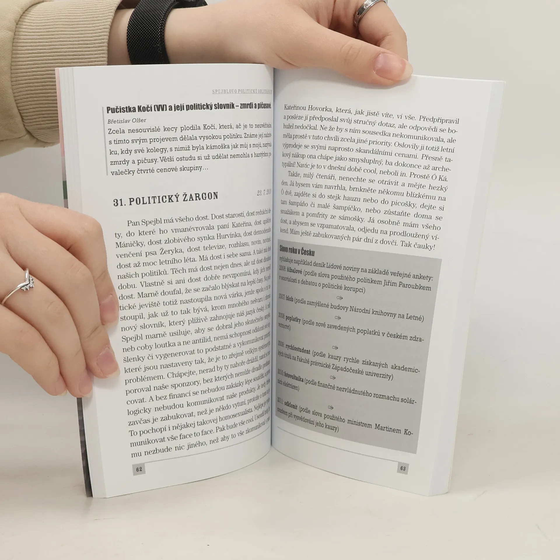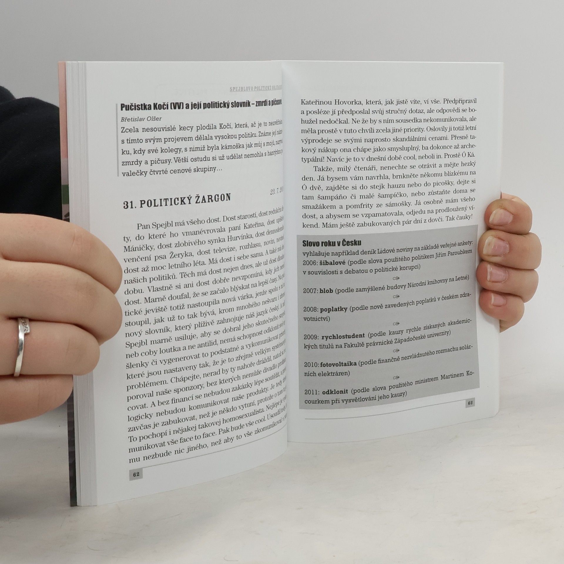 Politický a společenský život současnosti aneb jak to vidí Spejbl, Hurvínek a jejich dámské protějšky. Kniha obsahuje téměř 70 sloupků na nejrůznější témata, např.: Elita národa Sexy mozek Hurvínek jde na lup Šťabajzna se psem Tahle země není pro starý Papežovy kondomy Jak mazánek s kolibříkem spapali bonboniérku