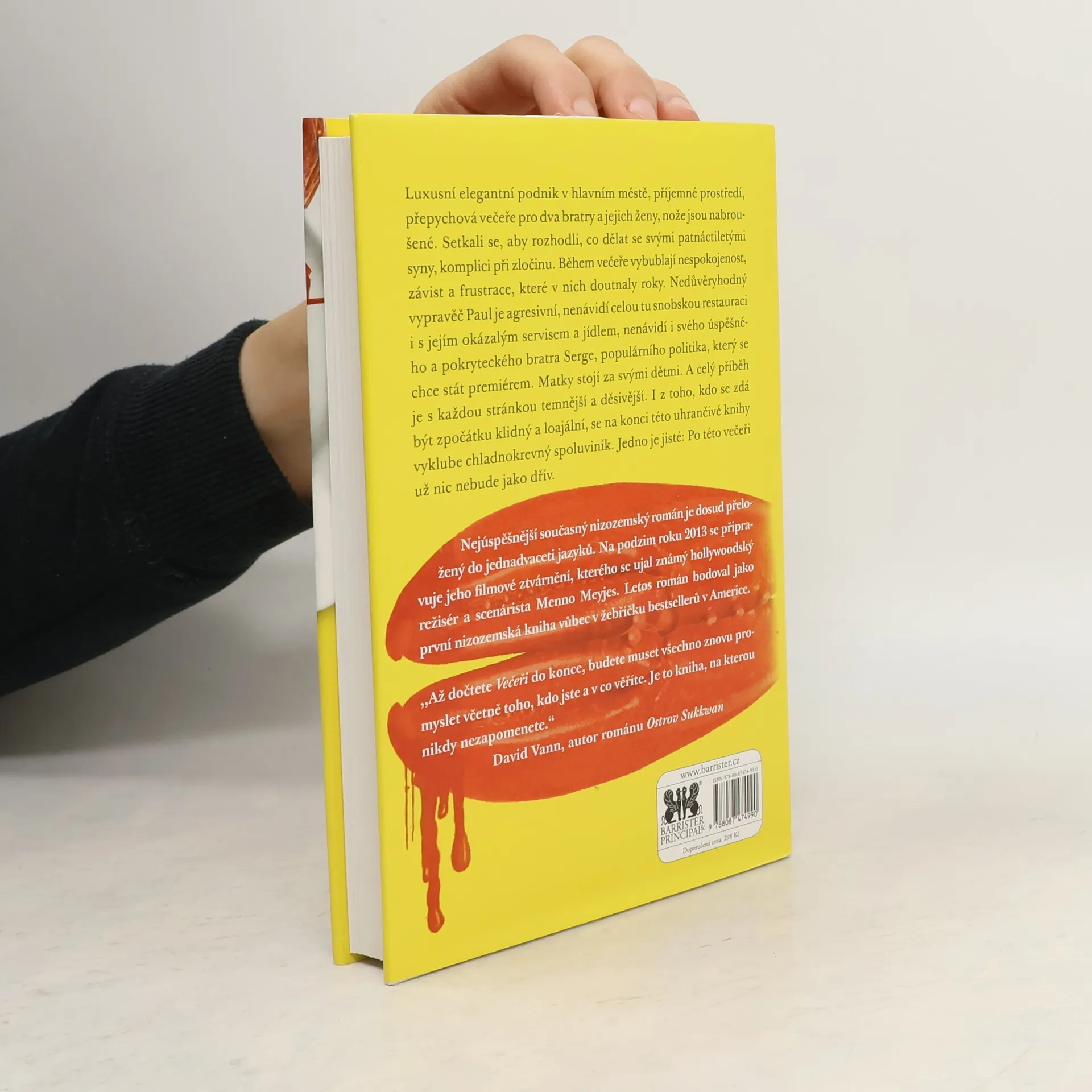 Luxusní elegantní podnik v hlavním městě, příjemné prostředí, přepychová večeře pro dva bratry a jejich ženy, nože jsou nabroušené. Setkali se, aby rozhodli, co dělat se svými patnáctiletými syny, komplici při zločinu. Během večeře vybublají nespokojenost, závist a frustrace, které v nich doutnaly roky. Nedůvěryhodný vypravěč Paul je agresivní, nenávidí celou tu snobskou restauraci i s jejím okázalým servisem a jídlem, nenávidí i svého úspěšného a pokryteckého bratra Serge, populárního politika, který se chce stát premiérem. Matky stojí za svými dětmi. A celý příběh je s každou stránkou temnější a děsivější. I z toho, kdo se zdá být zpočátku klidný a loajální, se na konci této uhrančivé knihy vyklube chladnokrevný spoluviník. Jedno je jisté: Po této večeři už nic nebude jako dřív.