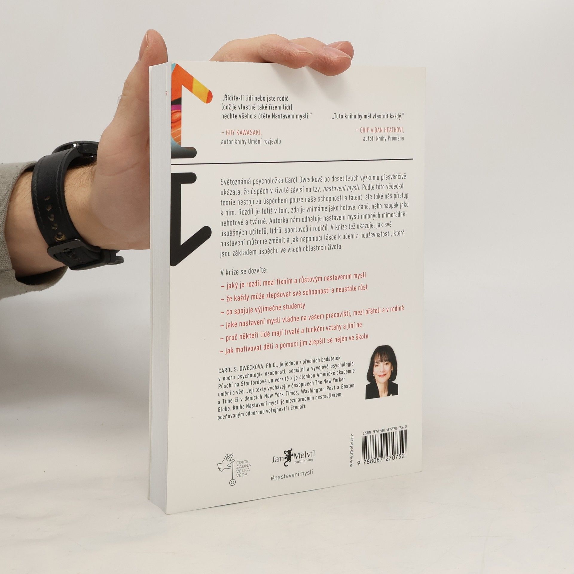 Kniha staví na jednoduché myšlence podložené desítkami let výzkumu: úspěch se rodí v naší hlavě. Profesorka Dwecková a její tým ze Stanfordské univerzity zjistili, že lidé přirozeně tíhnou ke dvěma typům myšlení – růstovému a fixnímu („growth mindset“ a „fixed mindset“). Převládající způsob myšlení zásadně ovlivňuje naši schopnost dosáhnout úspěchu. Autorka však přináší nadějný závěr: i když máme určité sklony, můžeme je během života změnit a využít svůj potenciál naplno. Jak se tyto dva přístupy projevují? Fixní myšlení vede k tomu, že se lidé před překážkami vzdávají, nedokážou přijímat zpětnou vazbu, cítí se ohroženi úspěchem ostatních, vyhýbají se výzvám a mají negativní postoj k úsilí. Naopak růstové myšlení podporuje vytrvalost, pozitivní vztah ke kritice a vnímá úsilí jako cestu k mistrovství, přičemž úspěch druhých slouží jako inspirace. Dwecková v knize ukazuje, jak se naučit myslet růstově a rozvinout svůj potenciál.