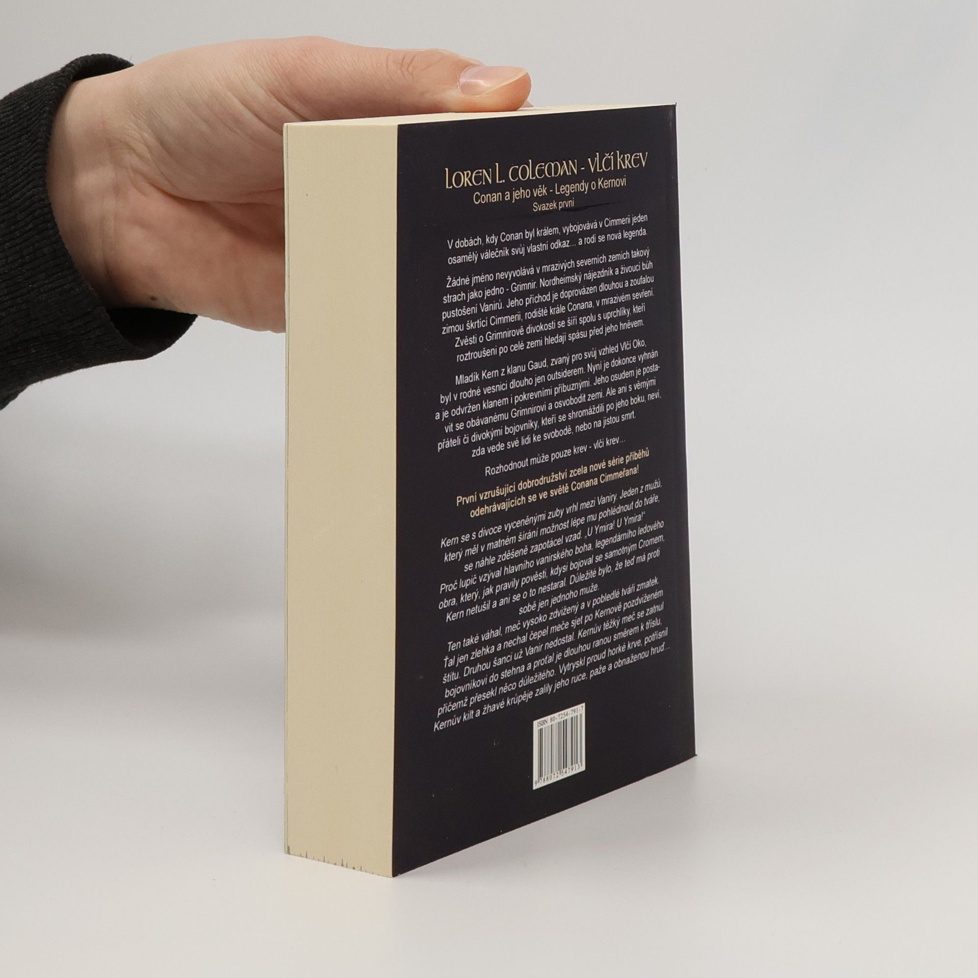 V dobách, kdy Conan byl králem, vybojovává v Cimmerii jeden osamělý válečník svůj vlastní odkaz… a rodí se nová legenda. Žádné jméno nevyvolává v mrazivých severních zemích takový strach jako jedno – Grimnir. Nordheimský nájezdník a živoucí bůh pustošení Vanirů. Jeho příchod je doprovázen dlouhou a zoufalou zimou škrtící Cimmerii, rodiště krále Conana, v mrazivém sevření. Zvěsti o Grimnirově divokosti se šíří spolu s uprchlíky, kteří roztroušeni po celé zemi hledají spásu před jeho hněvem. Mladík Kern z klanu Gaud, zvaný pro svůj vzhled Vlčí Oko, byl v rodné vesnici dlouho jen outsiderem. Nyní je dokonce vyhnán a je odvržen klanem i pokrevními příbuznými. Jeho osudem je postavit se obávanému Grimnirovi a osvobodit zemi. Ale ani s věrnými přáteli či divokými bojovníky, kteří se shromáždili po jeho boku, neví, zda vede své lidi ke svobodě, nebo na jistou smrt. Rozhodnout může pouze krev – vlčí krev… První vzrušující dobrodružství zcela nové série příběhů odehrávajících se ve světě Conana Cimmeřana!
