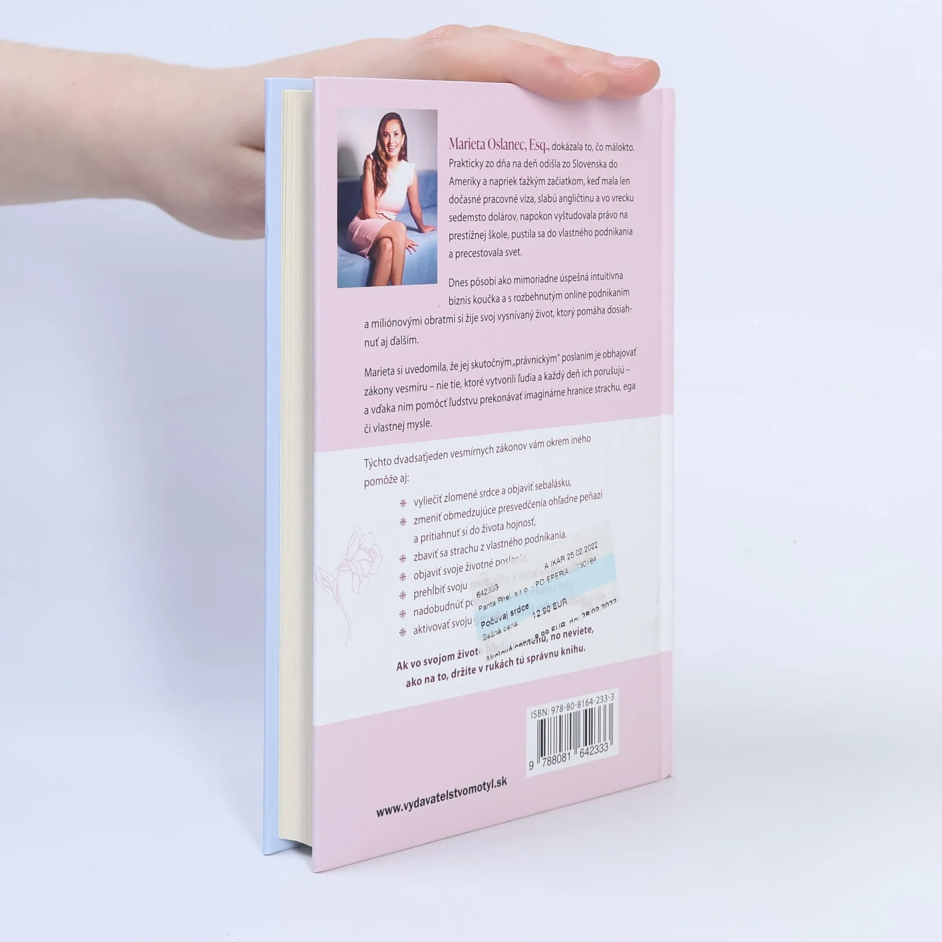 Marieta Oslanec, dokázala to, čo málokto. Zo dňa na deň odišla zo Slovenska do Ameriky a napriek ťažkým začiatkom, keď mala len dočasné pracovné víza, slabú angličtinu a vo vrecku sedemsto dolárov, napokon vyštudovala právo na prestížnej škole, pustila sa do vlastného podnikania a precestovala svet. Dnes pôsobí ako mimoriadne úspešná intuitívna biznis koučka a s rozbehnutým online podnikaním a miliónovými obratmi si žije svoj vysnívaný život, ktorý pomáha dosiahnuť aj ďalším. Marieta si uvedomila, že jej skutočným „právnickým" poslaním je obhajovať zákony vesmíru - nie tie, ktoré vytvorili ľudia a každý deň ich porušujú a vďaka nim pomôcť ľudstvu prekonávať imaginárne hranice strachu, ega či vlastnej mysle.