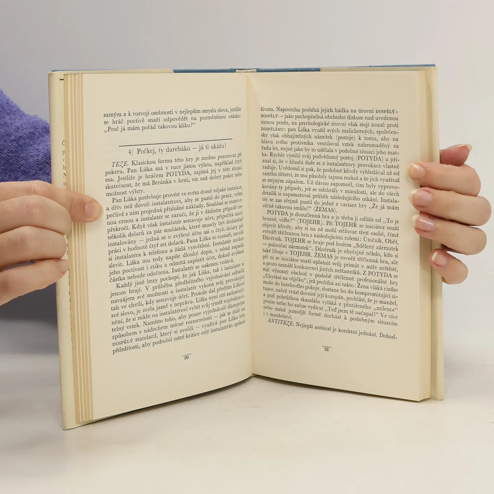 Originální plod amerického specialisty v sociální psychiatrii je utříděnou sbírkou velice výstižných popisů těch stereotypních mechanismů, které v člověkově chování slouží „jako náhrada za opravdové prožívání nefalšovaných důvěrných vztahů“. Autor dokázal spojit své odborné schopnosti s literárním nadáním, srozumitelným jazykem zvládl obtížnou tematiku a připravil tak četbu, v níž poučení a inteligentní zábava jsou neoddělitelné. Kniha byla klasifikována jako „první skutečně vědecké dílo z oboru psychologie všedního dne“. Kniha analyzuje originálním a názorným způsobem běžné situace mezilidských vztahů v rodině a v pracovním kolektivu.