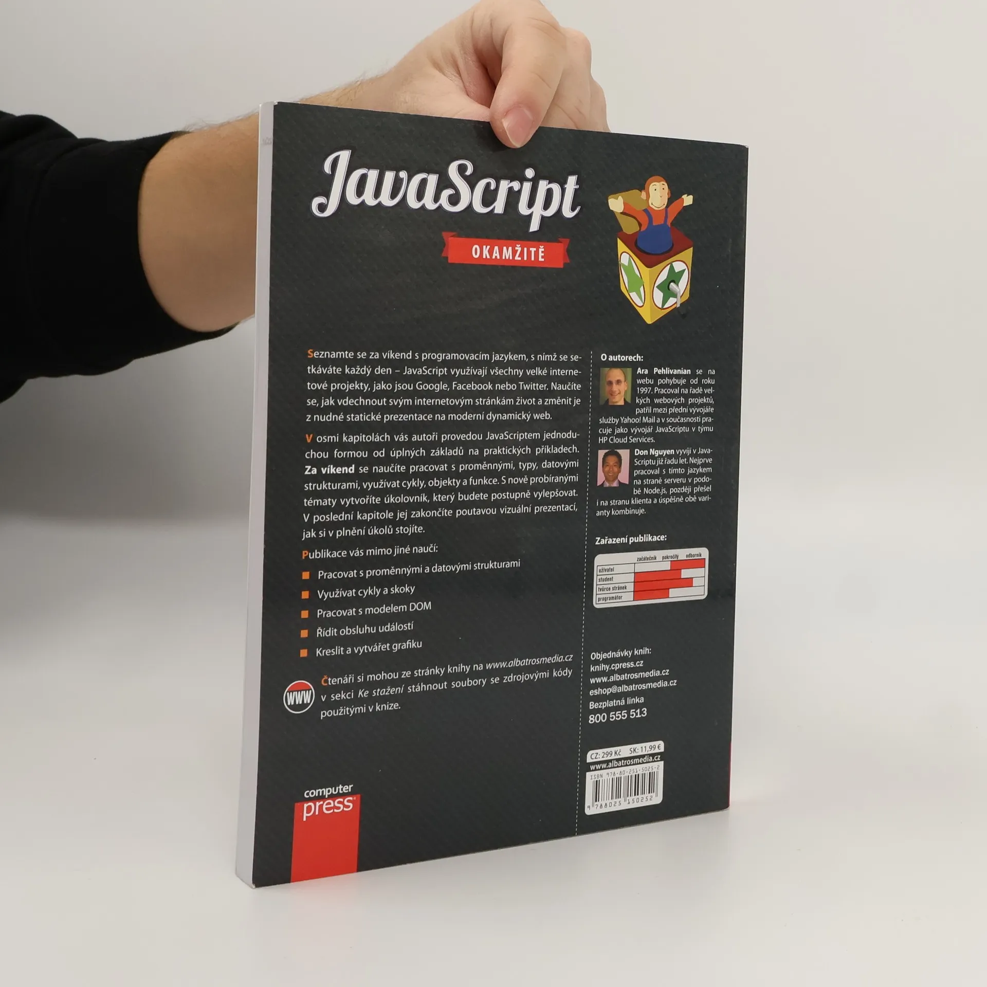 Seznamte se za víkend s programovacím jazykem, se kterým se setkáváte každý den – JavaScript využívají všechny velké internetové projekty, jako jsou Google, Facebook nebo Twitter. Naučíte se, jak vdechnout svým internetovým stránkám život a změnit je z nudné statické prezentace na moderní dynamický web. V osmi kapitolách vás autoři provedou JavaScriptem jednoduchou formou od úplných základů na praktických příkladech. Za víkend se naučíte pracovat s proměnnými, typy, datovými strukturami, využívat cykly, objekty a funkce. S nově probíranými tématy vytvoříte úkolovník, který budete postupně vylepšovat. V poslední kapitole jej doplníte o poutavou vizuální prezentaci, jak si v plnění úkolů stojíte.