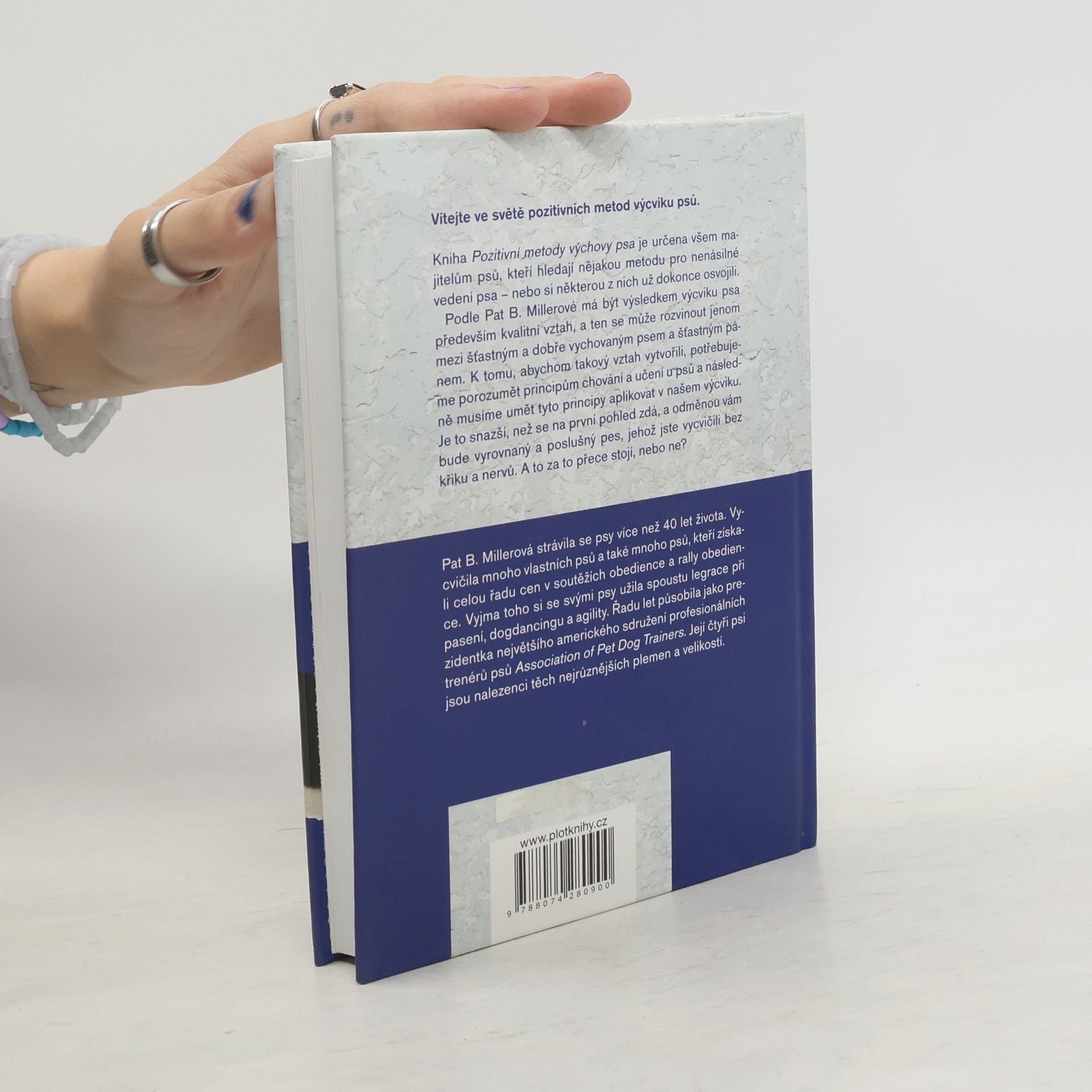 Vítejte ve světě pozitivních metod výcviku psů. Kniha je určena všem majitelům psů, kteří hledají nějakou metodu pro nenásilné vedení psa – nebo si některou z nich už dokonce osvojili. Podle Pat B. Millerové má být výsledkem výcviku psa především kvalitní vztah, a ten se může rozvinout jenom mezi šťastným a dobře vychovaným psem a šťastným pánem. K tomu, abychom takový vztah vytvořili, potřebujeme porozumět principům chování a učení u psů a následně musíme umět tyto principy aplikovat v našem výcviku. Je to snazší, než se na první pohled zdá, a odměnou vám bude vyrovnaný a poslušný pes, jehož jste vycvičili bez křiku a nervů. A to za to přece stojí, nebo ne? Pat B. Millerová strávila se psy více než 40 let života. Vycvičila mnoho vlastních psů a také mnoho psů, kteří získali celou řadu cen v soutěžích obedience a rally obedience. Vyjma toho si se svými psy užila spoustu legrace při pasení, dogdancingu a agility. Řadu let působila jako prezidentka největšího amerického sdružení profesionálních trenérů psů Association of Pet Dog Trainers. Její čtyři psi jsou nalezenci těch nejrůznějších plemen a velikostí.