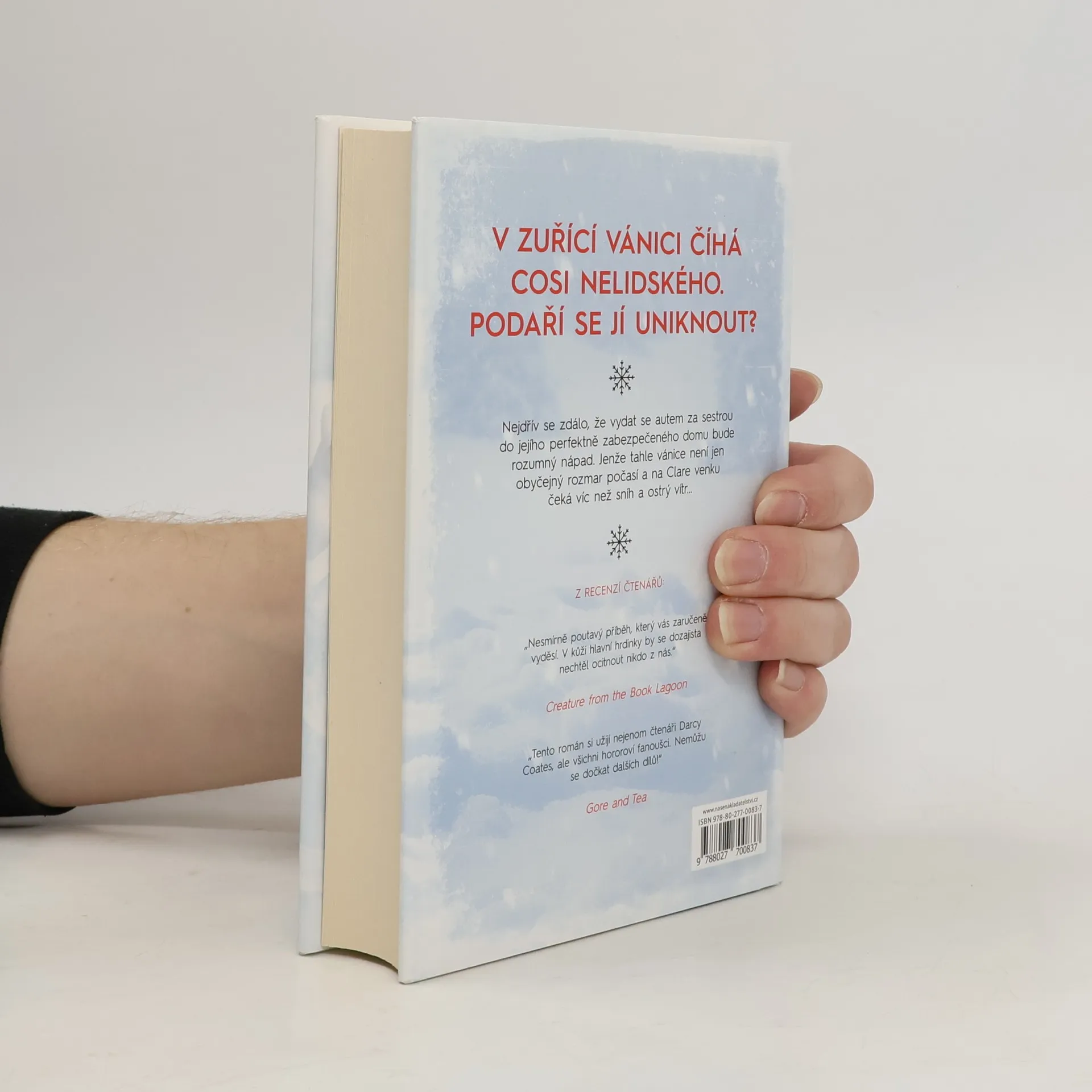 Clare si vybavila zimu. A opuštěná auta u krajnice, hračky poházené na silnici. Vybavila si nekonečnou vánici a hrůzu, kterou nedokázala vysvětlit. A pak už nic… Když se probudila, ležela celá rozbolavělá a vyděšená v prastarém, ponurém domě, připomínajícím spíše starodávné šlechtické sídlo. U postele seděl neznámý mladý muž a tvrdil, že měla ve vánici autonehodu. Našel ji a přinesl do svého domu. Clare by ze všeho nejraději utekla, ale je až příliš slabá a vánice za okny stále nepolevuje. Uvěznila je v domě a Clare nezbývá než čekat. Mladík se k ní chová mile, ale Clare si není jistá, nakolik mu může důvěřovat? On tvrdí, že jsou v domě sami, ale ona má pocit, že vidí a slyší věci, které naznačují, že kolem někdo slídí a čeká na příležitost. Napětí stále stoupá a s ním i pocit, že se z nich stala lovná zvěř. Clare dochází k závěru, že její nehoda nebyla náhodná. Venku za dveřmi na ni něco číhá, něco čeká, až opustí bezpečí kamenných zdí… něco strašného, nelidského a krutého.