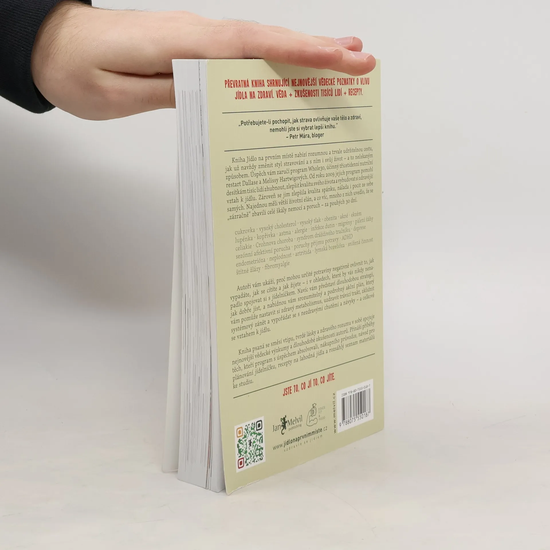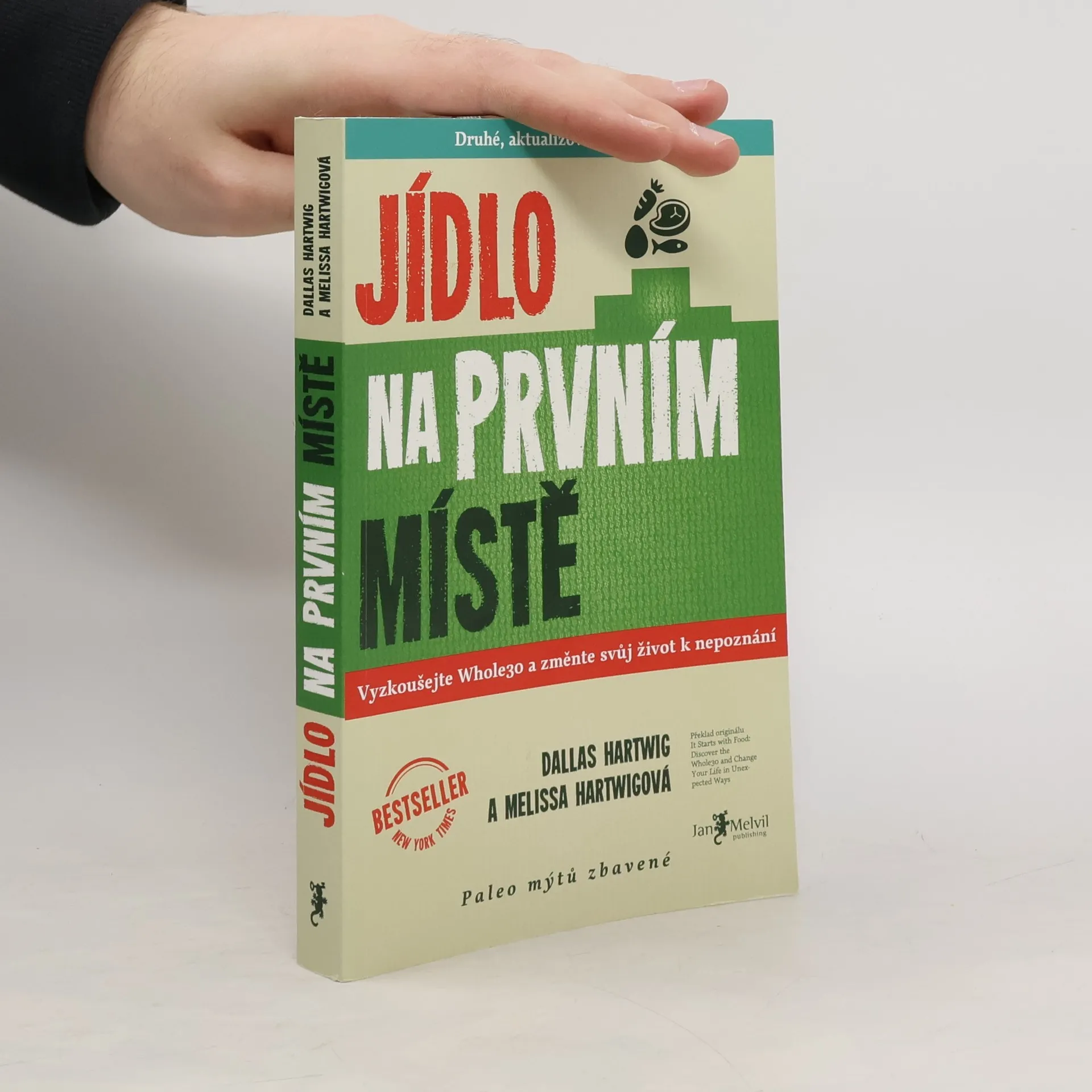 Jídlo na prvním místě není řadová kniha o paleodietě, tohle je Melvilem pečlivě zvolený vstupní titul nabízející skutečnou životní změnu. Že nemáte tušení, co to je paleodieta? Všichni víme, že jídlo ovlivňuje kvalitu našeho života – ale jak velkou moc vlastně má? Melissa a Dallas vás přesvědčí, že mimořádnou! Jídlo na prvním místě je přehledný, čtivý a srozumitelný návod, díky kterému konečně pochopíte vzájemné reakce inzulínu, leptinu, kortizolu a glukagonu. Autoři vám na podkladě vědeckých výzkumů vysvětlí fakt, proč sacharidy v naší stravě nejsou tím nejpříznivějším palivem a že paleodieta je nejlepší způsob, jak je nahradit. Autoři tvrdí, že už během 30 dnů po změně stravovacího plánu sestaveného podle jejich instrukcí dochází ke zlepšení stavu mnoha chronických, obtížně léčitelných onemocnění, jako jsou cukrovka, lupénka, Crohnova choroba, endometriáza, ekzémy a dalších. Množství receptů a tipů je doplněno vysvětlením, co jak na jednotlivá jídla reaguje naše tělo. Sympatičtí autoři vás postupně a s humorem převedou k zdravým návykům, díky nimž dochází ke zlepšení stavu celého těla, hormonální rovnováze, ústupu zažívacích obtíží a redukci zánětlivých procesů. Hartwigovi jsou tvrďáci. 30 dní jejich kůry je velmi náročný měsíc, ale jak sami říkají, je to pro vaše dobro: "Neodvažujte se namítat, že je to těžké. Skoncovat s heroinem je těžké. Porazit rakovinu je těžké. Pít kávu bez mléka NENÍ TĚŽKÉ!" 2. aktualizované vydání