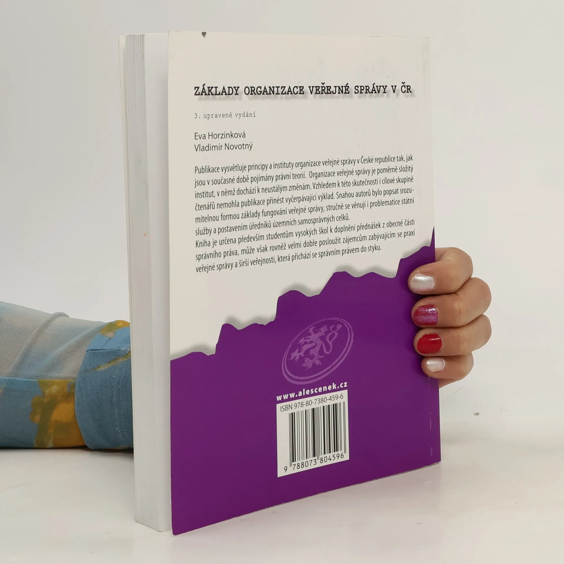 Publikace vysvětluje principy a instituty organizace veřejné správy v České republice tak, jak jsou v současné době pojímány právní teorií. Organizace veřejné správy je poměrně složitý institut, v němž dochází k neustálým změnám. Vzhledem k této skutečnosti i cílové skupině čtenářů nemohla publikace přinést vyčerpávající výklad. Snahou autorů bylo popsat srozumitelnou formou základy fungování veřejné správy, stručně se věnují i problematice státní služby a postavením úředníků územních samosprávných celků. Kniha je určena především studentům vysokých škol k doplnění přednášek z obecné části správního práva, může však rovněž velmi dobře posloužit zájemcům zabývajícím se praxí veřejné správy a širší veřejnosti, která přichází se správním právem do styku.