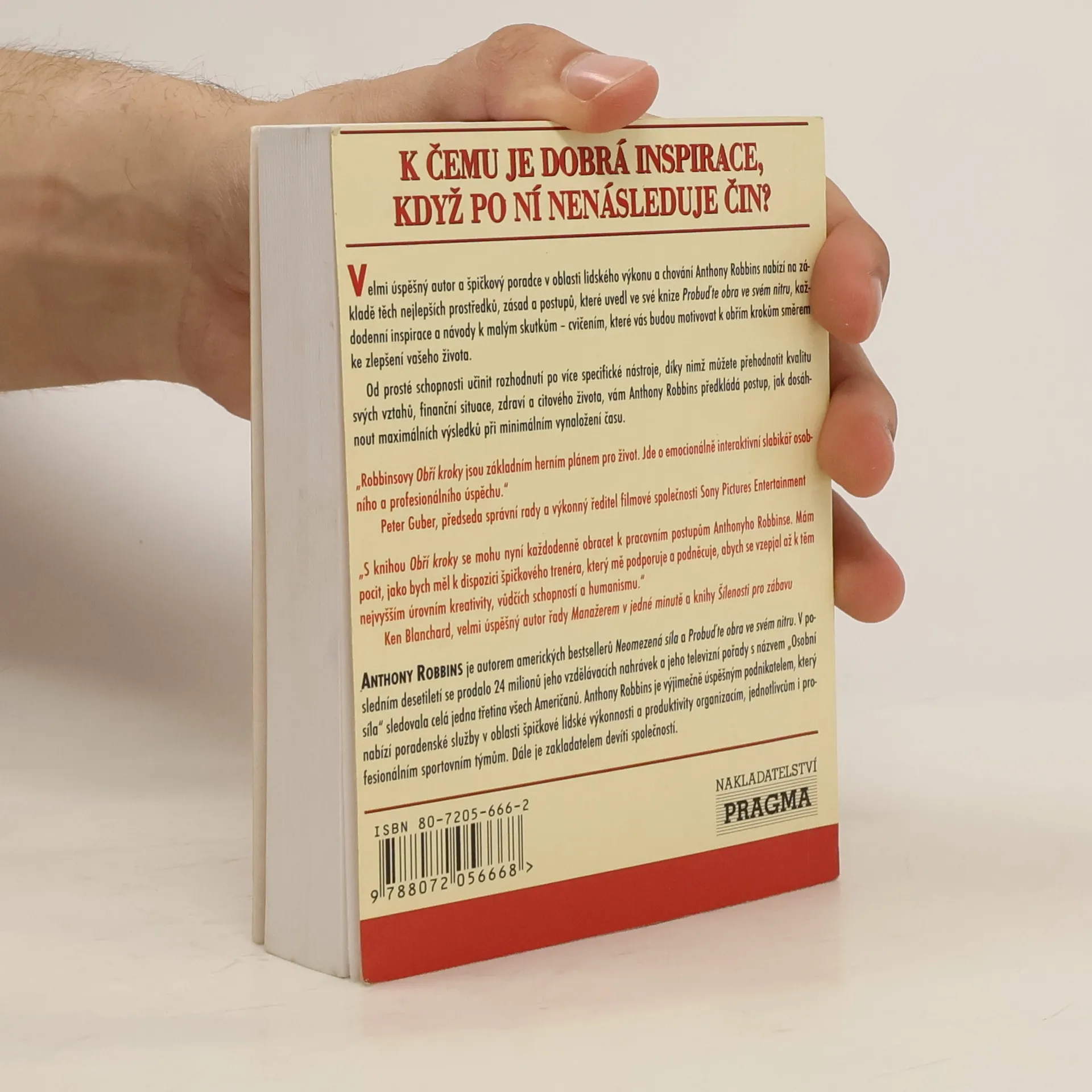 Jak dojít k velkým věcem. Malá knížka se 365 lekcemi sebeovládání na každý den roku od velkého autora. Velmi úspěšný autor a špičkový poradce v oblasti lidského výkonu a chování nabízí na základě těch nejlepších prostředlů, zásad a postupů každodenní inspirace a návody k malým skutkům - cvičením, které vás budou motivovat k obřím krokům směrem ke zlepšení vašeho života. "Robbinsovy Obří kroky" jsou základním herním plánem pro život. Jde o emocionálně interaktivní slabikář osobnosti a profesionálního úspěchu" - Peter Gruber, předseda správní rady a výkonný ředitel společnosti Sony Pictures Entertainment