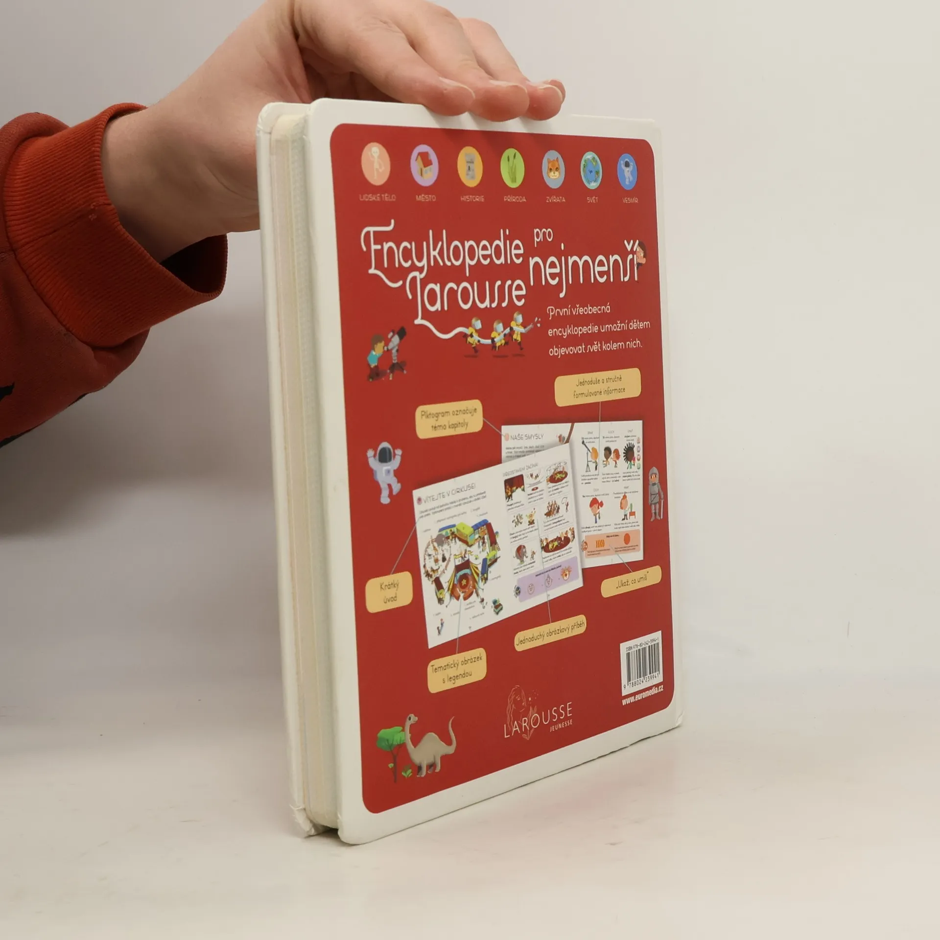 Všeobecná encyklopedie, která umožní malým dětem objevovat svět, který je obklopuje. Tematicky je rozdělena do sedmi tematických okruhů: lidské tělo, město, historie, příroda, zvířata, svět a vesmír, a každé z nich představuje srozumitelným a přitažlivým způsobem, pomocí krátkých informativních textů, přehledných piktogramů a četných názorných obrázků. Tuto knihu budete číst s dětmi znovu a znovu.