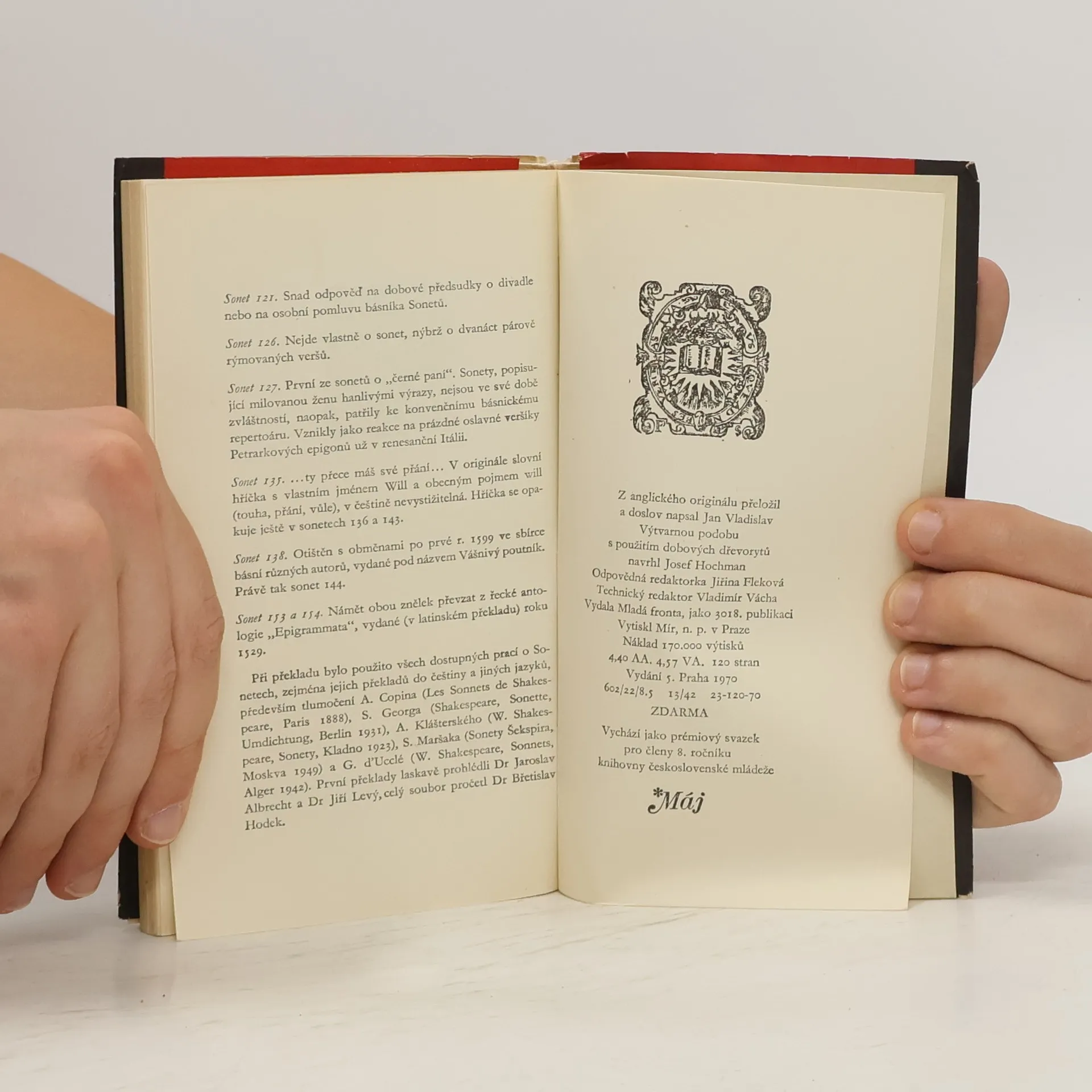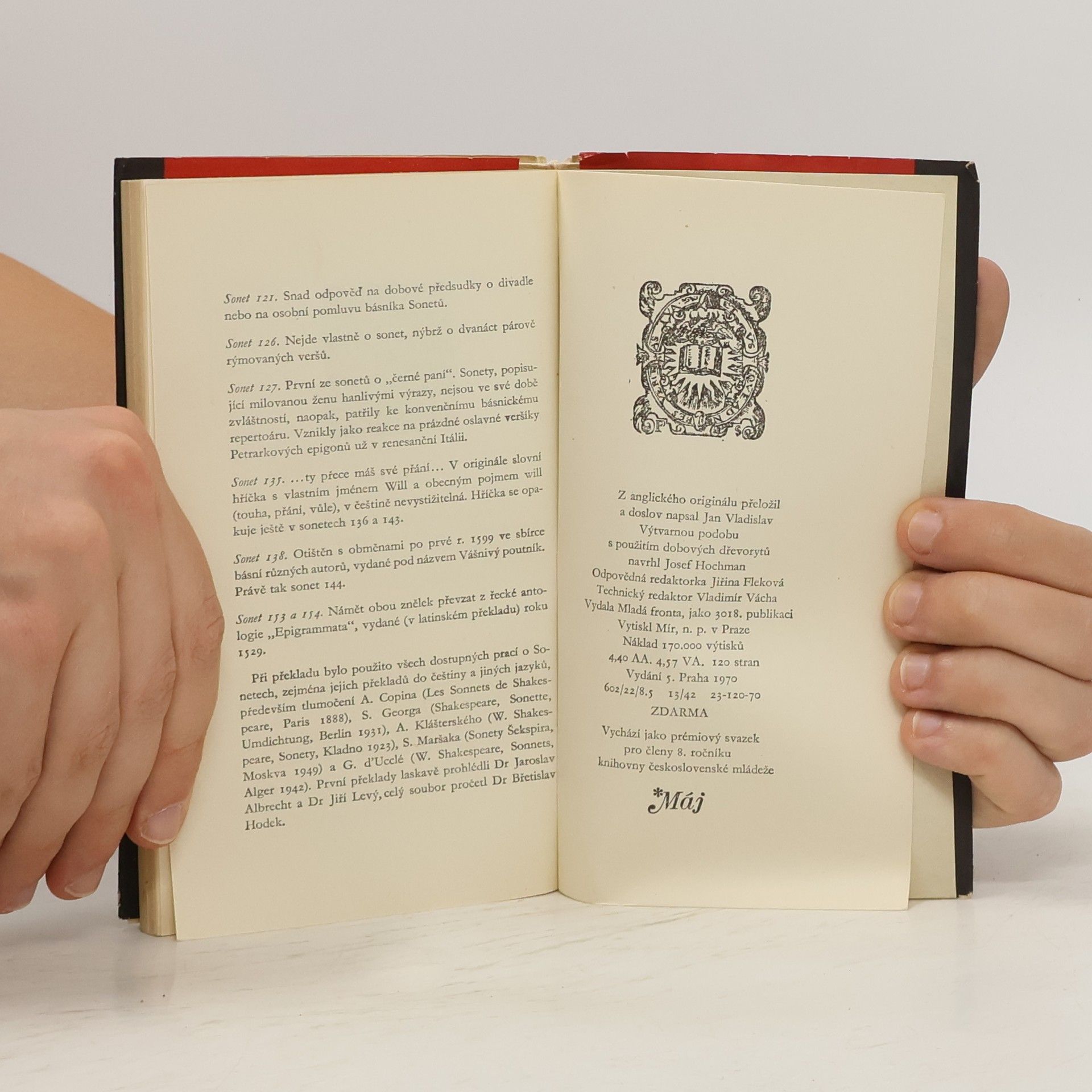 Páté vydání 154 Shakespearových sonetů, tentokrát v překladu Jana Vladislava. Prémiový svazek 8. ročníku edice Máj.