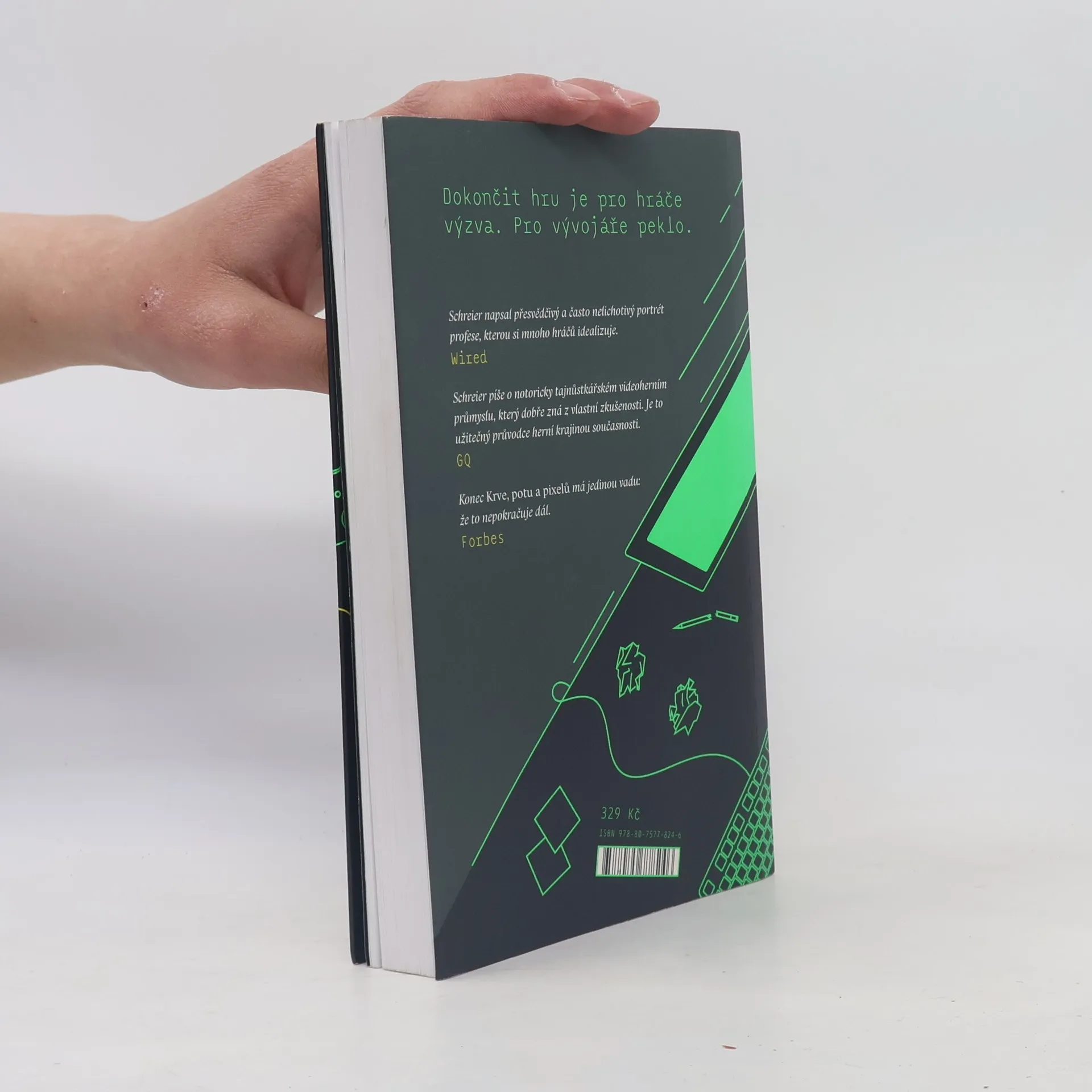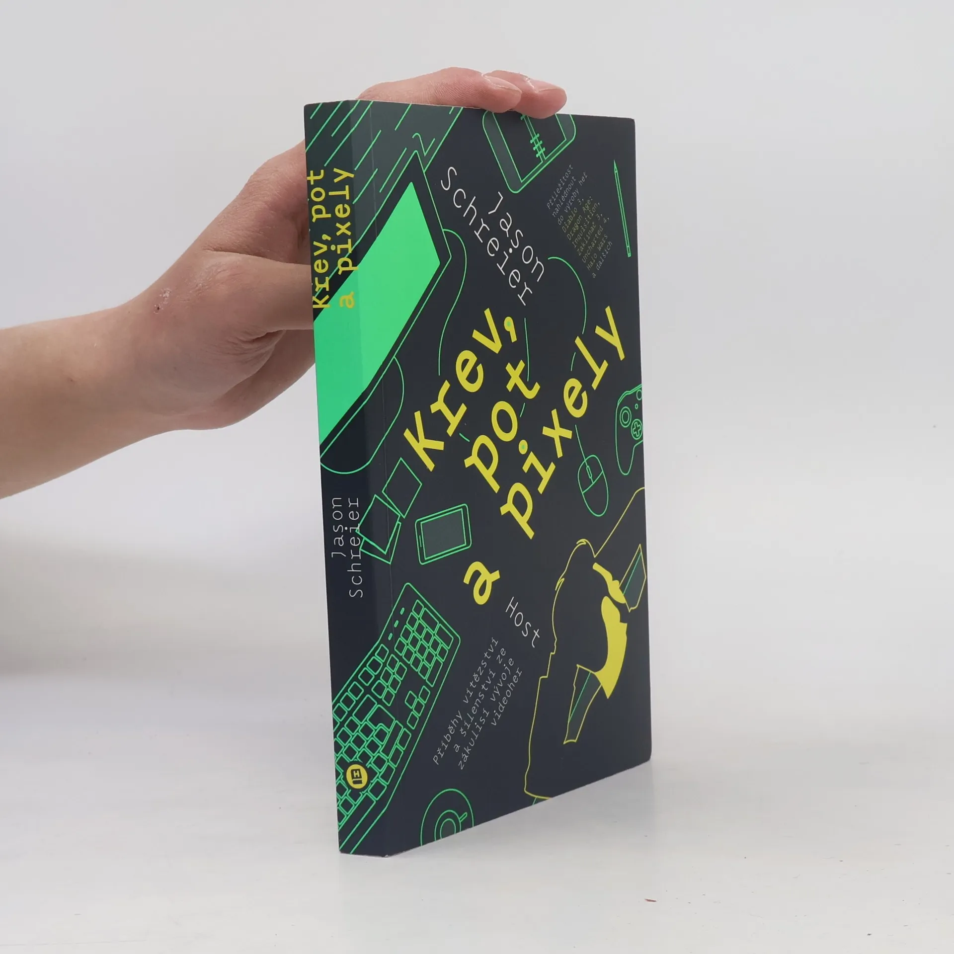 Dokončit hru je pro hráče výzva. Pro vývojáře peklo.Výroba dnešních herních blockbusterů si v ničem nezadá s jejich filmovými protějšky. Kromě stamilionových rozpočtů si vývoj videoher žádá především obrovské tvůrčí a technické nasazení vývojářů, kteří často pracují na hranici finančního i osobního zhroucení. A je lhostejné, zda jde o geniální jednotlivce někde v garáži, nebo stohlavé týmy.Novinář Jason Schreirer vyzpovídal stovky profesionálů z velkých studií, jako jsou Bioware, Blizzard nebo LucasArts, i malé nezávislé týmy. V Krvi, potu a pixelech bere čtenáře na výpravu do zákulisí videoherního světa. Během ní ukazuje, kolik dřiny stojí za každým napínavým questem, zábavným levelem a přiměřeně neporazitelným bossem. Kolik uměleckých výzev, technických překážek, tržních požadavků a korporátních výmyslů musí vývojáři překonat. A že za dobrou hru se často platí i zdravím a osobním životem.