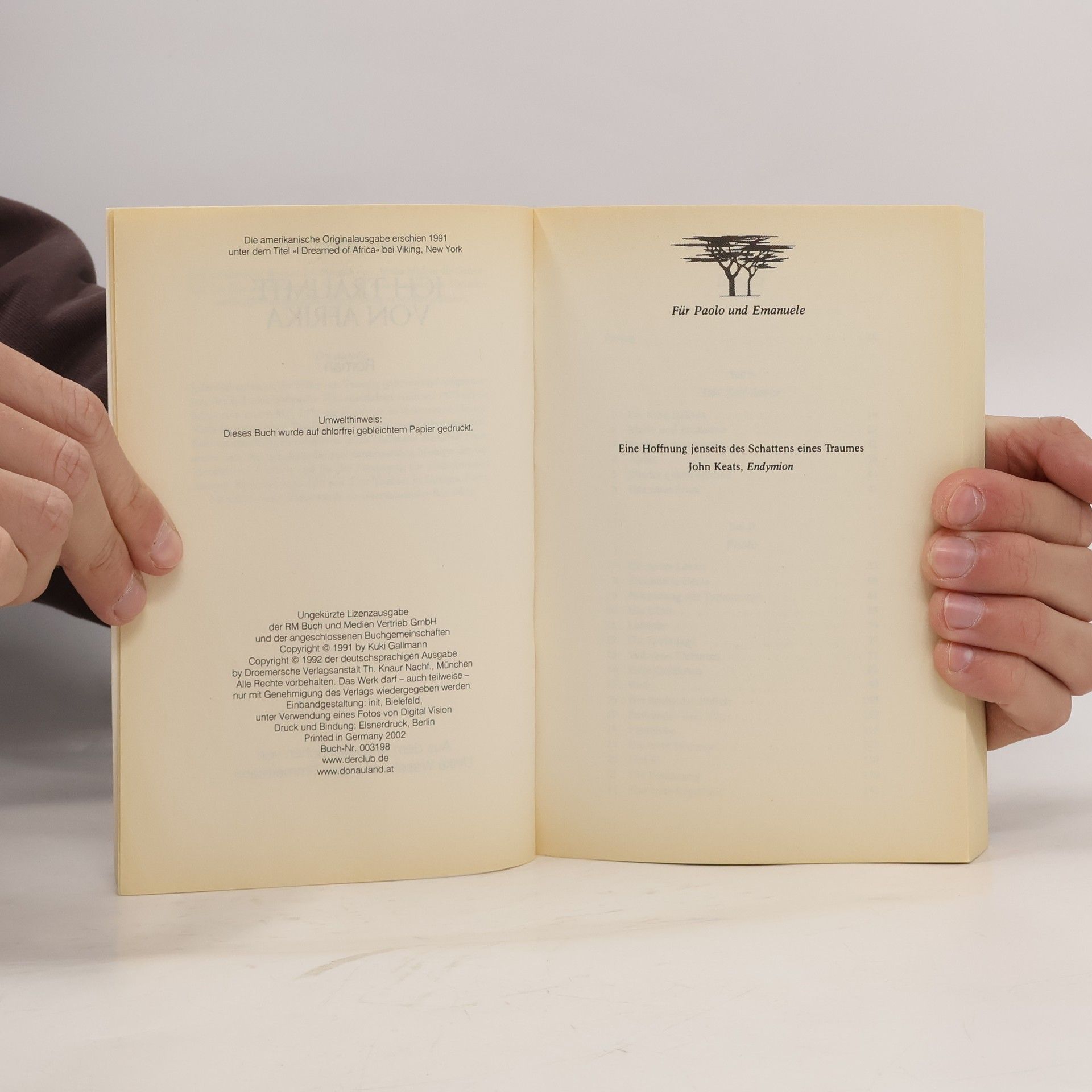 Die gebürtige Italienerin Kuki Gallmann lebt auf einer Farm in Kenia. Zwei Schicksalsschläge nehmen ihr zuerst den Mann, dann den Sohn. Aber die Liebe zur Wahlheimat Afrika und ihren Menschen geben ihr ungeahnte Kräfte. Sie wandelt die Farm in eine Stiftung um, in ein Tier- und Pflanzenreservat, richtet einen Handwerkshof für Frauen ein und initiiert Ausbildungsprogramme für deren Kinder. In diesem Buch erzählt sie ihre anrührende Geschichte.