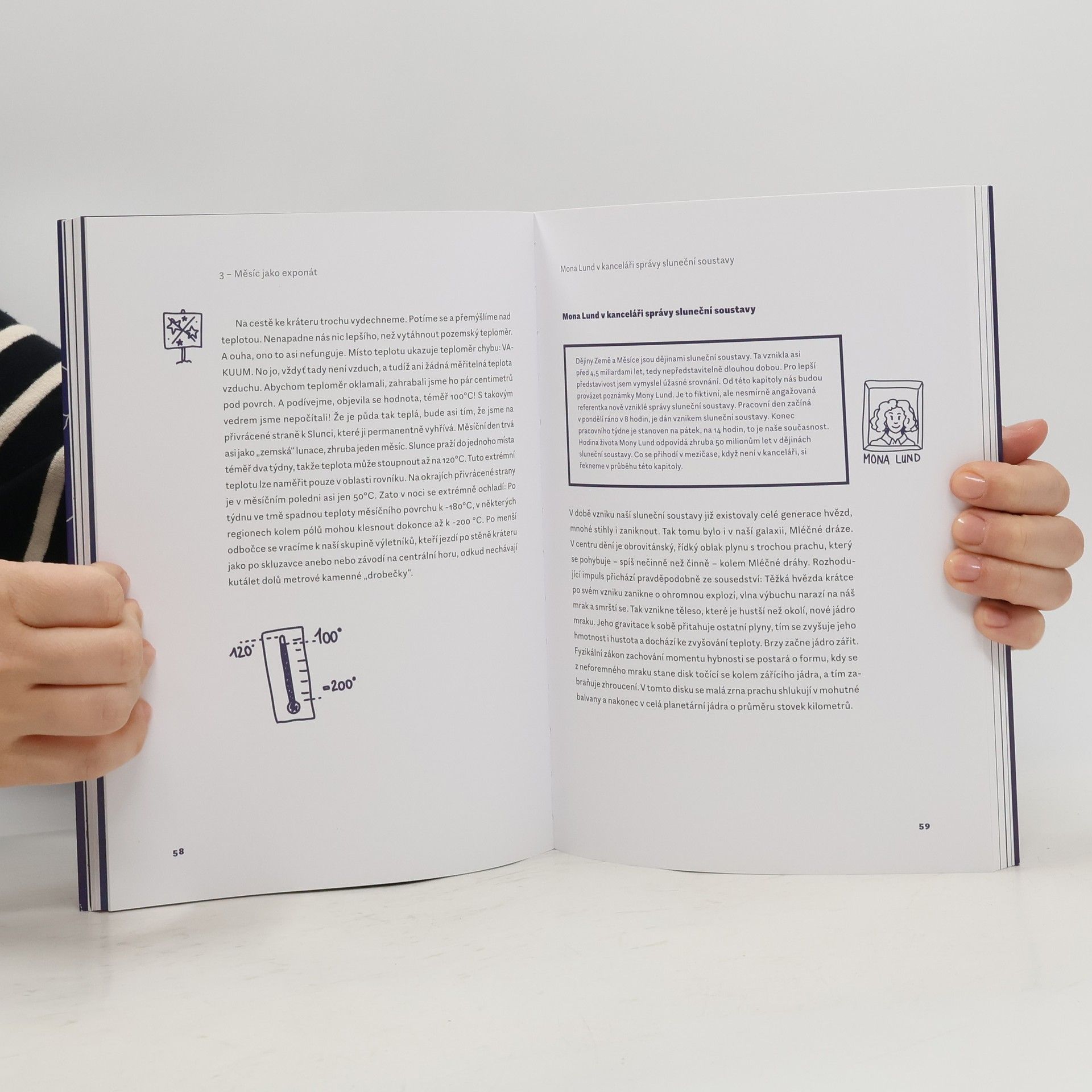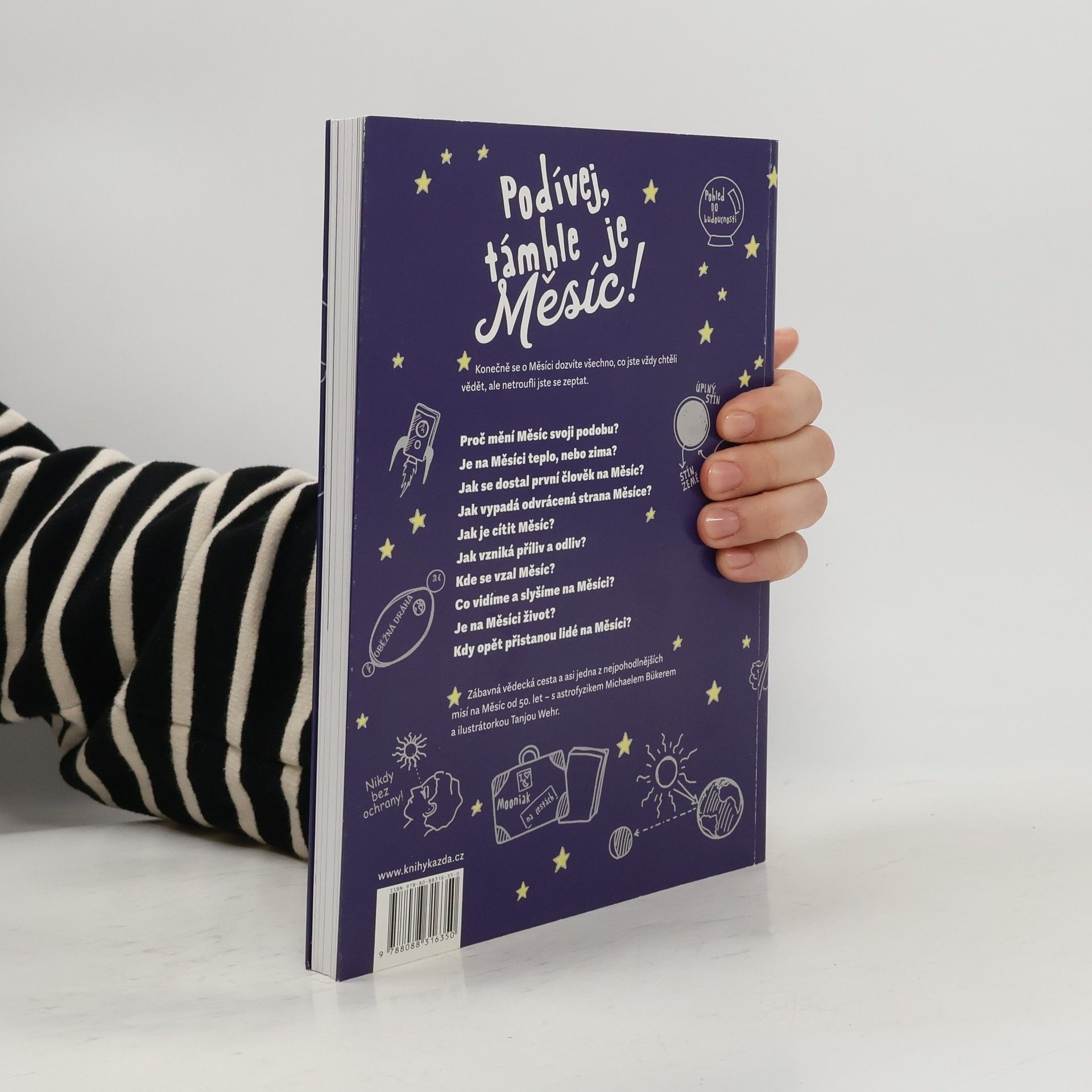 Zábavná vědecká cesta na Měsíc s astrofyzikem Michaelem Bükerem a ilustrátorkou Tanjou Wehr vám přináší vše, co jste chtěli vědět o našem lunárním sousedovi. Měsíc, vrtkavý kamarád na obloze, neustále mění svůj vzhled, ovlivňuje příliv a odliv a objevuje se v našich životech nečekaně. Odkud se bere tato rozmarnost přírody? Země a Měsíc tančí jako neoddělitelný pár, vzájemně se pošťuchují a občas kradou slávu jeden druhému. Prozkoumejte zapeklitou dráhu Měsíce přímo z vesmíru a odhalte tajemství, co ho drží na nebi. Na výletě k Měsíci se dozvíte, zda tam opravdu existují moře a co se skrývá na jeho tmavé straně. Mona Lund, pracovnice kanceláře sluneční soustavy, poskytuje live zprávy o vzniku našeho zemského souputníka. Světový závod k Měsíci, od faxujících plechovek po první přistání astronautů, byl napínavým thrillerem s happyendem. Po přistání 21. července 1969 se Měsíc postupně ztrácel z hledáčku astronomů, ale nyní se situace mění. Japonsko, Čína a Indie se chystají na nové mise. Kdo se dostane na Měsíc jako první a kdy se otevřou cesty pro turisty? Musíme si pospíšit, neboť Měsíc se vzdaluje od Země!