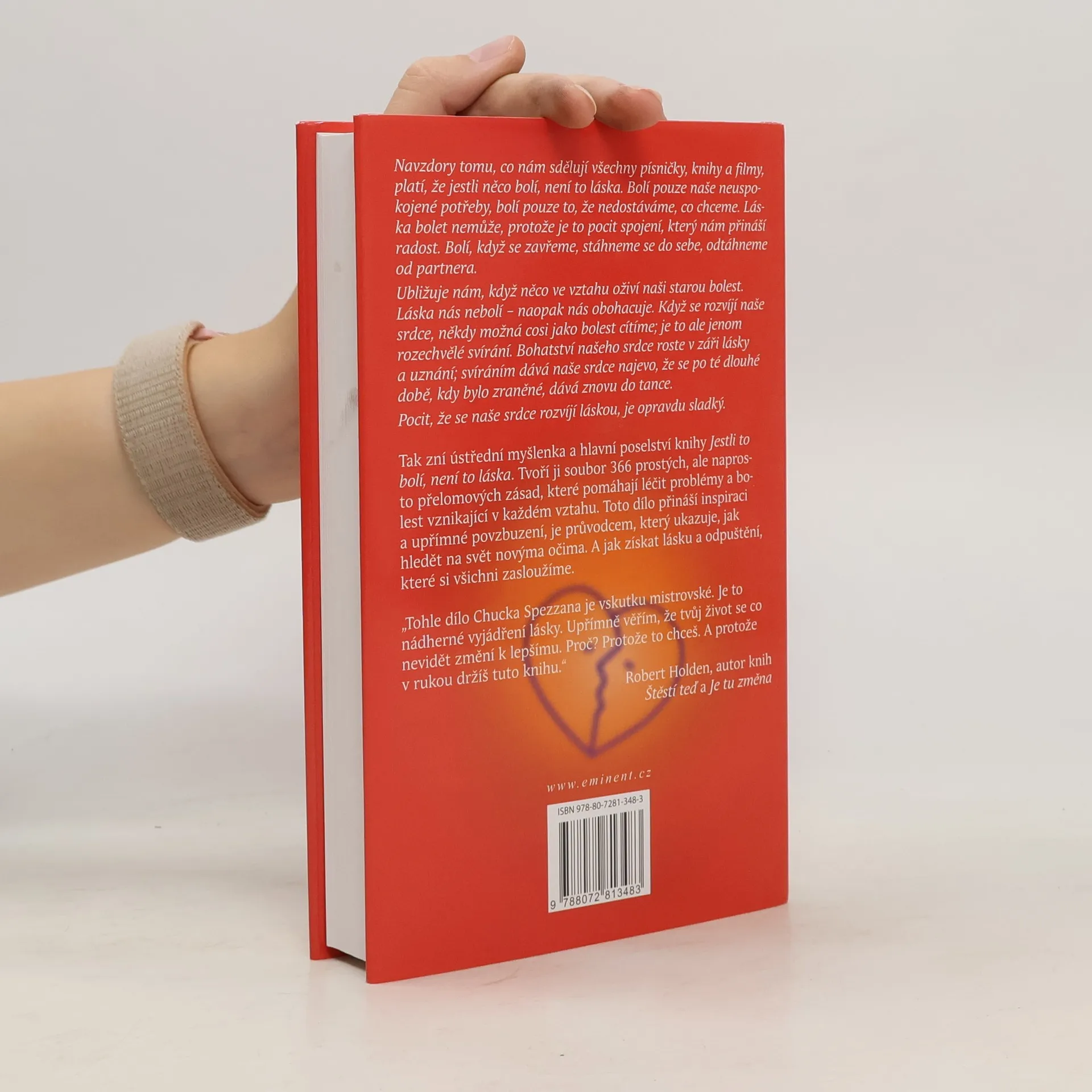 Navzdory tomu, co nám sdělují všechny písničky, knihy a filmy, platí, že jestli něco bolí, není to láska. Bolí pouze naše neuspokojené potřeby, bolí pouze to, že nedostáváme, co chceme. Láska bolet nemůže, protože je to pocit spojení, který nám přináší radost. Bolí, když se zavřeme, stáhneme se do sebe, odtáhneme od partnera. Ubližuje nám, když něco ve vztahu oživí naši starou bolest. Láska nás nebolí – naopak nás obohacuje. Když se rozvíjí naše srdce, někdy možná cosi jako bolest cítíme; je ale jenom svírání. Bohatství našeho srdce roste v záři lásky a uznání; svíráním dává naše srdce najevo, že se po té dlouhé době, kdy bylo zraněné, dává znovu do tance. Pocit, že se naše srdce rozvíjí láskou, je opravdu sladký. Tak zní ústřední myšlenka a hlavní poselství knihy Jestli to bolí, není to láska. Tvoří ji soubor 366 prostých, ale naprosto přelomových zásad, které pomáhají léčit problémy a bolest vznikající v každém vztahu. Toto dílo přináší inspiraci a upřímné povzbuzení, je průvodcem, který ukazuje, jak hledět na svět novýma očima. A jak získat lásku a odpuštění, které si všichni zasloužíme.
