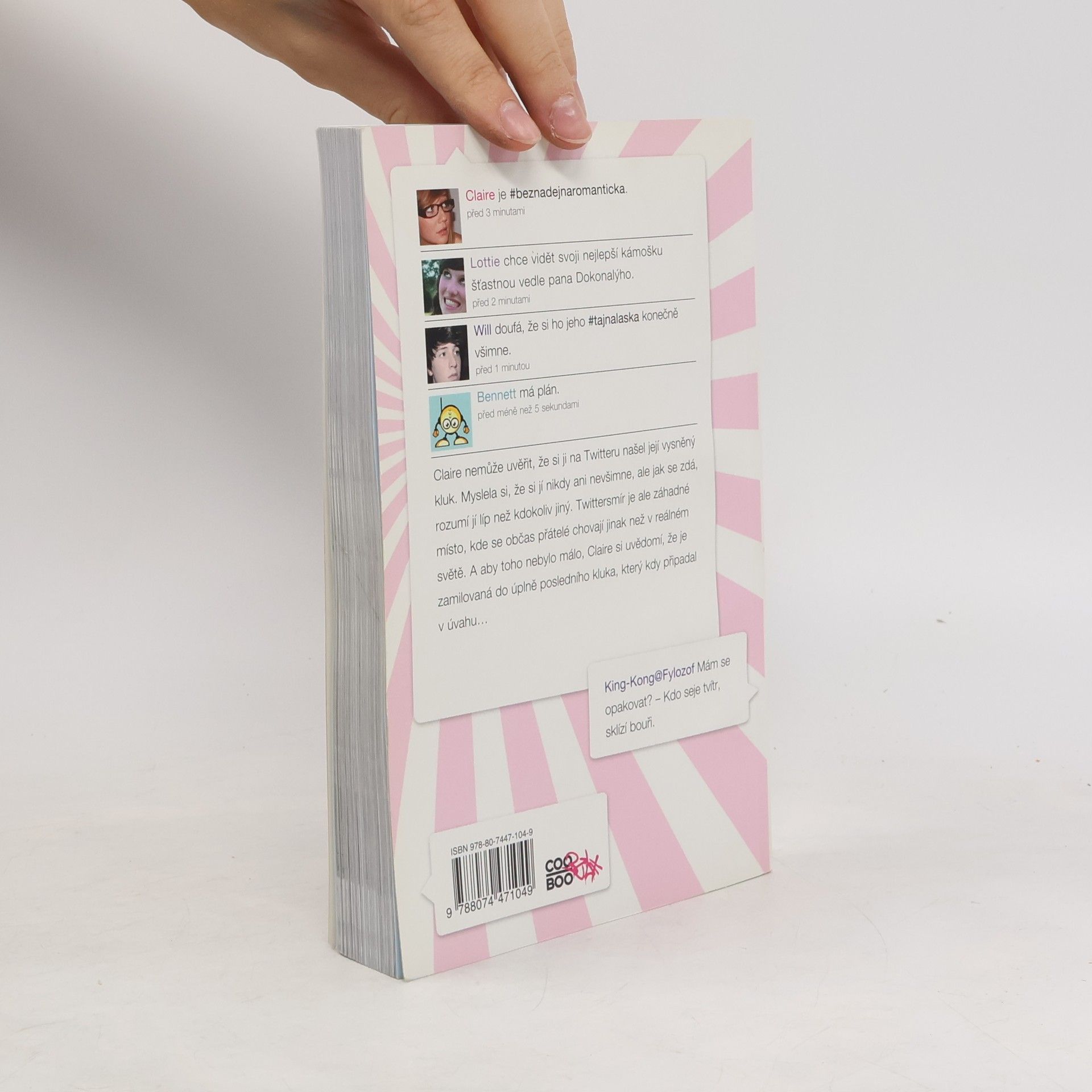 Claire nemůže uvěřit, že si ji na Twitteru našel její vysněný kluk. Myslela si, že si jí nikdy ani nevšimne, ale jak se zdá, rozumí jí líp než kdokoliv jiný. Twittersmír je ale záhadné místo, kde se občas přátelé chovají jinak než v reálném světě. A aby toho nebylo málo, Claire si uvědomí, že je zamilovaná do úplně posledního kluka, který kdy připadal v úvahu…