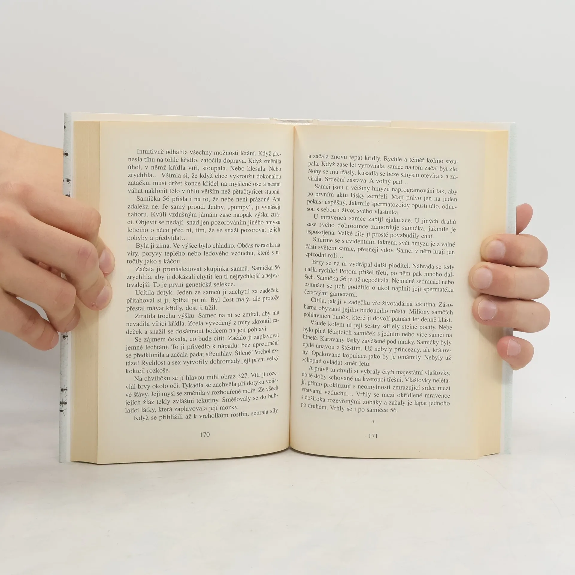 Dávejte pozor, kam šlapete! Během několika vteřin, které potřebujete k přečtení tohoto odstavce, se narodí 40 lidí… a 700 milionů mravenců. Malí, pro nás takřka neviditelní, a přesto úchvatní tvoři vytvořili od doby, kdy se před stovkou milionů let na Zemi objevili, zcela dokonalou a všestranně fungující civilizaci. Budují města a federace, bojují o území, společnými silami odrážejí útoky vetřelců a predátorů. Zakládají houbová políčka nebo mšičí farmy a svá hnízda dokážou utkat z listí. Vyznávají kastovní systém a některé druhy si otrokářským způsobem podrobují jiné. Přestože představivost lidí vždy s oblibou hledala paralelní světy po nejrůznějších koutech vesmíru, na fantastickou existenci těch, kteří žijí v poloskrytu pod našima nohama, se zapomínalo. Jsou mravenci anarchisté, roajalisté anebo se jejich organizace blíží totalitnímu zřízení? Jak chápou čas? Co o nich vlastně víme? A vědí oni o nás? Werberův román Mravenci bývá právem označován jako realistická sci-fi: to nejúžasnější je na něm právě to, co je skutečné. Po jeho přečtení už nikdy nebudete vnímat svět tak jako dosud - stejně jako hrdina knihy, nezaměstnaný pařížský zámečník Jonathan Wells, který po svém excentrickém strýci zdědil suterénní byt a tajemné varování: Hlavně nikdy nechoď do sklepa!