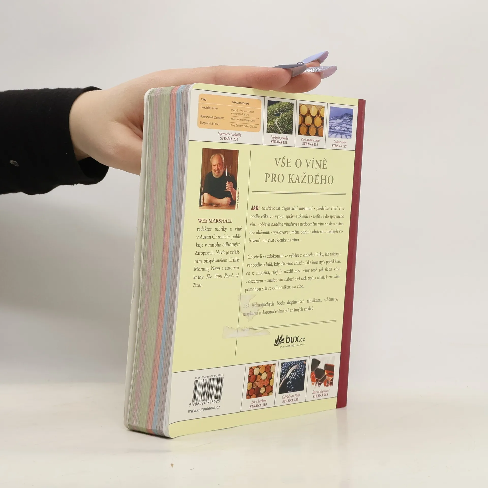 Vše o víně pro každého. Chcete-li se zdokonalit ve výběru z vinného lístku, vědět, jak nakupovat podle odrůd, kdy dát víno chladit, jaké jsou styly portského, co je madeira, jaký je rozdíl mezi víny rosé, jak sladit víno s dezertem, co je degustace – znalec vín nabízí 334 rad, tipů a triků, které vám pomohou stát se odborníkem na víno. Výklad a odpovědi na všechny otázky kolem vína doplňují tabulky, schémata, mapky a doporučení od předních sommeliérů.
