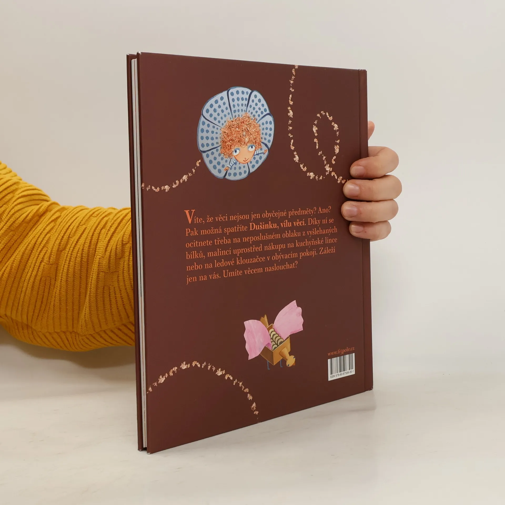 Sedm příběhů pro děti, které ví, že věci nejsou jen obyčejné předměty. Právě takové děti totiž můžou spatřit Dušinku, vílu věcí, a spolu s ní zažít nečekaná dobrodružství třeba uprostřed nákupu vyskládaného na kuchyňské lince, na neposluš¬ném oblaku z vyšlehaných bílků nebo na ledem pokryté klouzačce v obývacím pokoji. Příběhy napsala Ester Stará, autorka oceněných knih pro děti A pak se to stalo! a Chrochtík a Kvikalka na cestě za blýskavým prasátkem a ilustrovala přední česká výtvarnice Lucie Dvořáková.