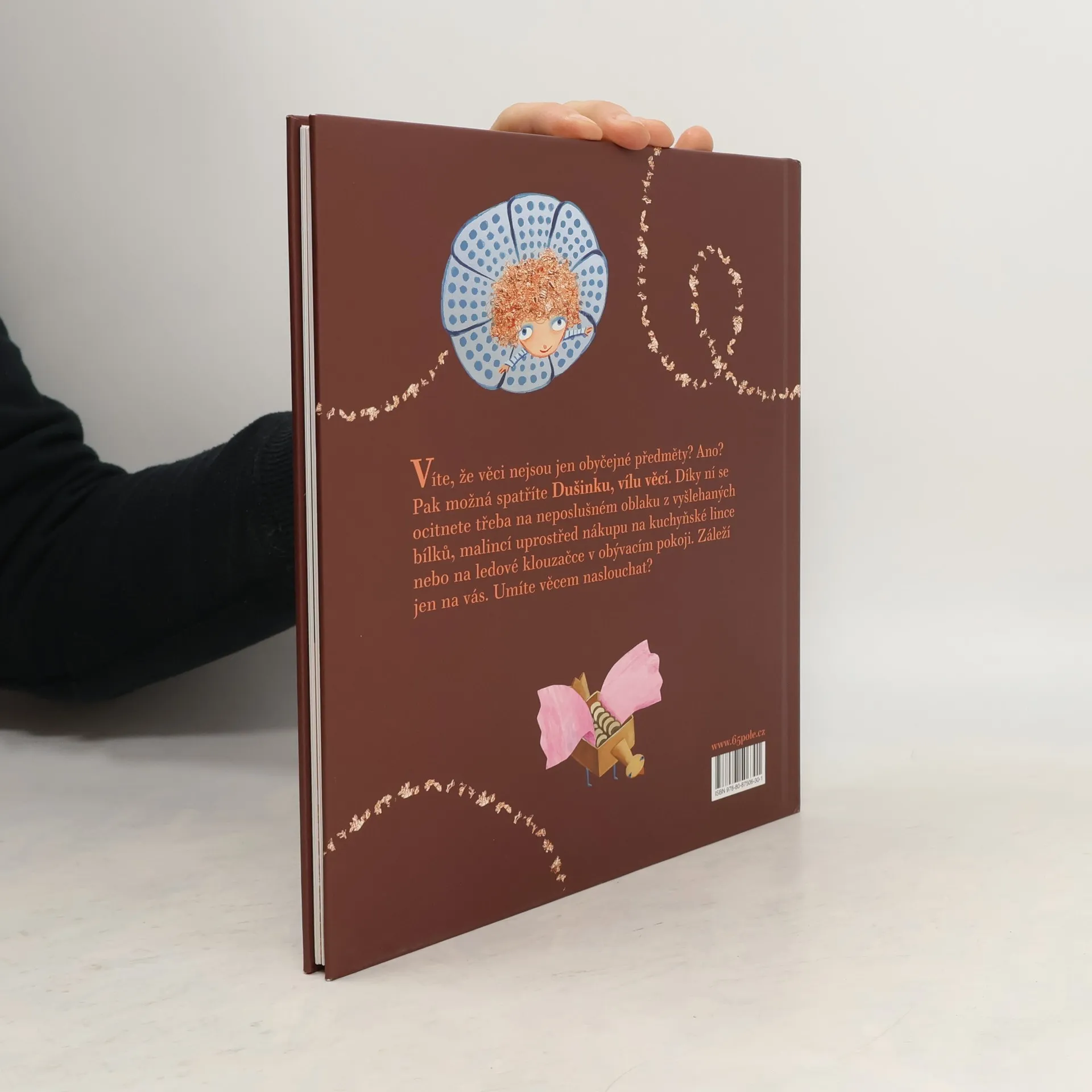 Sedm příběhů pro děti, které ví, že věci nejsou jen obyčejné předměty. Právě takové děti totiž můžou spatřit Dušinku, vílu věcí, a spolu s ní zažít nečekaná dobrodružství třeba uprostřed nákupu vyskládaného na kuchyňské lince, na neposluš¬ném oblaku z vyšlehaných bílků nebo na ledem pokryté klouzačce v obývacím pokoji. Příběhy napsala Ester Stará, autorka oceněných knih pro děti A pak se to stalo! a Chrochtík a Kvikalka na cestě za blýskavým prasátkem a ilustrovala přední česká výtvarnice Lucie Dvořáková.
