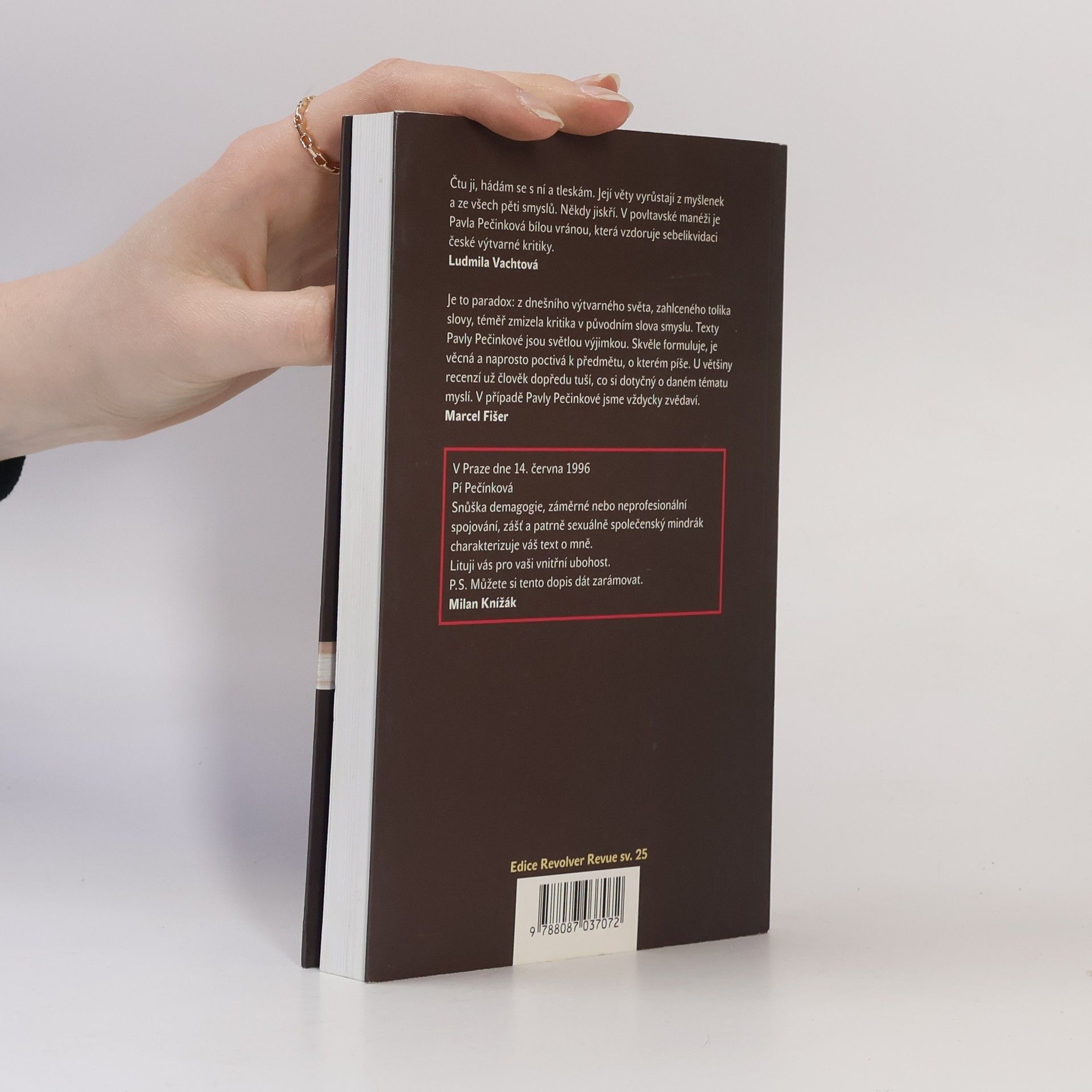 "Čtu ji, hádám se s ní a tleskám. Její věty vyrůstají z myšlenek a ze všech pěti smyslů. Někdy jiskří. V povltavské manéži je Pavla Pečinková bílou vranou, která vzdoruje sebelikvidaci české výtvarné kritiky." (Ludmila Vachtová) Po výborech z literárních kritik Michaela Špirita a Marka Vajchra vychází jako 25. svazek Edice Revolver Revue výběr z reflexí Pavly Pečinkové. "Čím je její hlas v ohlušujícím a povýtce efemérním mumraji dnešního výtvarného (pseudo )umění a úvah o něm takřka ojedinělý? Na odkaz mrtvých dokáže pohlížet skrze živé otázky, díla současníků zkoumá s vědomím nadčasových kritérií. Nenechá se mást dobovými reakcemi publika ani mediálním ohlasem; pronikavost vlastního pohledu osvědčuje mimořádným interpretačním citem pro práci osamělých běžců a solitérů, jejichž klíčový význam většině ukázala či ukáže teprve budoucnost. Erudici nepotřebuje dokládat odbornickou hantýrkou. Nad dílem se nestydí projevovat zájem o tak nepopulární hodnotu, jako je autorův charakter. Dokáže překvapivě odkrývat principy, které v českém i světovém umění nepozorovaně vládnou už víc než sto let."