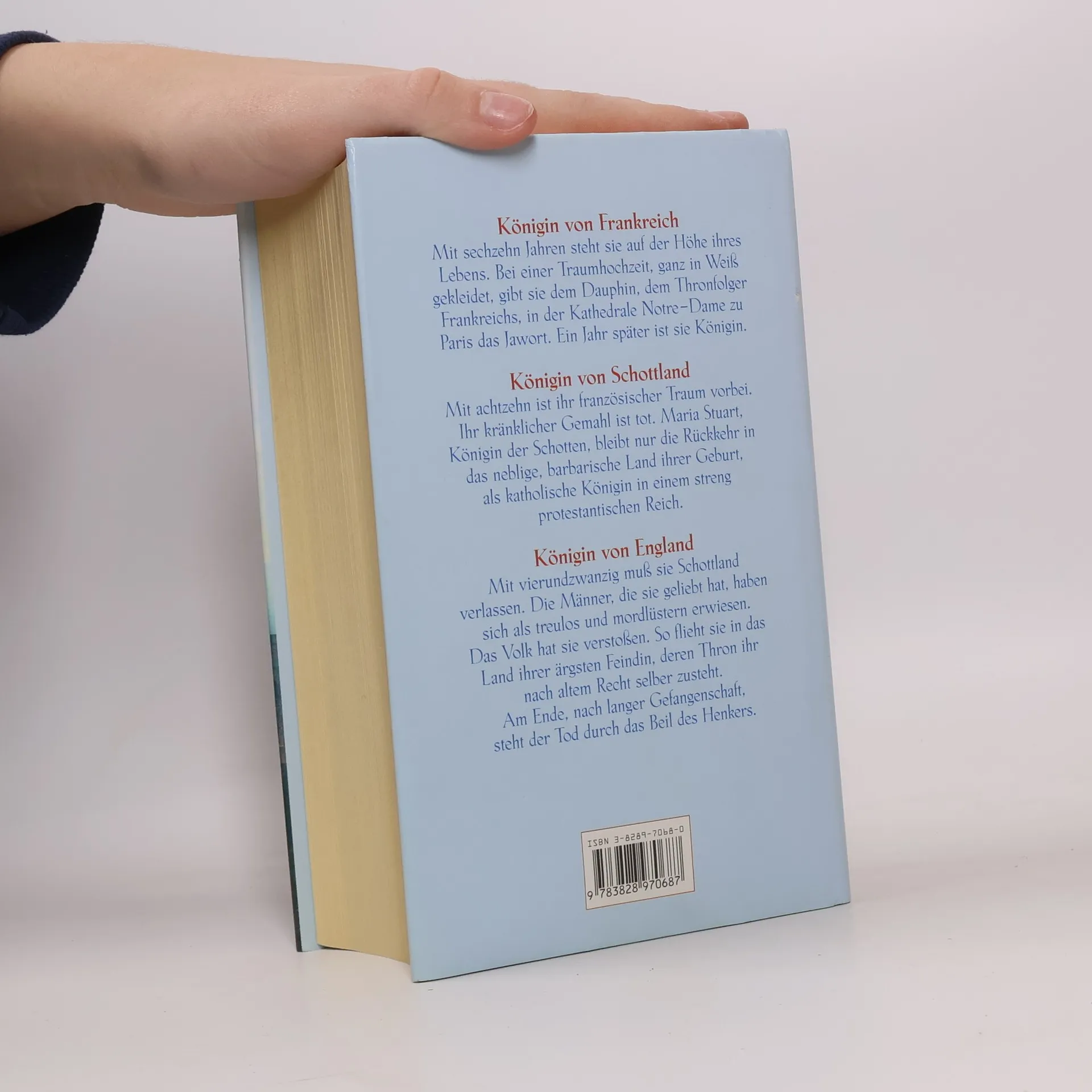 Königin von Frankreich Mit sechzehn Jahren steht sie auf der Höhe ihres Lebens. In einer Traumhochzeit, ganz in Weiß gekleidet, gibt sie dem Dauphin, dem Thronfolger Frankreichs, in der Kathdrale Notre Dame zu Paris das Jawort. Ein Jahr später ist sie Königin. Königin von Schottland Mit achtzehn ist ihr französischer Traum vorbei. Ihr kränklicher Gemahl ist tot. Maria Stuart, Königin der Schotten, bleibt nur die Rückkehr in das neblige, barbarische Land ihrer Geburt, als katholische Königin in einem streng protestantischen Reich. Königin von England Mit vierundzwanzig muß sie Schottland verlassen. Die Männer, die sie geliebt hat, haben sich als treulos und mordlüstern erwiesen. Das Volk hat sie verstoßen. So flieht sie in das Land ihrer ärgsten Feindin, deren Thron ihr nach altem Recht selber zusteht. Am Ende, nach langer Gefangenschaft, steht der Tod durch das Beil des Henkers.