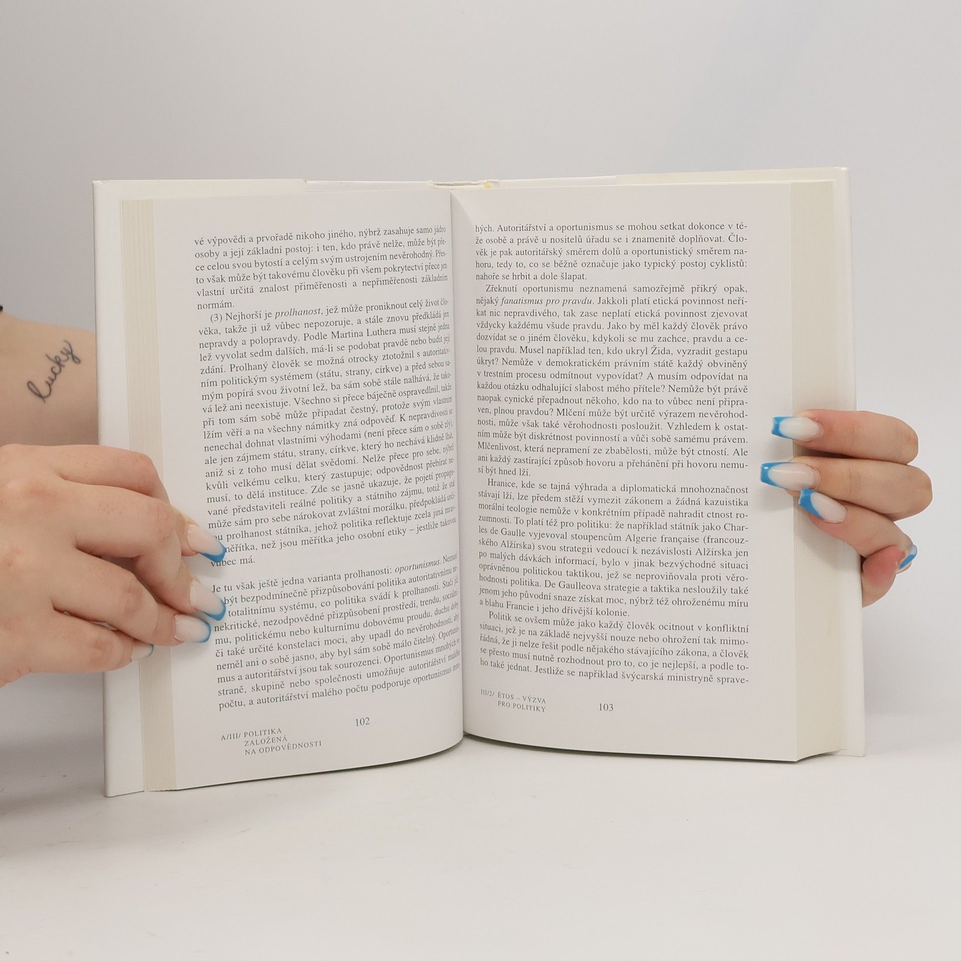 Křesťanský myslitel odhaluje význam etických principů pro současnou světovou politiku a hospodářství. Moderní stát může fungovat pouze na základě etického konsensu společnosti, proto vyžaduje změnu lidského vědomí. Ve sféře politiky se musí prosadit „odpovědnost“, napomáhající rovnováze mezi ideály a realitou. Odpovědný hospodářský přístup spojí ekonomickou strategii s etickým přesvědčením. Toto nové uspořádání světa tudíž předpokládá uplatnění morální koncepce, jejíž humánní hodnoty akceptují všechny civilizační a náboženské okruhy. Záchrana lidstva spočívá ve vědomí odpovědnosti...