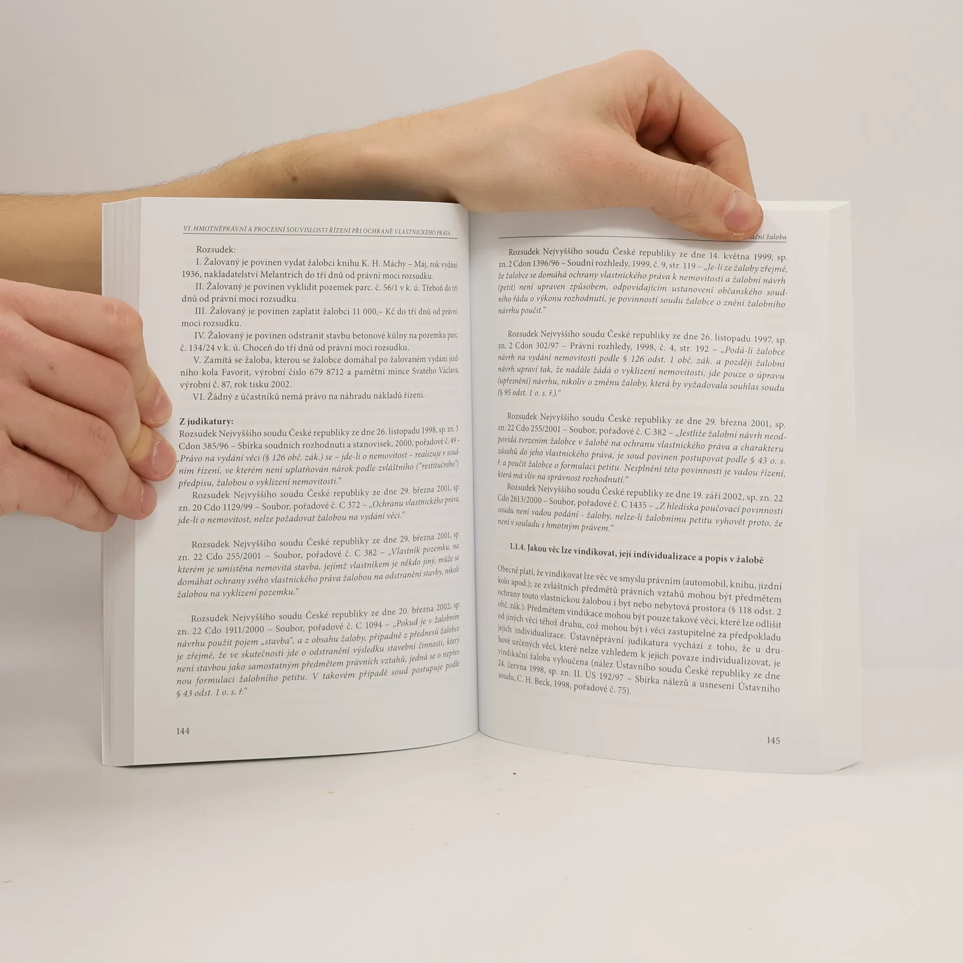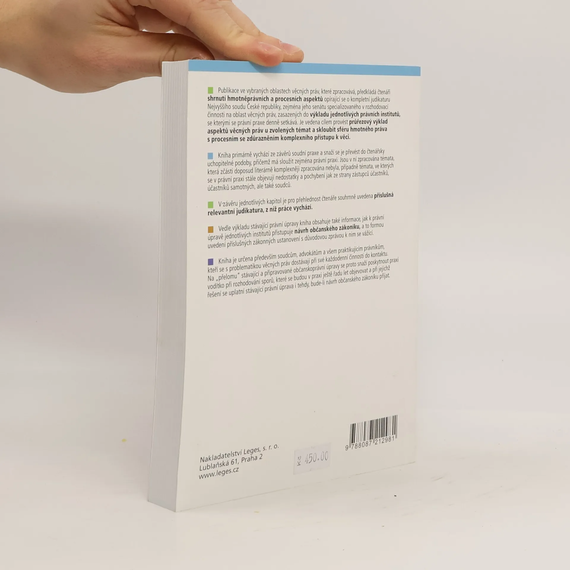 Vybrané procesněprávní a hmotněprávní souvislosti. Publikace předkládá shrnutí hmotněprávních a procesních aspektů ve vybraných oblastech věcných práv. Opírá se o aktuální judikaturu Nejvyššího soudu České republiky, zejména jeho senátu specializovaného na oblast věcných práv, která je zasazena do výkladu jednotlivých právních institutů, se kterými se právní praxe denně setkává. Po výkladu institutu dobrých mravů v soudním řízení se autor věnuje právním normám s relativně neurčitou právní hypotézou v řízeních ve sféře věcných práv. V další kapitole jsou rozebrány peněžité náhrady (např. při vypořádání společného jmění manželů) včetně způsobu jejich určování. Výrazná pozornost je věnována ochraně vlastnických práv – řízení o vindikační žalobě, řízení o vyklizení bytu, stavbám na cizích pozemcích atd. Poslední dvě kapitoly jsou věnovány hmotněprávním a procesním souvislostem společného jmění manželů a podílového spoluvlastnictví. Text je doplněn příslušnými partiemi návrhu občanského zákoníku s důvodovou zprávou. Cílem knihy je podat průřezový praktický výklad uvedených institutů a skloubit sféru hmotného práva s procesním se zdůrazněním komplexního přístupu k věci a uvedením veškeré použitelné judikatury. Kniha je určena především soudcům, advokátům a dalším praktikujícím právníkům, ale také širší veřejnosti.