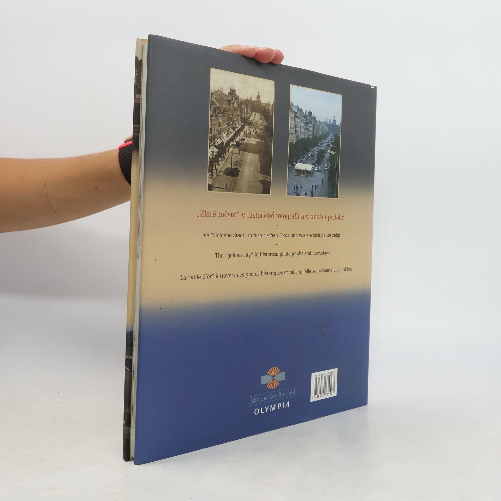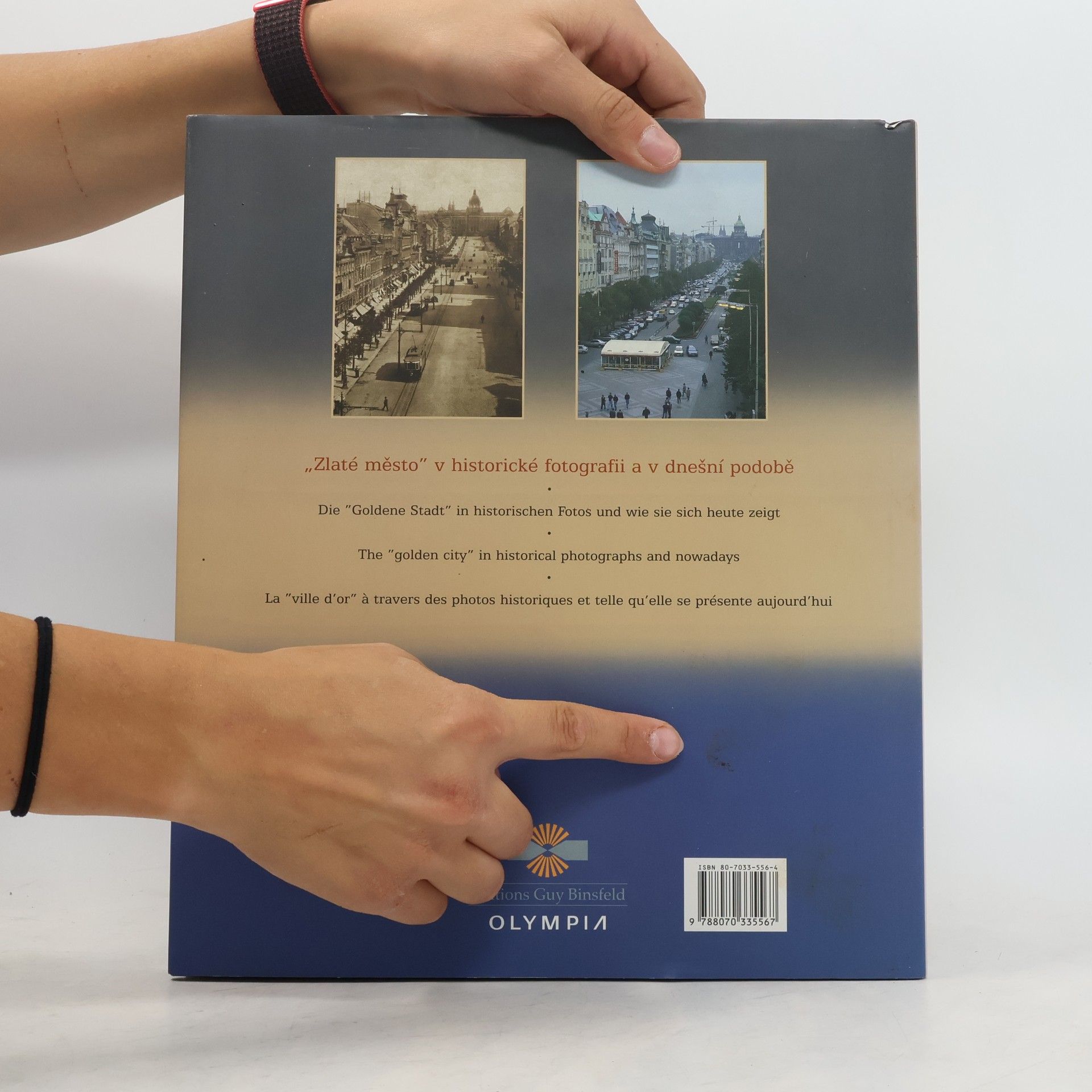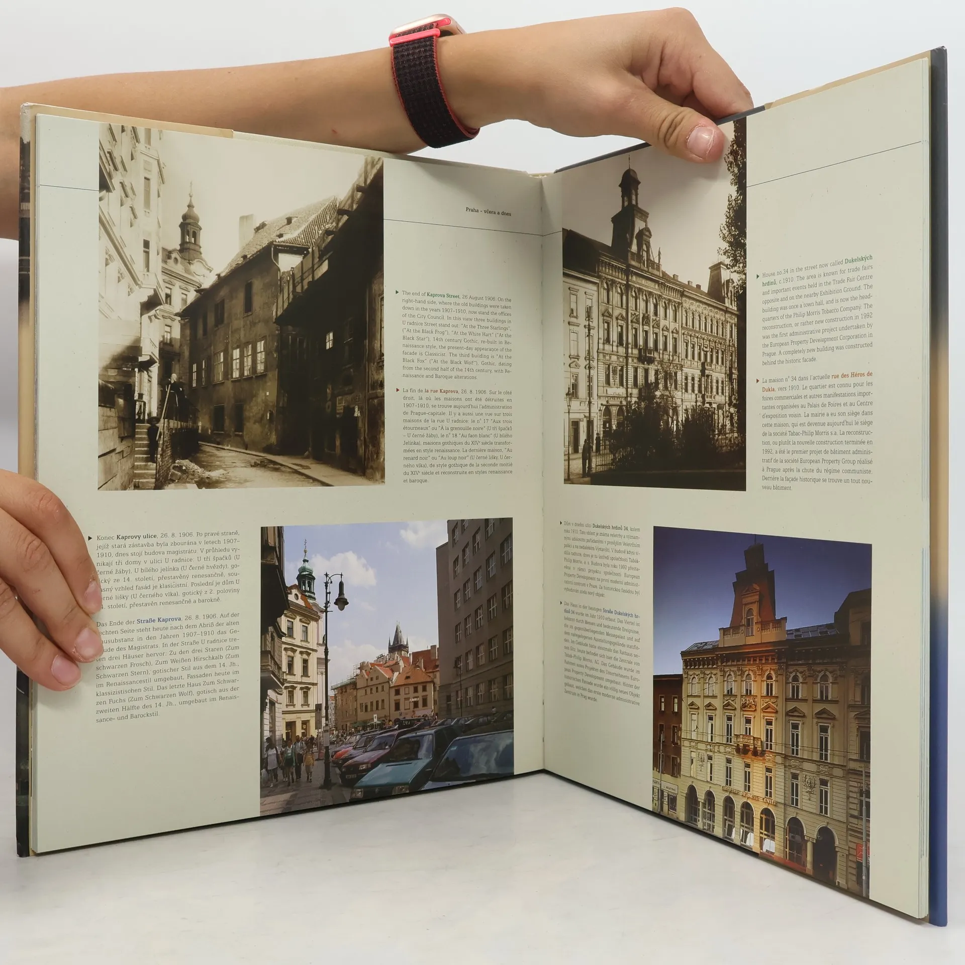 Proměny Prahy na základě srovnání dobové a současné fotografie téže lokality. Dvojice fotografií téhož místa pořízených s různým časovým odstupem (od patnácti po sto padesát let) doplňuje velmi stručný uměleckohistorický komentář (datace stavby, příp. přestavby či zboření, jména architektů, sloh, současné využití). Snímky jsou řazeny vzestupně podle data zhotovení starší fotografie. Publikace je cenným dokladem stavebních proměn města, ale nezahrnuje žádný místopisný rejstřík ani obsah, takže orientovat se ve shromážděném obrazovém materiálu v podstatě není možné.
