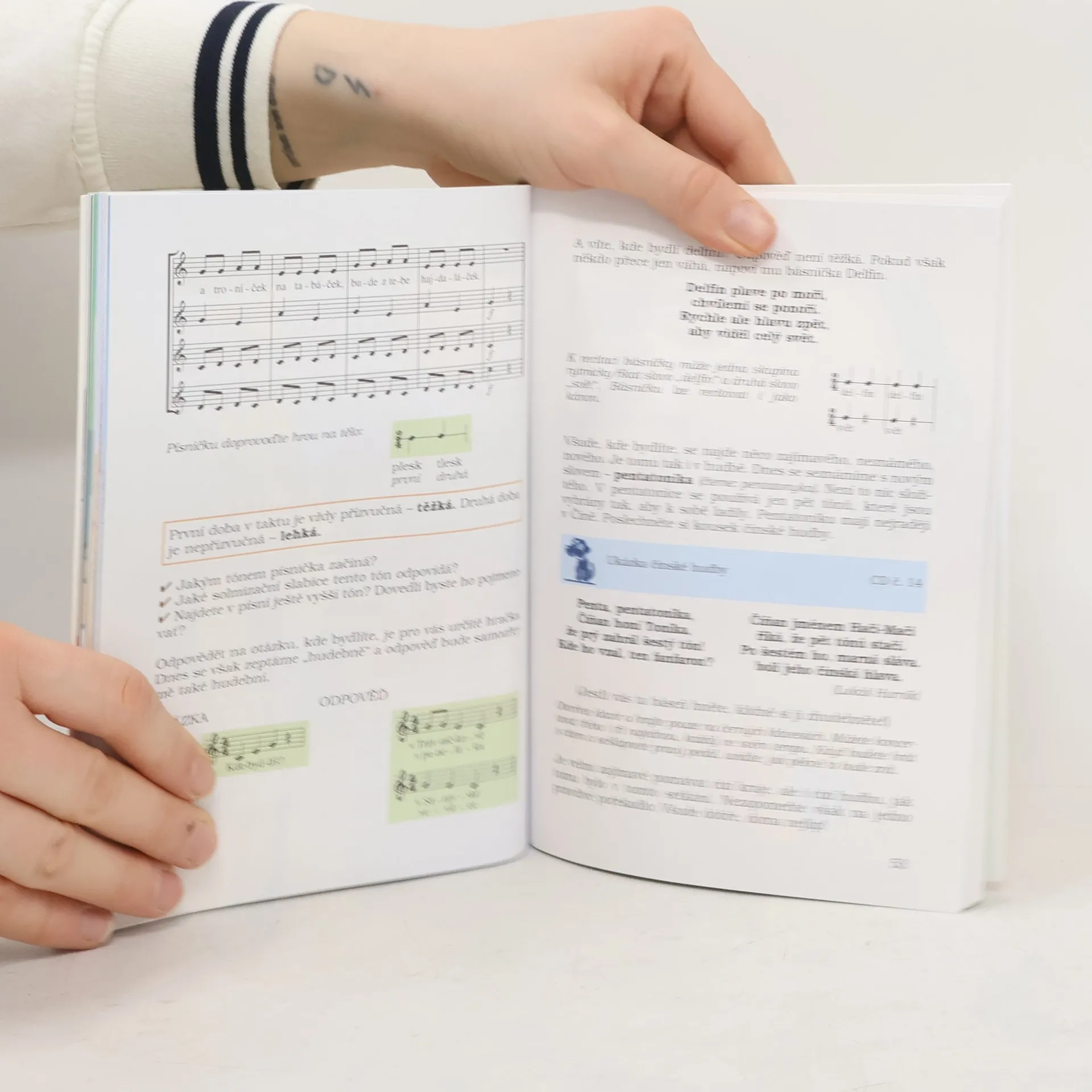 Ilustrovaná učebnice Marie Liškové a Lukáše Hurníka obsahuje čtyřicet známých dětských písniček, např. Beskyde, Beskyde, Běží liška k Táboru, Na tý louce zelený, Vyletěla holubička a další. Každá písnička je opatřena melodickou linkou, textem a akordickými značkami. Učebnice pojednává rovněž o základních hudebních pojmech, stručně představuje některé hudební nástroje a uvádí několik důležitých poznatků o hlasové výchově. Publikace je doplněna abecedním seznamem písní a seznamem poslechových skladeb.