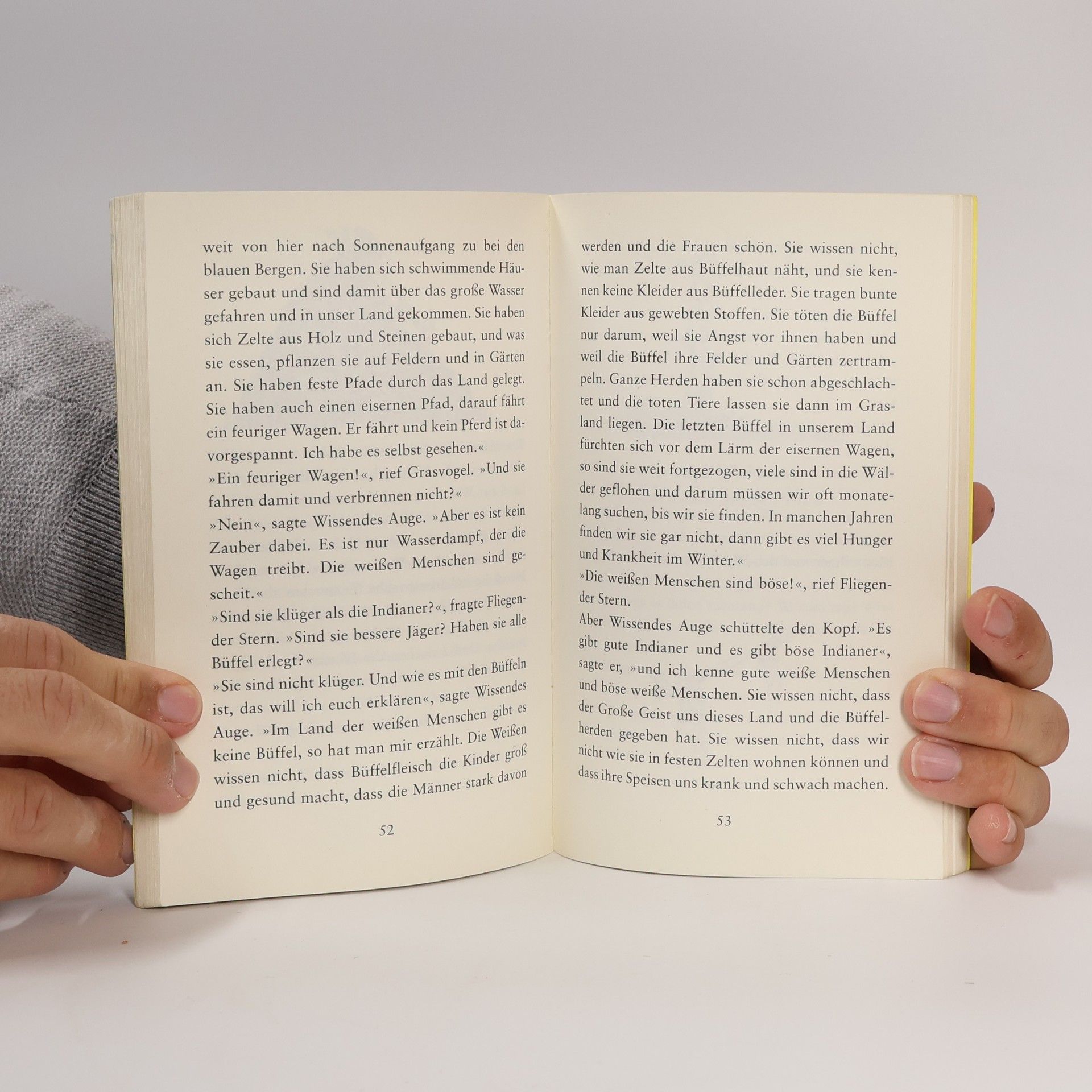 Eines Tages machen sich die beiden Indianerjungen Fliegender Stern und Grasvogel mutig und ohne Wissen der Erwachsenen auf den Weg zu den Weißen, um zu erfahren, warum diese in ihr Land gekommen sind, die Eisenbahn gebaut und die großen Büffelherden vertrieben haben, so dass die Indianer um ihre Existenz fürchten müssen. Auch wenn sich diese Entwicklung nicht zurückdrehen lässt, machen die beiden Jungen die Erfahrung, dass es durchaus Weiße gibt, mit denen man reden kann und die die Indianer respektieren. Als Fliegender Stern und Grasvogel dann von ihrem Abenteuer zurückkehren, werden sie von ihrem Stamm für diese mutige, wenn auch eigenwillige Aktion voller Hochachtung empfangen.