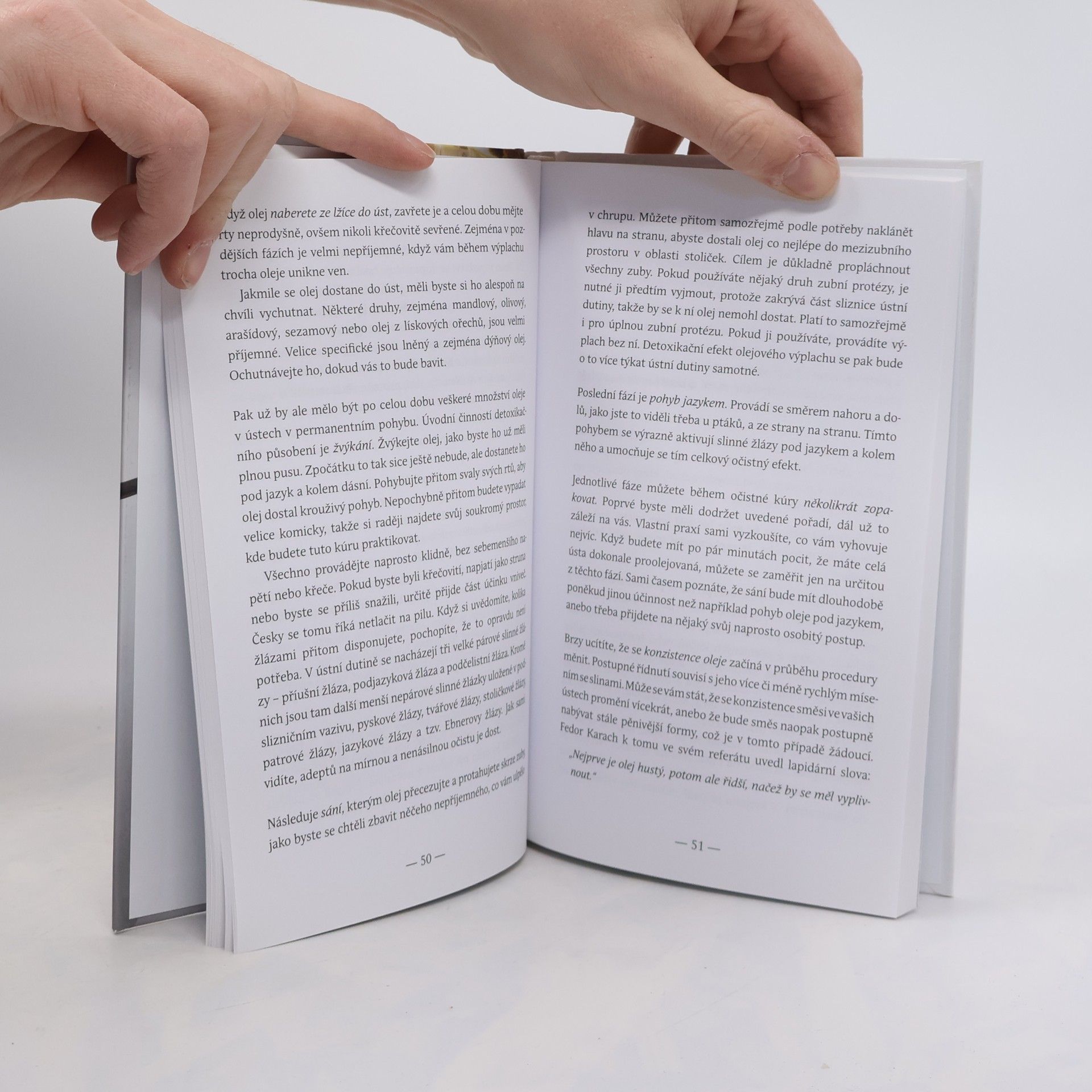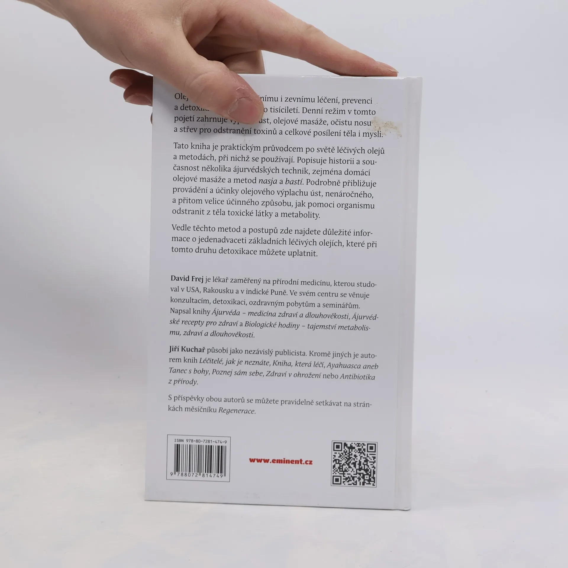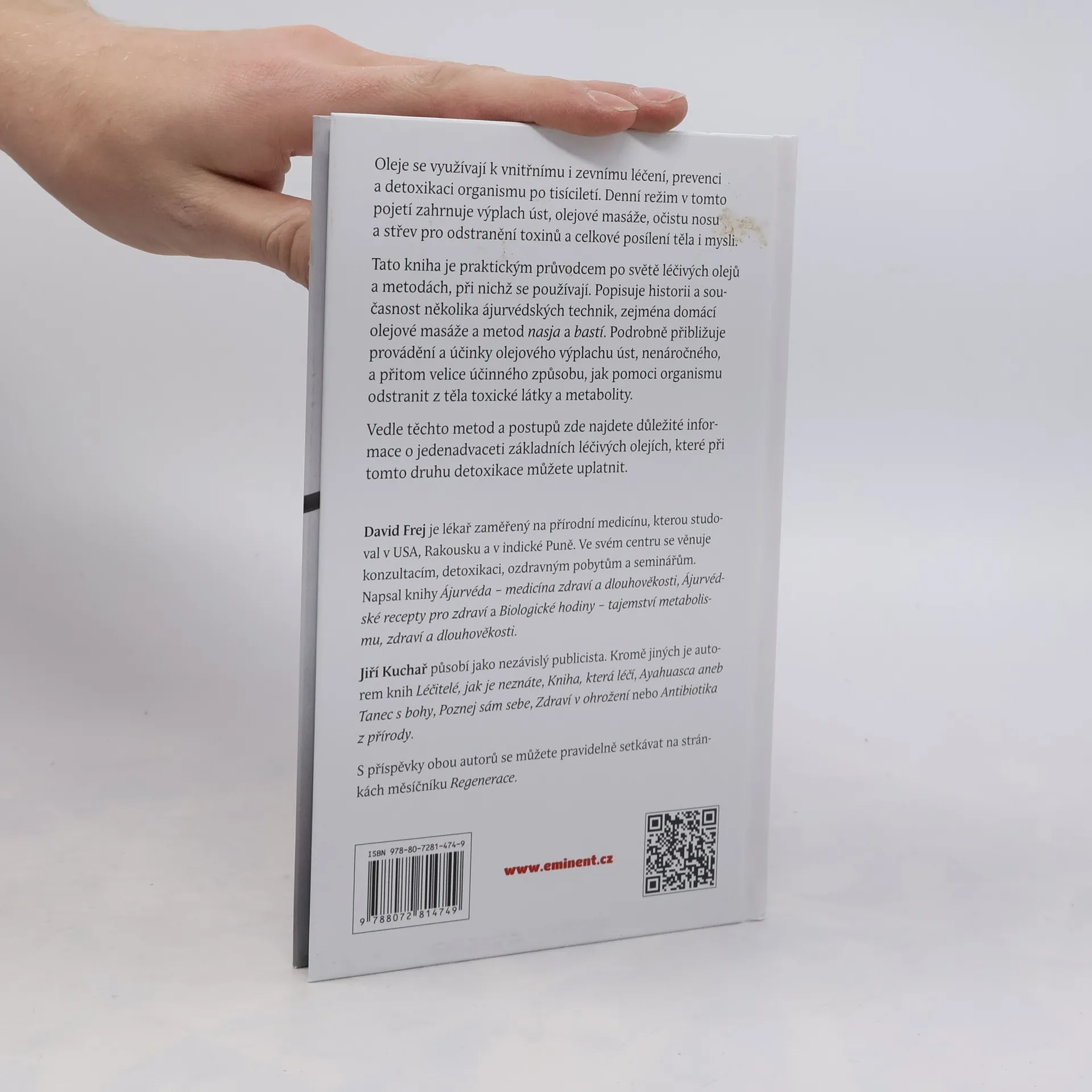 Oleje se využívají k vnitřnímu i zevnímu léčení, prevenci a detoxikaci organismu po tisíciletí. Denní režim v tomto pojetí zahrnuje výplach úst, olejové masáže, očistu nosu a střev pro odstranění toxinů a celkové posílení těla i mysli. Tato kniha je praktickým průvodcem po světě léčivých olejů a metodách, při nichž se používají. Popisuje historii a současnost několika ájurvédských technik, zejména domácí olejové masáže a metod nasja a bastí. Podrobně přibližuje provádění a účinky olejového výplachu úst, nenáročného, a přitom velice účinného způsobu, jak pomoci organismu odstranit z těla toxické látky a metabolity. Vedle těchto metod a postupů najdete v knize podrobné informace o jedenadvaceti základních léčivých olejích, které při tomto druhu detoxikace můžete uplatnit. David Frej je lékařem přírodní medicíny, kterou studoval v USA, Rakousku a v indické Puně. Ve svém centru se věnuje konzultacím, masážím, ozdravným pobytům a seminářům. Napsal knihy Ájurvéda – medicína zdraví a dlouhověkosti, Ájurvédské recepty pro zdraví a Biologické hodiny – tajemství metabolismu, zdraví a dlouhověkosti. Jiří Kuchař působí jako nezávislý publicista. Kromě jiných je autorem knih Léčitelé, jak je neznáte, Kniha, která léčí, Poznej sám sebe, Zdraví v ohrožení nebo Antibiotika z přírody. S příspěvky obou autorů se můžete pravidelně setkávat na stránkách měsíčníku Regenerace.