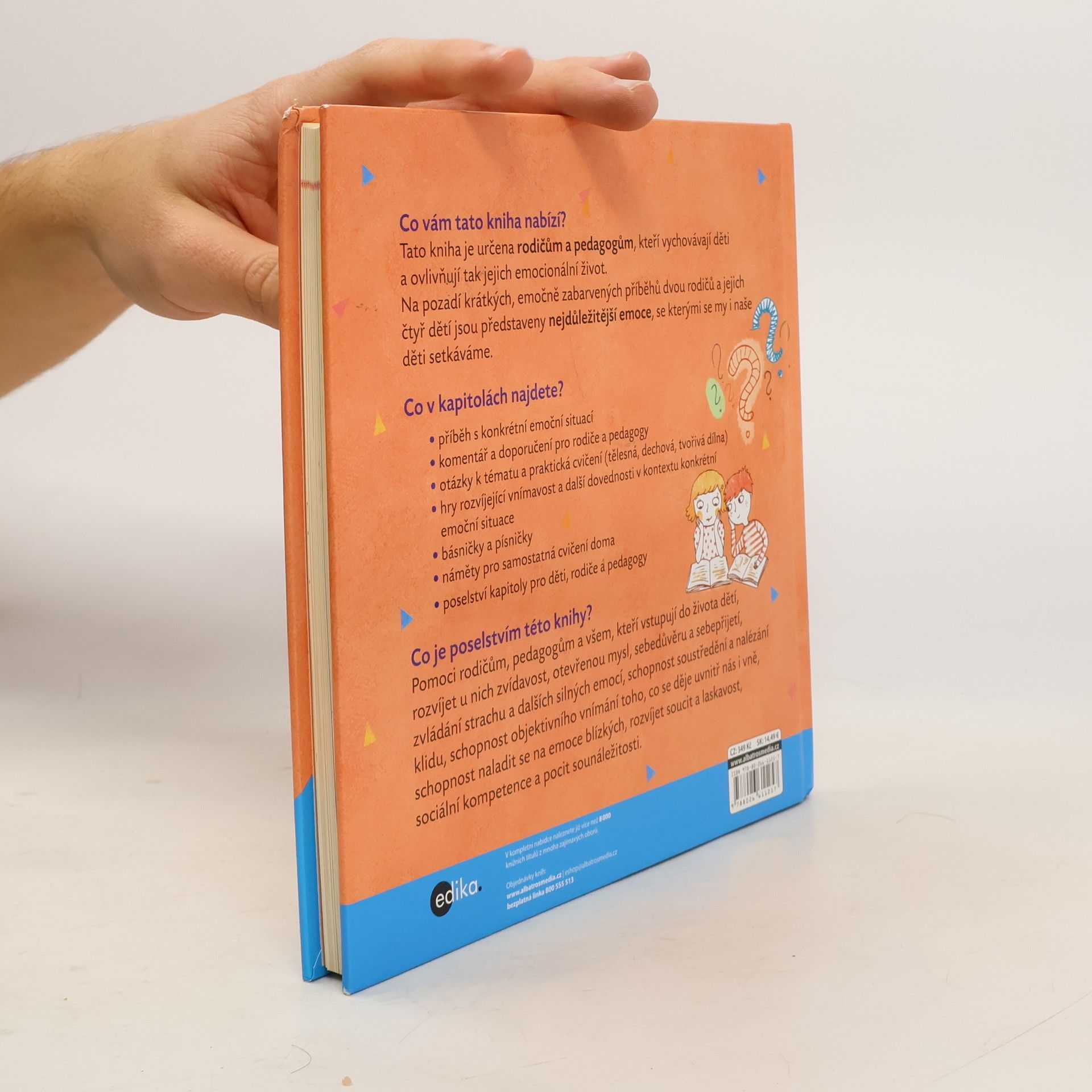 Učte děti vnímat a tvořivě pracovat s jejich vlastními pocity. Co vám tato kniha nabízí? Tato kniha je určena rodičům a pedagogům, kteří vychovávají děti a ovlivňují tak jejich emocionální život. Na pozadí krátkých, emočně zabarvených příběhů dvou rodičů a jejich čtyř dětí jsou představeny nejdůležitější emoce, se kterými se my i naše děti setkáváme. Co v kapitolách najdete? • příběh s konkrétní emoční situací • komentář a doporučení pro rodiče a pedagogy • otázky k tématu a praktická cvičení (tělesná, dechová, tvořivá dílna) • hry rozvíjející vnímavost a další dovednosti v kontextu konkrétní emoční situace • básničky a písničky • náměty pro samostatná cvičení doma • poselství kapitoly pro děti, rodiče a pedagogy Co je poselstvím této knihy? Pomoci rodičům, pedagogům a všem, kteří vstupují do života dětí, rozvíjet u nich zvídavost, otevřenou mysl, sebedůvěru a sebepřijetí, zvládání strachu a dalších silných emocí, schopnost soustředění a nalézání klidu, schopnost objektivního vnímání toho, co se děje uvnitř nás i vně, schopnost naladit se na emoce blízkých, rozvíjet soucit a laskavost, sociální kompetence a pocit sounáležitosti.
