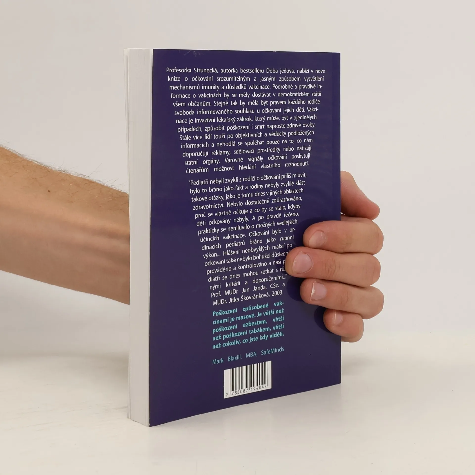 Profesorka Strunecká, autorka bestselleru Doba jedová, nabízí v nové knize o očkování srozumitelným a jasným způsobem vysvětlení mechanismů imunity a důsledků vakcinace. Podrobné a pravdivé informace o vakcínách by měly být přístupné v demokratickém státu všem občanům. Stejně tak by měla být právem každého rodiče svoboda informovaného souhlasu u očkování jejich dětí. Vakcinace je invazivní lékařský zákrok, který může, byť v ojedinělých případech, způsobit poškození i smrt docela zdravé osoby. Stále více lidí touží po objektivních a vědecky podložených informacích a nehodlá se spoléhat pouze na to, co nám doporučují reklamy, sdělovací prostředky nebo nařizují státní orgány. Podobná kniha na českém knižním trhu dosud chybí. Čtenáři zde najdou i rady rodičům k očkování od praktické lékařky a legislativní část zpracovanou právníkem podle posledních úprav zákona o veřejném zdraví.