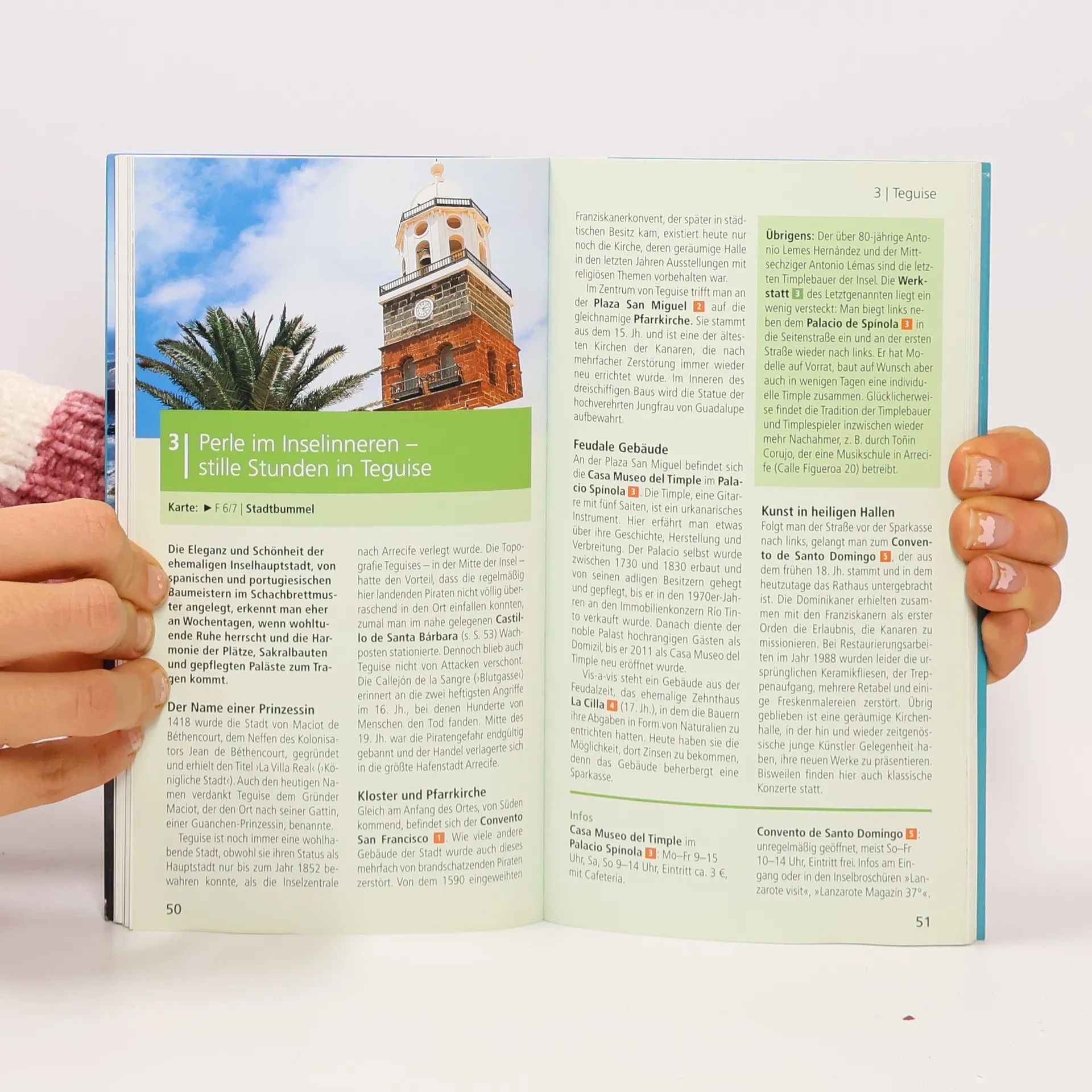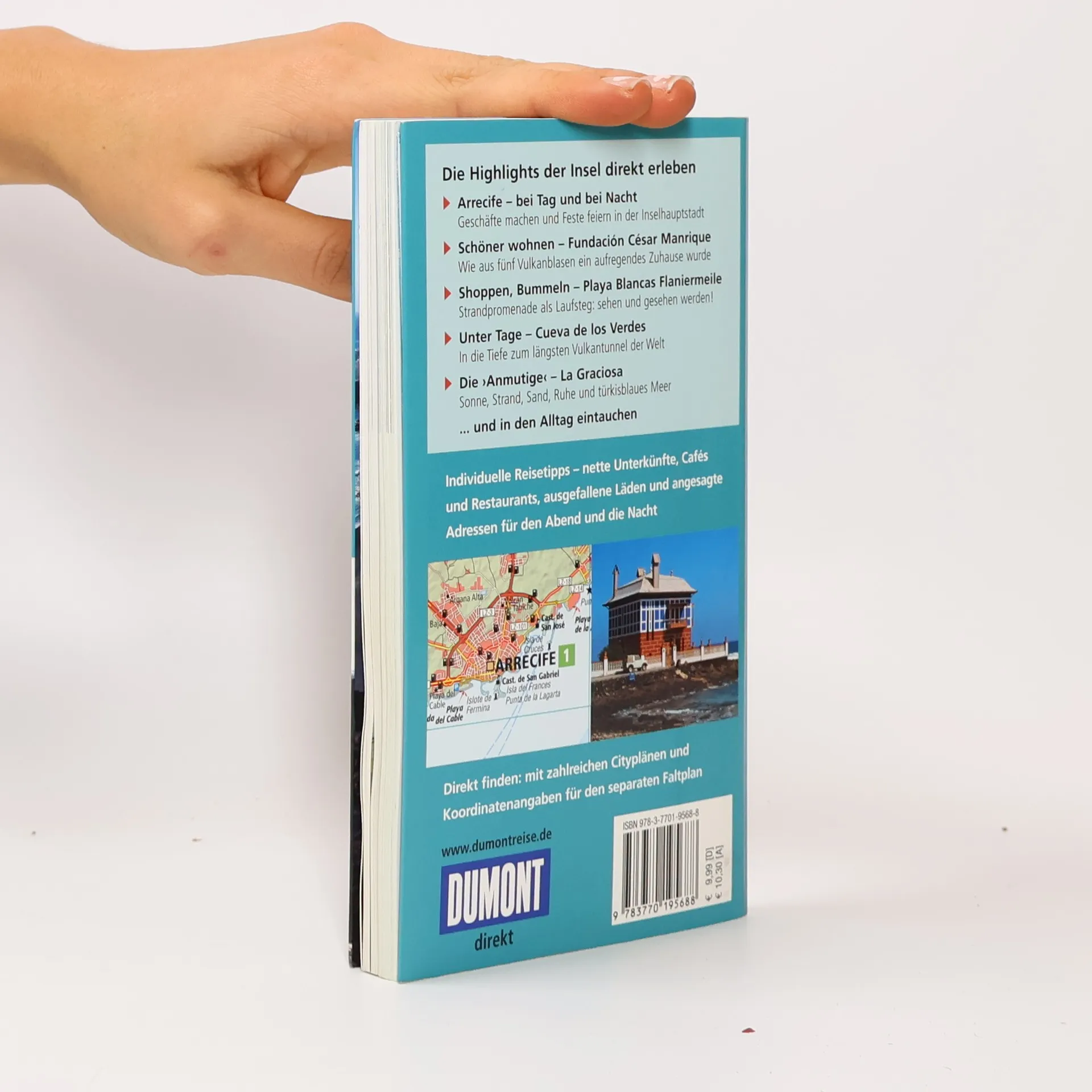 Es ist ein ganz eigener Reiz, der von der „schwarzen Perle der Kanaren“ ausgeht - das Gefühl, sich auf einem schlafenden Vulkan zu bewegen, auf einem Meisterwerk der Elemente, umgeben vom tiefblauen Atlantik. Wer einmal Lanzarotes Strände in all ihren Farben und Formen erkundet oder die Geheimnisse der Feuerberge entdeckt hat, wer die quirlige Metropole Arrecife durchstreift hat oder in Orzala zum Fischessen war, der ist von der Urtümlichkeit der Insel mit Sicherheit begeistert. Mit den Tipps der Lanzarote-Expertin Verónica Reisenegger wird man sie per Stadtbummel, Wanderung oder mit dem Rad aus besonderen Blickwinkeln kennenlernen: Inselhauptstadt Arrecife; die Inselarchitektur in der Fundación César Manrique; ehemalige Inselhauptstadt Teguise; kanarischer Ringkampf in Tinajo und Tao; von Puerto del Carmen nach Arrecife; die Weinlandschaft La Geria; Flaniermeile Playa Blancas; die Playas del Papagayo; die Schwesterinsel Fuerteventura; die Küste entlang bis El Golfo; im Nationalpark Timanfaya; Lavakanal Cueva de los Verdes und Parklandschaft Jameos del Agua; Krater Monte Corona; Insel La Graciosa; ehemaliger Kanonenstützpunkt Mirador del Río. Handverlesene Adressen für alle wichtigen Orte, zu Übernachten, Essen und Trinken sowie Einkaufen und Ausgehen, lassen die Reise zum Erlebnis werden. Jede Adresse ist mit einem Schlagwort versehen - das erleichtert die schnelle Orientierung. Im großen separaten Faltplan (Maßstab 1:135.000) mit Ortsregister und Entfernungstabelle sind alle im Buch genannten Orte eingetragen und anhand der Verweise im Text einfach zu finden; außerdem zeigt er eine Gesamtkarte der Kanarischen Inseln und Fuerteventura. Die Übersichtskarte hebt alle Highlights hervor. Stadt- und Detailpläne im Buch erlauben die präzise Orientierung in Arrecife, Teguise, Puerto del Carmen und in allen in den 15 'Direkt-Kapiteln' beschriebenen Orten.