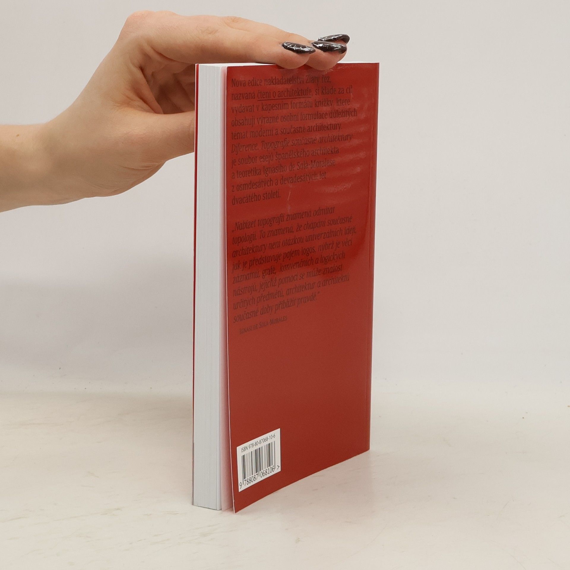 Nová edice nakladatelství Zlatý řez, nazvaná čtení o architektuře, si klade za cíl vydávat v kapesním formátu knížky, které obsahují výrazné osobní formulace důležitých témat moderní a současné architektury. Diference. Topografie současné architektury je soubor esejů španělského architekta a teoretika Ignasiho de Sola-Moralese z osmdesátých a devadesátých let dvacátého století.