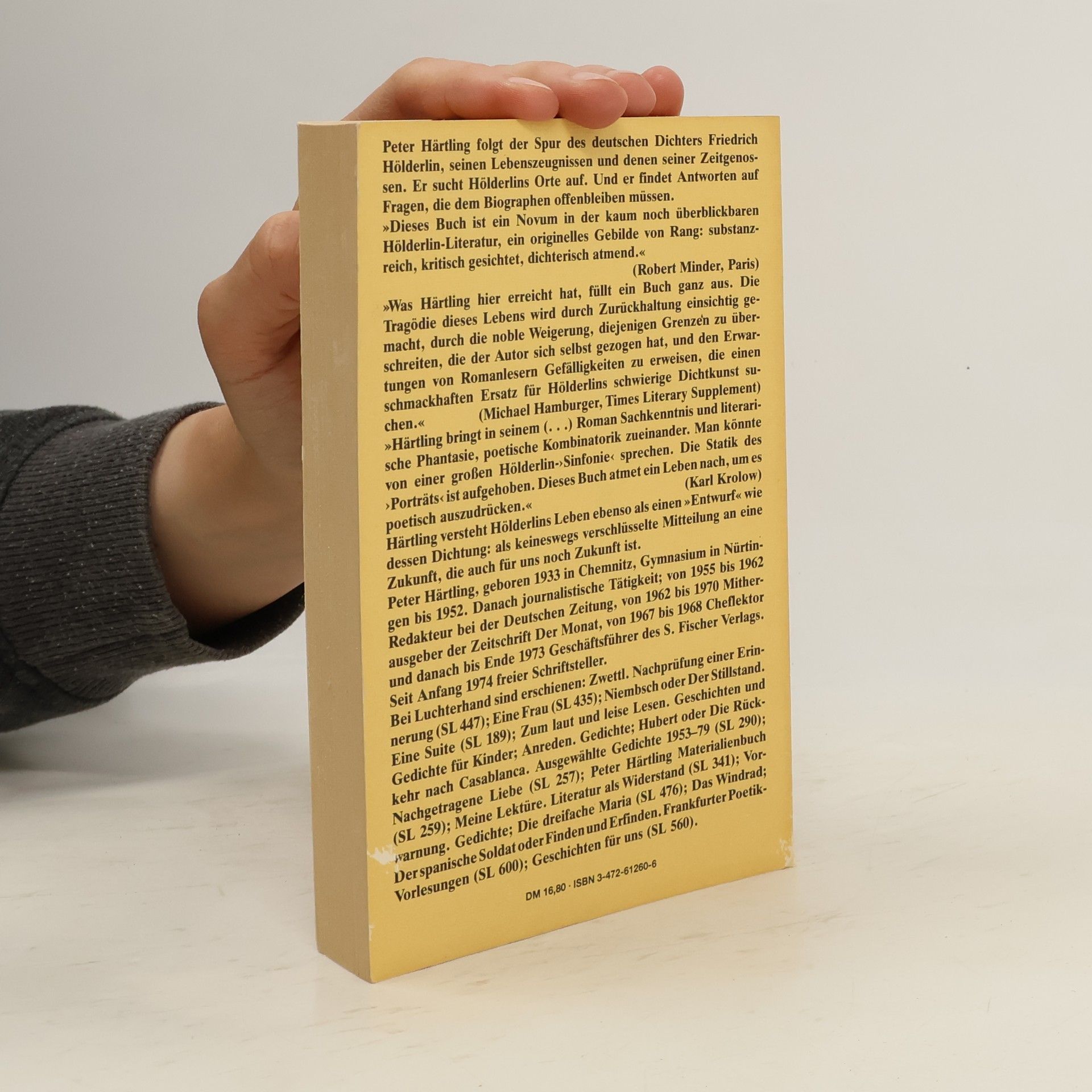 Der vor zwanzig Jahren zum ersten Mal erschienene Roman "Hölderlin" von Peter Härtling markiert einen Wendepunkt im Werk des Autors. Der Roman wurde zu einem Vorbild für die literarisch-biographische Erforschung eines Künstlerlebens, das in seinen menschlichen und geschichtlichen Spannungen von ungeahnter Aktualität geblieben ist. Mit Sachkenntnis und Sensibilität, literaischer Phantasie und Einfühlungsvermögen gelingt es Härtling, Friedrich Hölderlin als Mensch und Poet zu beschreiben, sein Leben und seine Zeit so zu entwerfen, daß sie für uns lebendig werden. Dabei vermag es Härtling, den politisch bewegten Hölderlin, aber auch den liebenden neu und differenziert zu beschreiben. Der Roman ist jedoch nicht nur eine inzwischen berühmt gewordene Version von Hölderlins Leben, so wie es gewesen sein könnte, er ist auch ein Novum in der Art, wie Härtling seinen eigenen Arbeitsprozeß und seine Beziehung zu Hölderlin, seinem Werk und der Landschaft, aus der er schöpft, in den Roman integriert hat.