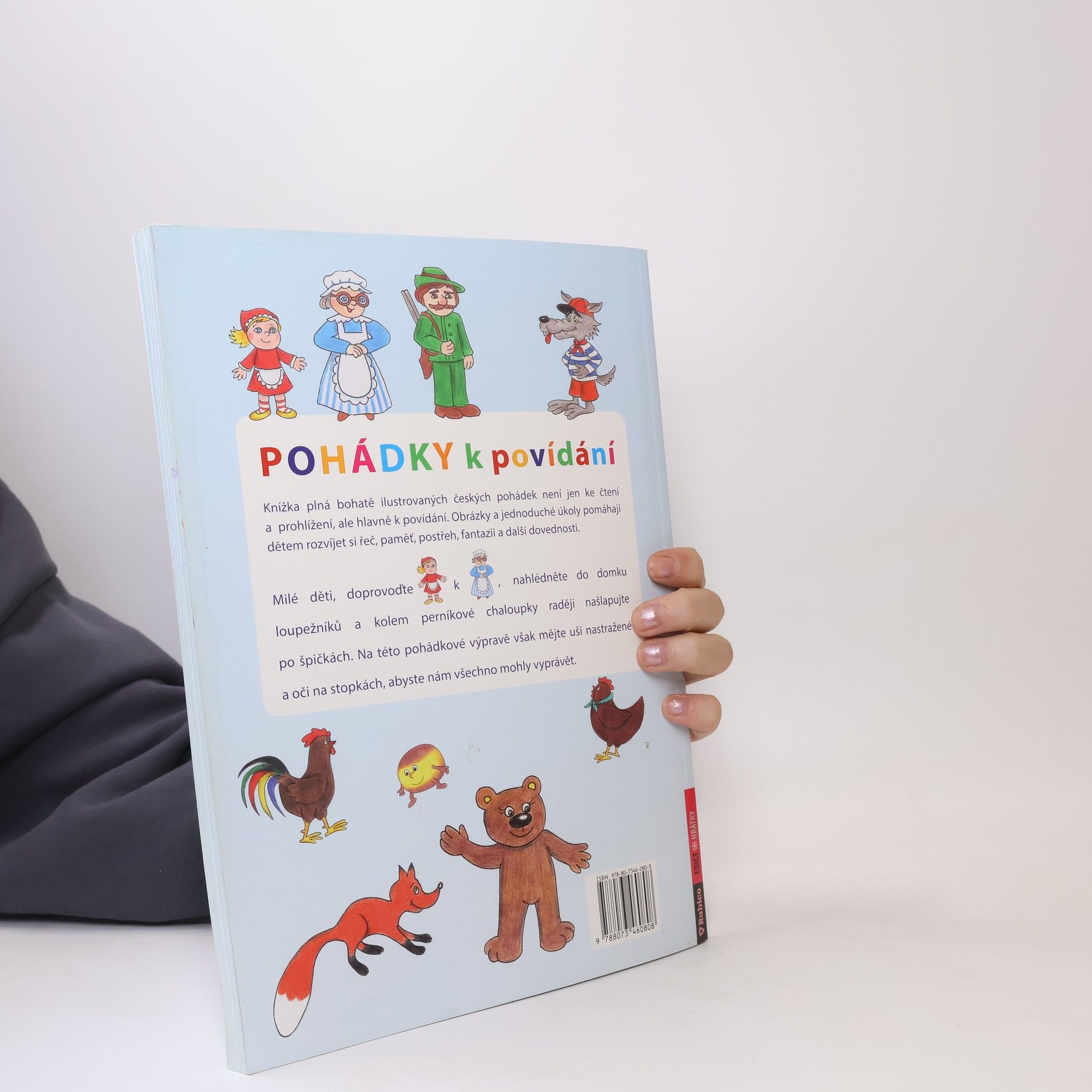 Knížka plná bohatě ilustrovaných českých pohádek není jen ke čtení a prohlížení, ale hlavně k povídání. Obrázky a jednoduché úkoly pomáhají dětem rozvíjet si řeč, paměť, postřeh, fantazii a další dovednosti. Milé děti, doprovoďte Červenou Karkulku k babičce, nahlédněte do domku loupežníků a kolem perníkové chaloupky raději našlapujte po špičkách. Na této pohádkové výpravě však mějte uši nastražené a oči na stopkách, abyste nám všechno mohly vyprávět.