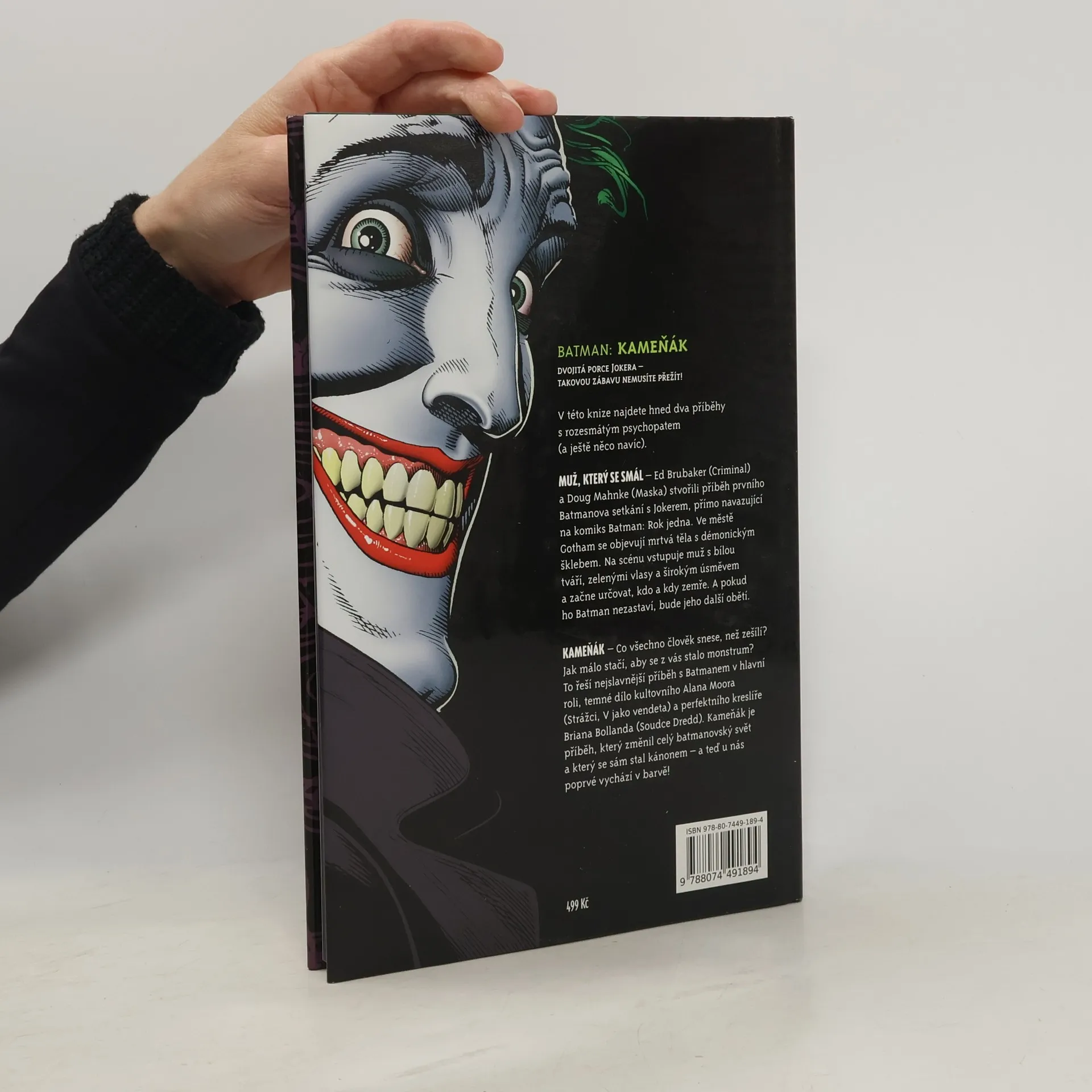 Muž, který se smál – Ed Brubaker (Criminal) a Doug Mahnke (Maska) stvořili příběh prvního Batmanova setkání s Jokerem, přímo navazující na komiks Batman: Rok jedna. V městě Gotham se začínají objevovat mrtvá těla s démonickým úsměvem. Na scénu vstupuje muž s bílou tváří, zelenými vlasy a širokým úsměvem a začne určovat, kdo a kdy zemře. A pokud ho Batman nezastaví, bude jeho další obětí. Kameňák – Co všechno člověk snese, než zešílí? Jak málo stačí, aby se z vás stalo monstrum? To řeší ten nejslavnější příběh s Batmanem v hlavní roli, temné dílo kultovního Alana Moora (Strážci, V jako vendeta) a perfektního kreslíře Briana Bollanda. Kameňák je příběh, který změnil celý batmanovský svět a který se sám stal kánonem – a teď u nás poprvé vychází v barvě! Dotisk knihy se stejným isbn vyšel v roce 2016.