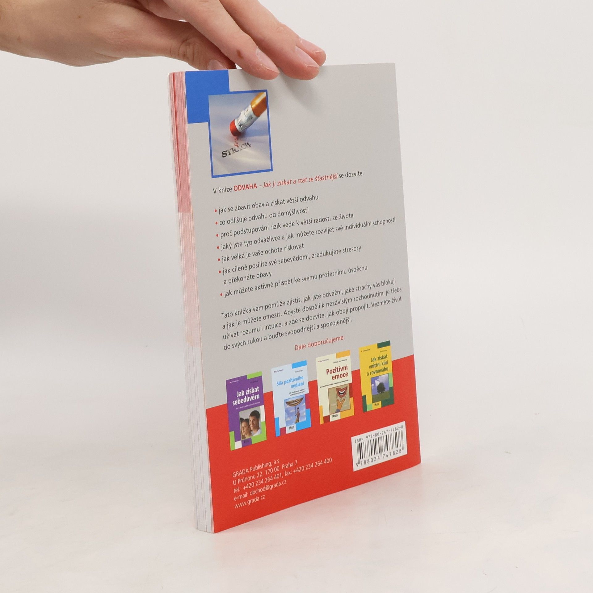 V knize se dozvíte: - jak získat větší odvahu, zbavit se obav a více si užívat života, - co odlišuje odvahu od domýšlivosti, - proč by podstupování rizik mělo vést ke zvýšení kvality života - co mají riziko a radost ze života společného, - jaký jste typ odvážlivce a jak můžete rozvíjet své individuální schopnosti, - jak velká je vaše ochota riskovat, - jak cíleně posilovat své sebevědomí, zredukovat stresory a překonat obavy, - jak můžete aktivně přispět ke svému profesnímu úspěchu a dokázat se odvážně rozhodnout, - jak vaše myšlenky ovlivňuje váš pohled na svět a jak ho můžete využít k větší zodpovědnosti za sebe sama. Tato knížka vám pomůže zjistit, jak jste odvážní, jaké strachy vás blokují a jak je můžete omezit. Dozvíte se, jak posilovat svou sebedůvěru, jak získat odhodlanost k dosažení cílů, které jsou pro vás důležité, a jak s odvahou překonávat překážky a řešit problémy. Abyste dospěli k nezávislým rozhodnutím, je třeba užívat rozumu i intuice, a tato knížka vám ukáže, jak obojí propojit. Jak si stanovit konkrétní cíle, jak věci správně naplánovat a překonat vnitřní překážky při cestě k nim. Vezměte život do svých rukou a buďte svobodnější a spokojenější.