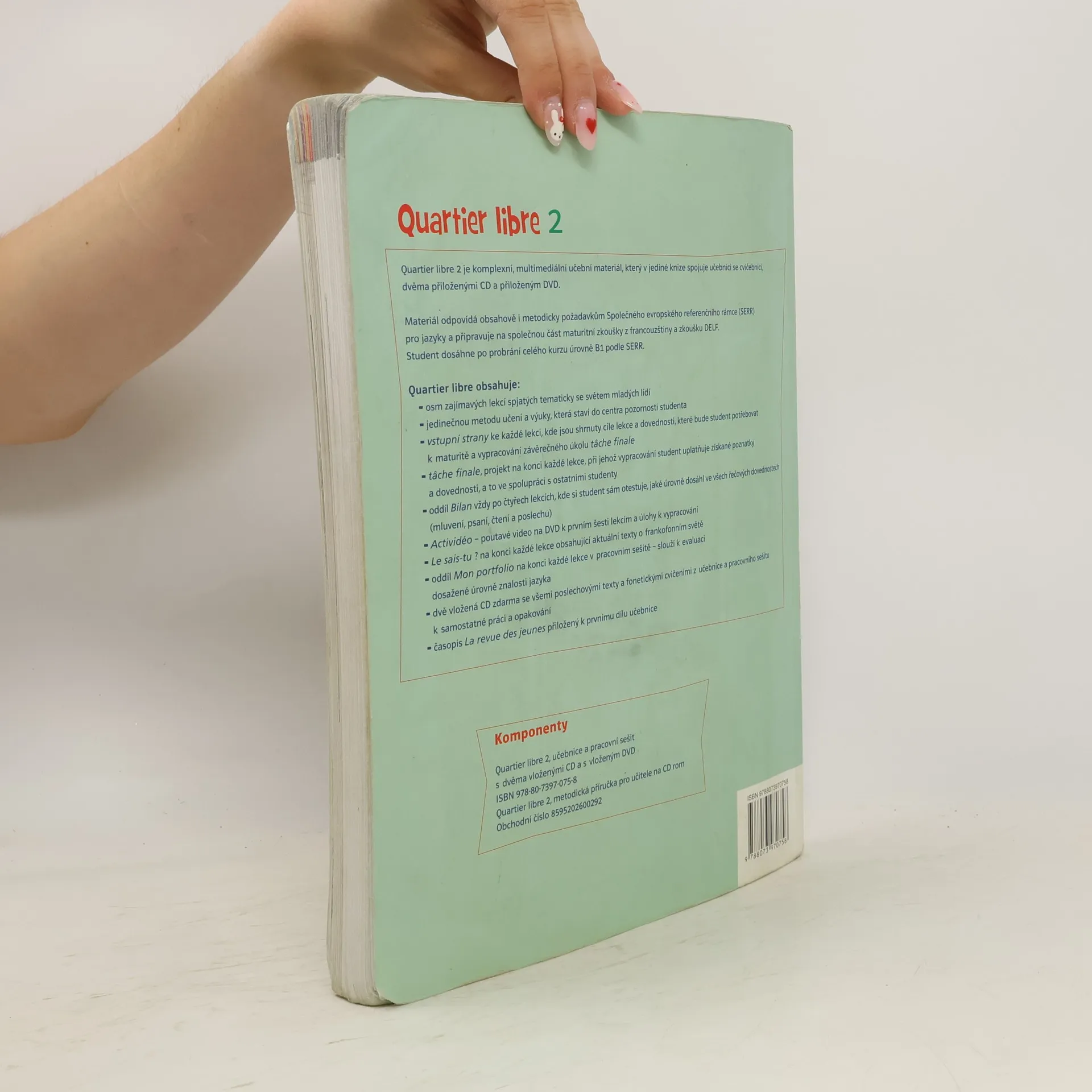 QuartierLibre je komplexní multimediální učební materiál, který spojuje učebnici, cvičebnici a přiložená média. Odpovídá požadavkům Společného evropského referenčního rámce (SERR) a připravuje na maturitní zkoušku z francouzštiny a zkoušku DELF. První díl pokrývá úrovně A2 a B1 a je určen pro dvouleté studium s 2-3 hodinami týdně. Obsahuje šest tematických lekcí zaměřených na mladé lidi, jedinečné metody učení a multimediální prostředí. Učebnice zajišťuje rovnoměrný rozvoj všech jazykových dovedností a cílenou přípravu na zkoušky. Každá lekce začíná komunikačním úkolem (tachefinale) a shrnutím osnov. Rubrika Lesais-tu? obsahuje autentické texty a aktuální informace o frankofonním světě. Tachefinale umožňuje studentům procvičit všechny znalosti prostřednictvím komplexního úkolu. Po třech lekcích následuje sebehodnocení (Bilan), aby studenti zhodnotili svůj pokrok. Učebnice obsahuje slovíčka, mapy a pracovní sešit s různorodými cvičeními. Na závěr každé lekce je stránka Connecte-toi!, která umožňuje bezpečné surfování po internetu. Oddíl Mon Portfolio a Autoévaluation pomáhá studentům reflektovat své jazykové dovednosti a proces učení.