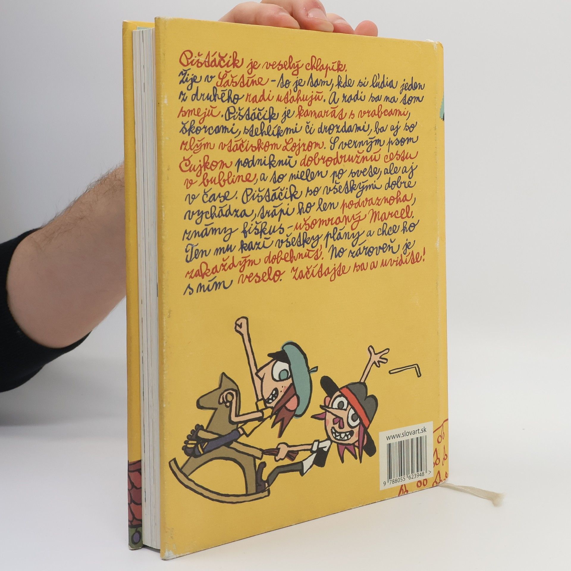Pištáčik je veselý chlapík. Žije v Šaštíne – to je tam, kde si ľudia jeden z druhého radi uťahujú a radi sa na tom smejú. Pištáčik je kamarát s vrabcami, so škorcami, stehlíkmi či s drozdami, ba aj so zlým vtáčiskom Lojzom; prilietajú do jeho záhrady, kde ich čaká čerešňa so známou reštauráciou pre všetky vtáky. Okrem nich má ešte jedného kamaráta – verného psa Čujka a veľa známych. So všetkými dobre vychádza, trápi ho len podvaznoha, známy fiškus – ušomraný Marcel. Ten mu kazí všetky plány. No zároveň je s ním veselo. Chce vždy Pištáčika dobehnúť, ešte radšej predbehnúť, v jednej chvíli sa mu dokonca chystá vyfúknuť nevestu, ktorá sa mu zjavila na konci nosa. To snáď nie! Skúste sa začítať – či to dobre dopadne.