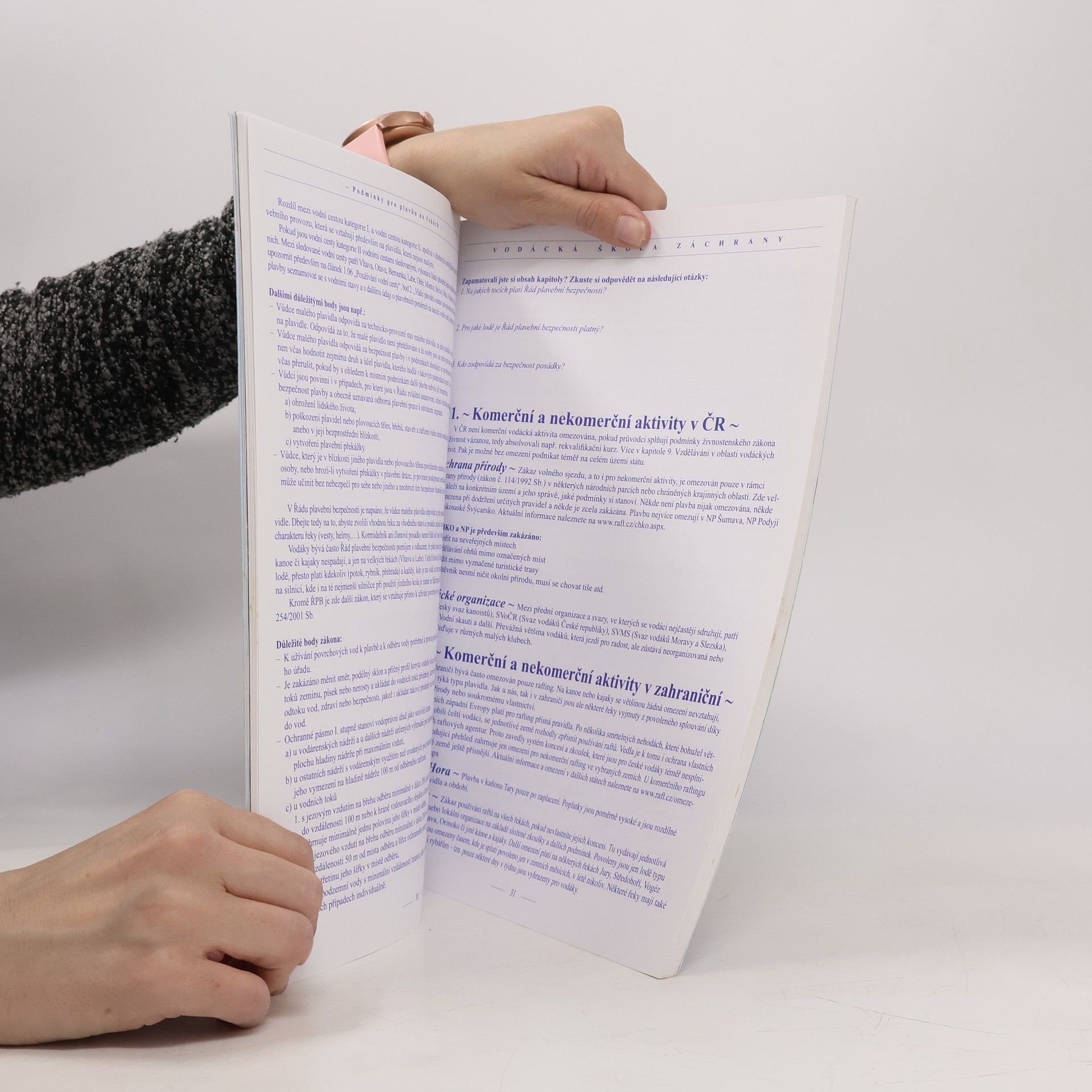 Vodácká příručka pro začátečníky i pokročilé. Mezi hlavní témata patří kromě vybavení také záchranné prostředky, sebezáchrana, záchrana ostatních i materiálu a to pomocí různých typů plavidel nebo prostředků, první pomoc, uzlování, rozpoznání nebezpečného jezu, výběr vhodné řeky, skupinový sjezd a mnoho dalších kapitol a praktických rad. Mezi úplné novinky patří i kapitola psychologie pro vedoucí, stres a stresové situace. Jednotlivé kapitoly jsou doplňovány skutečnými příběhy, aby si čtenář mohl uvědomit rizika vyplývající z podcenění některých situací.